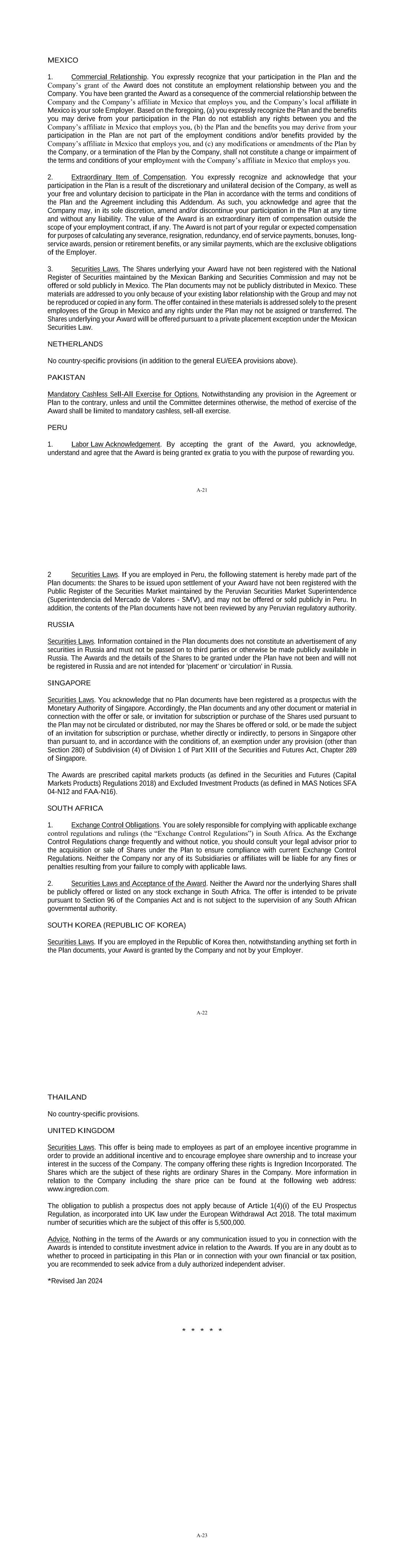 A-17 ARGENTINA 1. Securities Laws. Your Award is being offered to you solely in your capacity as an employee of the Company and is not aimed at the general public. By receiving and accepting your Award, you are deemed to (i) acknowledge that the Company has not made, and will not make, any application to obtain an authorization from the Argentinian Securities and Exchange Commission (Comisión Nacional de Valores) for the public offering of the Awards or underlying Shares in Argentina nor has it taken any action that would permit a public offering of the underlying Awards or Shares in Argentina within the meaning of Argentine Capital Markets Law No. 26,831 (as amended), the Argentine Securities and Exchange Commission General Resolution No. 622/2013 (as amended and supplemented) and ancillary regulations; (ii) acknowledge that the Argentinian Securities and Exchange Commission has not approved the offering of the Awards or the underlying Shares nor any document relating to the offering; and (iii) agree that you will not sell or offer to sell the Awards or any Shares acquired upon settlement of your award in Argentina other than pursuant to transactions that would not qualify as a public offering under Section 2 of Argentine Law No. 26,831 (as amended). Further, receipt and acceptance of the Plan documents shall constitute your agreement that the information contained in the Plan documents may not be (i) reproduced or used, in whole or in part, for any purpose whatsoever other than as a representation of your holding Awards or Shares, as applicable or (ii) furnished to or discussed with any person without the prior written permission from the Company. 2. Labor Law. Please be advised that your participation in the Plan is entirely voluntary. The Company does not guarantee any benefit or gain in connection with the Awards offered under the Plan. Furthermore, the benefits that could eventually arise from the Plan do not constitute a granted right for the future and may be amended, modified or terminated at any time. Legal, tax and accounting advice should be asked if needed, to completely understand the Plan effects and consequences. 3. Data Privacy. The Access to Public Information Agency, as the enforcing authority of Act 25.326, has the power to attend to the reports and claims from those whose rights are affected as a consequence of non-fulfilment of data protection provisions. (La Agencia de Acceso a la Información Pública, en su carácter de Órgano de Control de la Ley Nº 25.326, tiene la atribución de atender las denuncias y reclamos que interpongan quienes resulten afectados en sus derechos por incumplimiento de las normas vigentes en materia de protección de datos personales.) AUSTRALIA 1. Shareholder Approval Requirement. Notwithstanding any provision in the Award Agreement to the contrary, you will not be entitled to, and shall not claim, any benefit under the Plan if the provision of such benefit would give rise to a breach of Part 2D.2 of the Corporations Act 2001 (Cth), any other provision of that act, or any other applicable statute, rule or regulation which limits or restricts the giving of such benefits. Further, the Company's affiliate in Australia is under no obligation to seek or obtain the approval of its shareholders for the purpose of overcoming any such limitation or restriction. 2. New Division. The offer to participate in the Plan is made in reliance of Division 1A of Part 7.12 of the Corporations Act 2001 (Cth). 3. Tax Notification. The Plan is a plan to which Subdivision 83A-C of the Income Tax Assessment Act 1997 (Cth) applies (subject to conditions in the act). A-18 4. Advice. Any advice given by the Company or any of its associated bodies corporate, in relation to Awards under the Plan does not take into account your objectives, financial situation or needs. This document does not constitute investment advice and does not constitute financial product advice as defined in the Corporations Act 2001 (Cth) and the Company makes no recommendation about whether you should participate in this offer. You should consider obtaining your own financial product advice from a suitably qualified and licensed financial, taxation or other professional adviser regarding your participation in the Plan based on your own personal circumstances. 5. Information. The Company undertakes, on request, at no charge and within a reasonable time, to provide you with a full copy of the rules of the Plan. 6. Share Price. As the Company’s Shares are listed on the New York Stock Exchange, the market price of ordinary Shares in the Company can be ascertained by visiting the website of the New York Stock Exchange (https://www.nyse.com/index) and the Australian dollar equivalent of that price by applying the prevailing USD/AUD exchange rate published by the Reserve Bank of Australia, which is accessible at the following link: http://www.rba.gov.au/statistics/frequency/exchange-rates.html. 7. Risk Warning. There is a risk that Shares, or their cash equivalent, awarded to you under the Plan may fall as well as rise in value through movement of equity markets. Market forces will impact the price of Shares awarded to you, and at their worst, market values of the Shares awarded to you may become zero if adverse market conditions are encountered. As the price of the Shares awarded to you is quoted in USD, the value of those Shares, or their cash equivalent, to you may also be affected by movements in foreign currency exchange rates. 8. Data Protection. If you participate in the Plan: You consent to Ingredion ANZ Pty Ltd., any of its related bodies corporate or any third-party, collecting the personal information (including sensitive information) necessary to administer the Plan and disclosing any personal information necessary to administer the Plan to that the Company, any of its related bodies corporate or any third-party engaged to assist in implementing the Plan, who may be situated in or ou