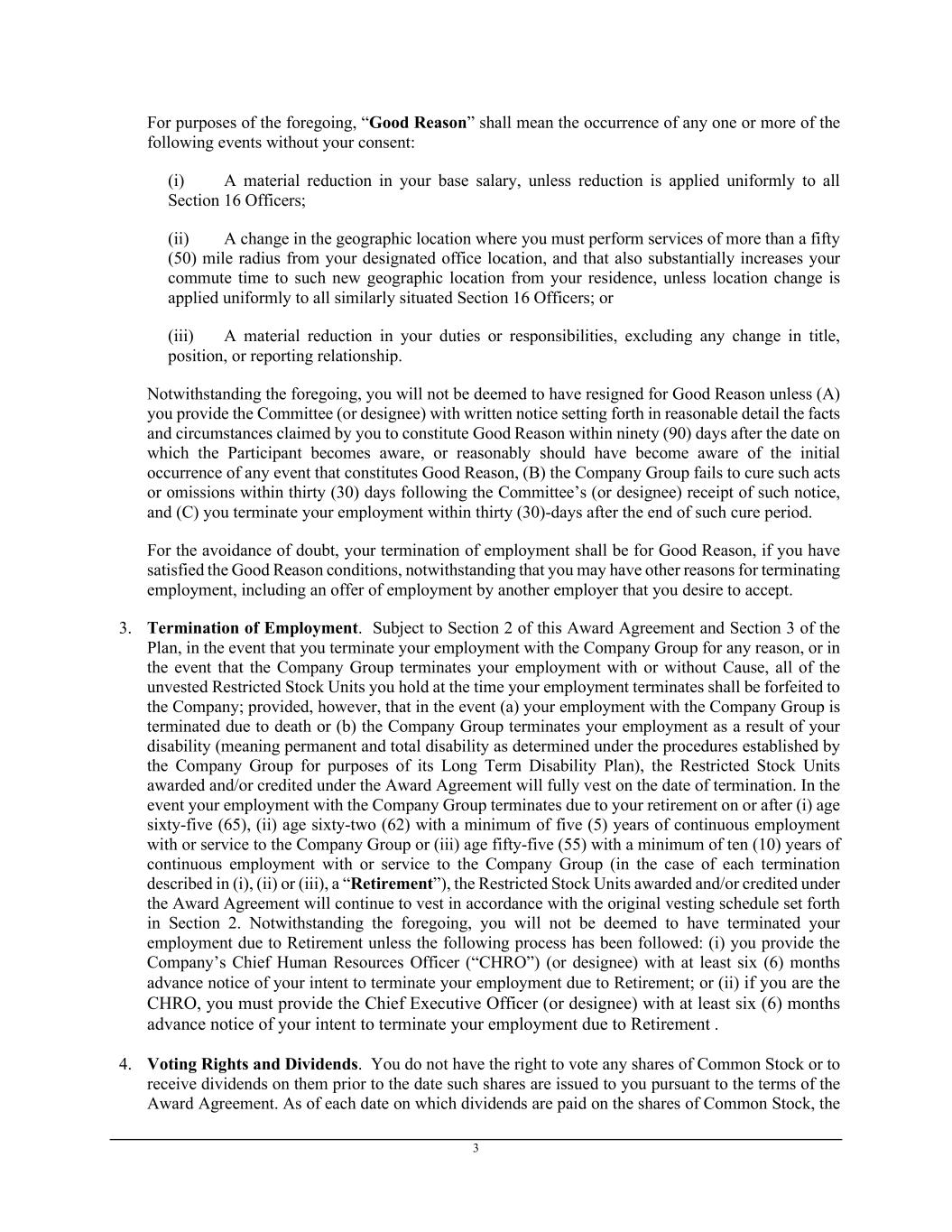 3 For purposes of the foregoing, “Good Reason” shall mean the occurrence of any one or more of the following events without your consent: (i) A material reduction in your base salary, unless reduction is applied uniformly to all Section 16 Officers; (ii) A change in the geographic location where you must perform services of more than a fifty (50) mile radius from your designated office location, and that also substantially increases your commute time to such new geographic location from your residence, unless location change is applied uniformly to all similarly situated Section 16 Officers; or (iii) A material reduction in your duties or responsibilities, excluding any change in title, position, or reporting relationship. Notwithstanding the foregoing, you will not be deemed to have resigned for Good Reason unless (A) you provide the Committee (or designee) with written notice setting forth in reasonable detail the facts and circumstances claimed by you to constitute Good Reason within ninety (90) days after the date on which the Participant becomes aware, or reasonably should have become aware of the initial occurrence of any event that constitutes Good Reason, (B) the Company Group fails to cure such acts or omissions within thirty (30) days following the Committee’s (or designee) receipt of such notice, and (C) you terminate your employment within thirty (30)-days after the end of such cure period. For the avoidance of doubt, your termination of employment shall be for Good Reason, if you have satisfied the Good Reason conditions, notwithstanding that you may have other reasons for terminating employment, including an offer of employment by another employer that you desire to accept. 3. Termination of Employment. Subject to Section 2 of this Award Agreement and Section 3 of the Plan, in the event that you terminate your employment with the Company Group for any reason, or in the event that the Company Group terminates your employment with or without Cause, all of the unvested Restricted Stock Units you hold at the time your employment terminates shall be forfeited to the Company; provided, however, that in the event (a) your employment with the Company Group is terminated due to death or (b) the Company Group terminates your employment as a result of your disability (meaning permanent and total disability as determined under the procedures established by the Company Group for purposes of its Long Term Disability Plan), the Restricted Stock Units awarded and/or credited under the Award Agreement will fully vest on the date of termination. In the event your employment with the Company Group terminates due to your retirement on or after (i) age sixty-five (65), (ii) age sixty-two (62) with a minimum of five (5) years of continuous employment with or service to the Company Group or (iii) age fifty-five (55) with a minimum of ten (10) years of continuous employment with or service to the Company Group (in the case of each termination described in (i), (ii) or (iii), a “Retirement”), the Restricted Stock Units awarded and/or credited under the Award Agreement will continue to vest in accordance with the original vesting schedule set forth in Section 2. Notwithstanding the foregoing, you will not be deemed to have terminated your employment due to Retirement unless the following process has been followed: (i) you provide the Company’s Chief Human Resources Officer (“CHRO”) (or designee) with at least six (6) months advance notice of your intent to terminate your employment due to Retirement; or (ii) if you are the CHRO, you must provide the Chief Executive Officer (or designee) with at least six (6) months advance notice of your intent to terminate your employment due to Retirement . 4. Voting Rights and Dividends. You do not have the right to vote any shares of Common Stock or to receive dividends on them prior to the date such shares are issued to you pursuant to the terms of the Award Agreement. As of each date on which dividends are paid on the shares of Common Stock, the