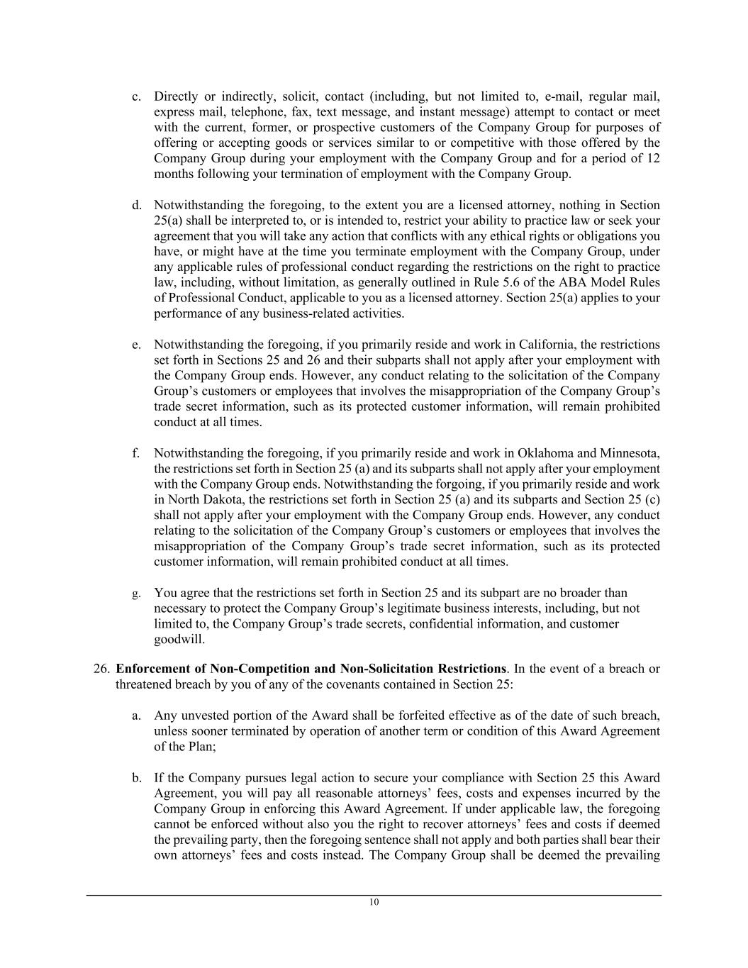 10 c. Directly or indirectly, solicit, contact (including, but not limited to, e-mail, regular mail, express mail, telephone, fax, text message, and instant message) attempt to contact or meet with the current, former, or prospective customers of the Company Group for purposes of offering or accepting goods or services similar to or competitive with those offered by the Company Group during your employment with the Company Group and for a period of 12 months following your termination of employment with the Company Group. d. Notwithstanding the foregoing, to the extent you are a licensed attorney, nothing in Section 25(a) shall be interpreted to, or is intended to, restrict your ability to practice law or seek your agreement that you will take any action that conflicts with any ethical rights or obligations you have, or might have at the time you terminate employment with the Company Group, under any applicable rules of professional conduct regarding the restrictions on the right to practice law, including, without limitation, as generally outlined in Rule 5.6 of the ABA Model Rules of Professional Conduct, applicable to you as a licensed attorney. Section 25(a) applies to your performance of any business-related activities. e. Notwithstanding the foregoing, if you primarily reside and work in California, the restrictions set forth in Sections 25 and 26 and their subparts shall not apply after your employment with the Company Group ends. However, any conduct relating to the solicitation of the Company Group’s customers or employees that involves the misappropriation of the Company Group’s trade secret information, such as its protected customer information, will remain prohibited conduct at all times. f. Notwithstanding the foregoing, if you primarily reside and work in Oklahoma and Minnesota, the restrictions set forth in Section 25 (a) and its subparts shall not apply after your employment with the Company Group ends. Notwithstanding the forgoing, if you primarily reside and work in North Dakota, the restrictions set forth in Section 25 (a) and its subparts and Section 25 (c) shall not apply after your employment with the Company Group ends. However, any conduct relating to the solicitation of the Company Group’s customers or employees that involves the misappropriation of the Company Group’s trade secret information, such as its protected customer information, will remain prohibited conduct at all times. g. You agree that the restrictions set forth in Section 25 and its subpart are no broader than necessary to protect the Company Group’s legitimate business interests, including, but not limited to, the Company Group’s trade secrets, confidential information, and customer goodwill. 26. Enforcement of Non-Competition and Non-Solicitation Restrictions. In the event of a breach or threatened breach by you of any of the covenants contained in Section 25: a. Any unvested portion of the Award shall be forfeited effective as of the date of such breach, unless sooner terminated by operation of another term or condition of this Award Agreement of the Plan; b. If the Company pursues legal action to secure your compliance with Section 25 this Award Agreement, you will pay all reasonable attorneys’ fees, costs and expenses incurred by the Company Group in enforcing this Award Agreement. If under applicable law, the foregoing cannot be enforced without also you the right to recover attorneys’ fees and costs if deemed the prevailing party, then the foregoing sentence shall not apply and both parties shall bear their own attorneys’ fees and costs instead. The Company Group shall be deemed the prevailing