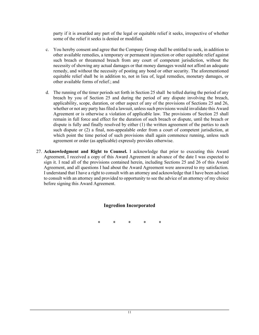 11 party if it is awarded any part of the legal or equitable relief it seeks, irrespective of whether some of the relief it seeks is denied or modified. c. You hereby consent and agree that the Company Group shall be entitled to seek, in addition to other available remedies, a temporary or permanent injunction or other equitable relief against such breach or threatened breach from any court of competent jurisdiction, without the necessity of showing any actual damages or that money damages would not afford an adequate remedy, and without the necessity of posting any bond or other security. The aforementioned equitable relief shall be in addition to, not in lieu of, legal remedies, monetary damages, or other available forms of relief.; and d. The running of the timer periods set forth in Section 25 shall be tolled during the period of any breach by you of Section 25 and during the period of any dispute involving the breach, applicability, scope, duration, or other aspect of any of the provisions of Sections 25 and 26, whether or not any party has filed a lawsuit, unless such provisions would invalidate this Award Agreement or is otherwise a violation of applicable law. The provisions of Section 25 shall remain in full force and effect for the duration of such breach or dispute, until the breach or dispute is fully and finally resolved by either (1) the written agreement of the parties to each such dispute or (2) a final, non-appealable order from a court of competent jurisdiction, at which point the time period of such provisions shall again commence running, unless such agreement or order (as applicable) expressly provides otherwise. 27. Acknowledgment and Right to Counsel. I acknowledge that prior to executing this Award Agreement, I received a copy of this Award Agreement in advance of the date I was expected to sign it. I read all of the provisions contained herein, including Sections 25 and 26 of this Award Agreement, and all questions I had about the Award Agreement were answered to my satisfaction. I understand that I have a right to consult with an attorney and acknowledge that I have been advised to consult with an attorney and provided to opportunity to see the advice of an attorney of my choice before signing this Award Agreement. Ingredion Incorporated * * * * *
