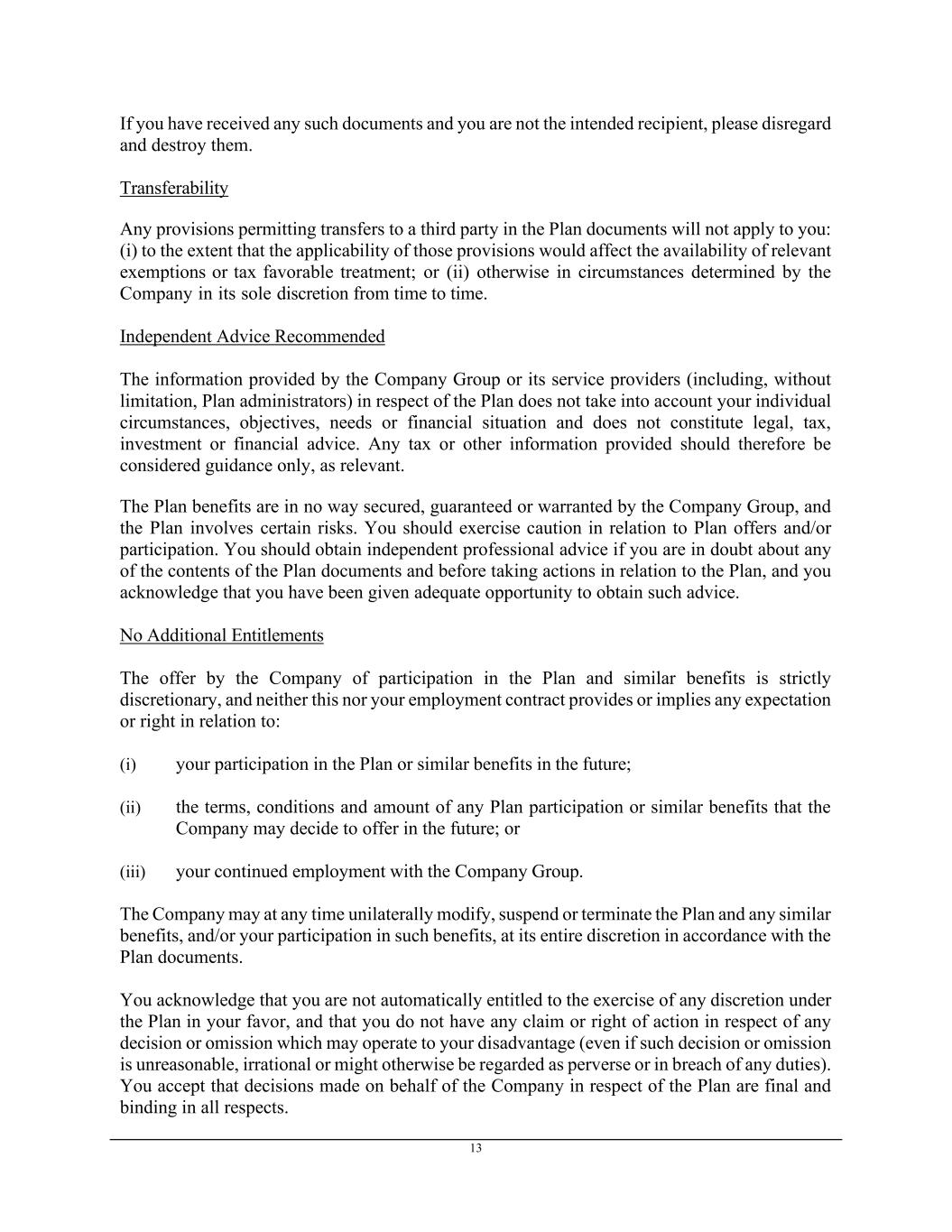 13 If you have received any such documents and you are not the intended recipient, please disregard and destroy them. Transferability Any provisions permitting transfers to a third party in the Plan documents will not apply to you: (i) to the extent that the applicability of those provisions would affect the availability of relevant exemptions or tax favorable treatment; or (ii) otherwise in circumstances determined by the Company in its sole discretion from time to time. Independent Advice Recommended The information provided by the Company Group or its service providers (including, without limitation, Plan administrators) in respect of the Plan does not take into account your individual circumstances, objectives, needs or financial situation and does not constitute legal, tax, investment or financial advice. Any tax or other information provided should therefore be considered guidance only, as relevant. The Plan benefits are in no way secured, guaranteed or warranted by the Company Group, and the Plan involves certain risks. You should exercise caution in relation to Plan offers and/or participation. You should obtain independent professional advice if you are in doubt about any of the contents of the Plan documents and before taking actions in relation to the Plan, and you acknowledge that you have been given adequate opportunity to obtain such advice. No Additional Entitlements The offer by the Company of participation in the Plan and similar benefits is strictly discretionary, and neither this nor your employment contract provides or implies any expectation or right in relation to: (i) your participation in the Plan or similar benefits in the future; (ii) the terms, conditions and amount of any Plan participation or similar benefits that the Company may decide to offer in the future; or (iii) your continued employment with the Company Group. The Company may at any time unilaterally modify, suspend or terminate the Plan and any similar benefits, and/or your participation in such benefits, at its entire discretion in accordance with the Plan documents. You acknowledge that you are not automatically entitled to the exercise of any discretion under the Plan in your favor, and that you do not have any claim or right of action in respect of any decision or omission which may operate to your disadvantage (even if such decision or omission is unreasonable, irrational or might otherwise be regarded as perverse or in breach of any duties). You accept that decisions made on behalf of the Company in respect of the Plan are final and binding in all respects.