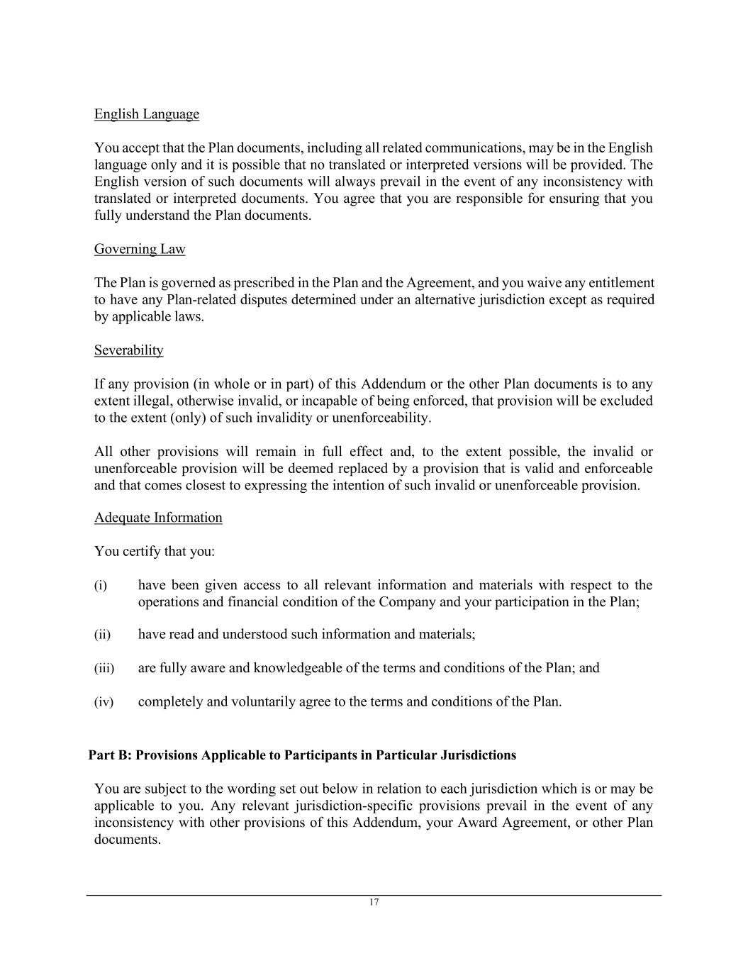 17 English Language You accept that the Plan documents, including all related communications, may be in the English language only and it is possible that no translated or interpreted versions will be provided. The English version of such documents will always prevail in the event of any inconsistency with translated or interpreted documents. You agree that you are responsible for ensuring that you fully understand the Plan documents. Governing Law The Plan is governed as prescribed in the Plan and the Agreement, and you waive any entitlement to have any Plan-related disputes determined under an alternative jurisdiction except as required by applicable laws. Severability If any provision (in whole or in part) of this Addendum or the other Plan documents is to any extent illegal, otherwise invalid, or incapable of being enforced, that provision will be excluded to the extent (only) of such invalidity or unenforceability. All other provisions will remain in full effect and, to the extent possible, the invalid or unenforceable provision will be deemed replaced by a provision that is valid and enforceable and that comes closest to expressing the intention of such invalid or unenforceable provision. Adequate Information You certify that you: (i) have been given access to all relevant information and materials with respect to the operations and financial condition of the Company and your participation in the Plan; (ii) have read and understood such information and materials; (iii) are fully aware and knowledgeable of the terms and conditions of the Plan; and (iv) completely and voluntarily agree to the terms and conditions of the Plan. Part B: Provisions Applicable to Participants in Particular Jurisdictions You are subject to the wording set out below in relation to each jurisdiction which is or may be applicable to you. Any relevant jurisdiction-specific provisions prevail in the event of any inconsistency with other provisions of this Addendum, your Award Agreement, or other Plan documents.