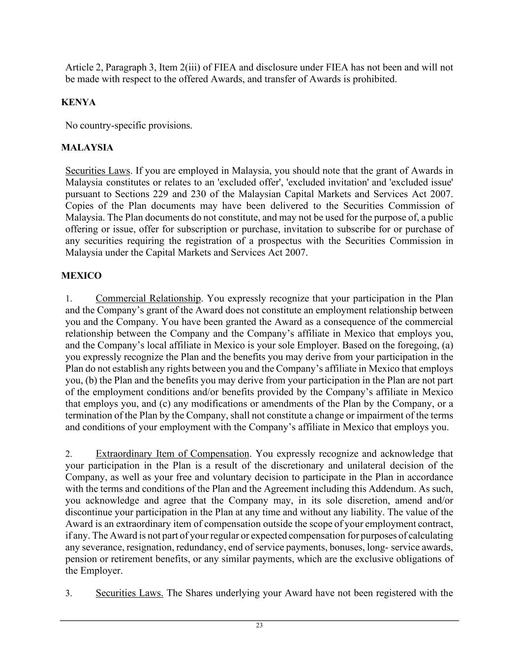 23 Article 2, Paragraph 3, Item 2(iii) of FIEA and disclosure under FIEA has not been and will not be made with respect to the offered Awards, and transfer of Awards is prohibited. KENYA No country-specific provisions. MALAYSIA Securities Laws. If you are employed in Malaysia, you should note that the grant of Awards in Malaysia constitutes or relates to an 'excluded offer', 'excluded invitation' and 'excluded issue' pursuant to Sections 229 and 230 of the Malaysian Capital Markets and Services Act 2007. Copies of the Plan documents may have been delivered to the Securities Commission of Malaysia. The Plan documents do not constitute, and may not be used for the purpose of, a public offering or issue, offer for subscription or purchase, invitation to subscribe for or purchase of any securities requiring the registration of a prospectus with the Securities Commission in Malaysia under the Capital Markets and Services Act 2007. MEXICO 1. Commercial Relationship. You expressly recognize that your participation in the Plan and the Company’s grant of the Award does not constitute an employment relationship between you and the Company. You have been granted the Award as a consequence of the commercial relationship between the Company and the Company’s affiliate in Mexico that employs you, and the Company’s local affiliate in Mexico is your sole Employer. Based on the foregoing, (a) you expressly recognize the Plan and the benefits you may derive from your participation in the Plan do not establish any rights between you and the Company’s affiliate in Mexico that employs you, (b) the Plan and the benefits you may derive from your participation in the Plan are not part of the employment conditions and/or benefits provided by the Company’s affiliate in Mexico that employs you, and (c) any modifications or amendments of the Plan by the Company, or a termination of the Plan by the Company, shall not constitute a change or impairment of the terms and conditions of your employment with the Company’s affiliate in Mexico that employs you. 2. Extraordinary Item of Compensation. You expressly recognize and acknowledge that your participation in the Plan is a result of the discretionary and unilateral decision of the Company, as well as your free and voluntary decision to participate in the Plan in accordance with the terms and conditions of the Plan and the Agreement including this Addendum. As such, you acknowledge and agree that the Company may, in its sole discretion, amend and/or discontinue your participation in the Plan at any time and without any liability. The value of the Award is an extraordinary item of compensation outside the scope of your employment contract, if any. The Award is not part of your regular or expected compensation for purposes of calculating any severance, resignation, redundancy, end of service payments, bonuses, long- service awards, pension or retirement benefits, or any similar payments, which are the exclusive obligations of the Employer. 3. Securities Laws. The Shares underlying your Award have not been registered with the