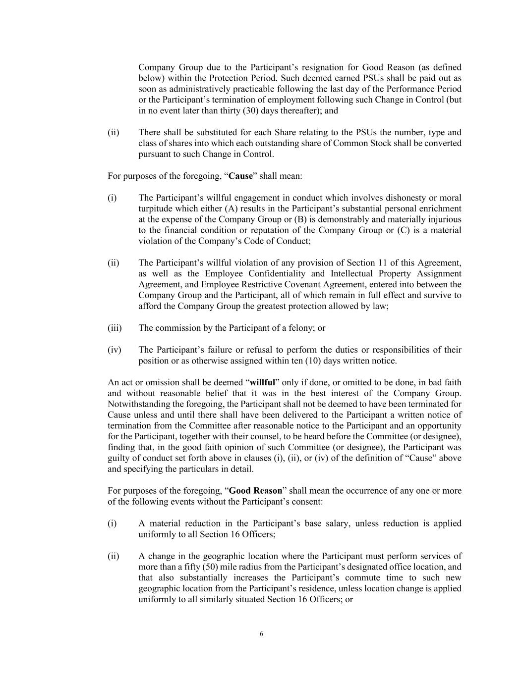6 Company Group due to the Participant’s resignation for Good Reason (as defined below) within the Protection Period. Such deemed earned PSUs shall be paid out as soon as administratively practicable following the last day of the Performance Period or the Participant’s termination of employment following such Change in Control (but in no event later than thirty (30) days thereafter); and (ii) There shall be substituted for each Share relating to the PSUs the number, type and class of shares into which each outstanding share of Common Stock shall be converted pursuant to such Change in Control. For purposes of the foregoing, “Cause” shall mean: (i) The Participant’s willful engagement in conduct which involves dishonesty or moral turpitude which either (A) results in the Participant’s substantial personal enrichment at the expense of the Company Group or (B) is demonstrably and materially injurious to the financial condition or reputation of the Company Group or (C) is a material violation of the Company’s Code of Conduct; (ii) The Participant’s willful violation of any provision of Section 11 of this Agreement, as well as the Employee Confidentiality and Intellectual Property Assignment Agreement, and Employee Restrictive Covenant Agreement, entered into between the Company Group and the Participant, all of which remain in full effect and survive to afford the Company Group the greatest protection allowed by law; (iii) The commission by the Participant of a felony; or (iv) The Participant’s failure or refusal to perform the duties or responsibilities of their position or as otherwise assigned within ten (10) days written notice. An act or omission shall be deemed “willful” only if done, or omitted to be done, in bad faith and without reasonable belief that it was in the best interest of the Company Group. Notwithstanding the foregoing, the Participant shall not be deemed to have been terminated for Cause unless and until there shall have been delivered to the Participant a written notice of termination from the Committee after reasonable notice to the Participant and an opportunity for the Participant, together with their counsel, to be heard before the Committee (or designee), finding that, in the good faith opinion of such Committee (or designee), the Participant was guilty of conduct set forth above in clauses (i), (ii), or (iv) of the definition of “Cause” above and specifying the particulars in detail. For purposes of the foregoing, “Good Reason” shall mean the occurrence of any one or more of the following events without the Participant’s consent: (i) A material reduction in the Participant’s base salary, unless reduction is applied uniformly to all Section 16 Officers; (ii) A change in the geographic location where the Participant must perform services of more than a fifty (50) mile radius from the Participant’s designated office location, and that also substantially increases the Participant’s commute time to such new geographic location from the Participant’s residence, unless location change is applied uniformly to all similarly situated Section 16 Officers; or