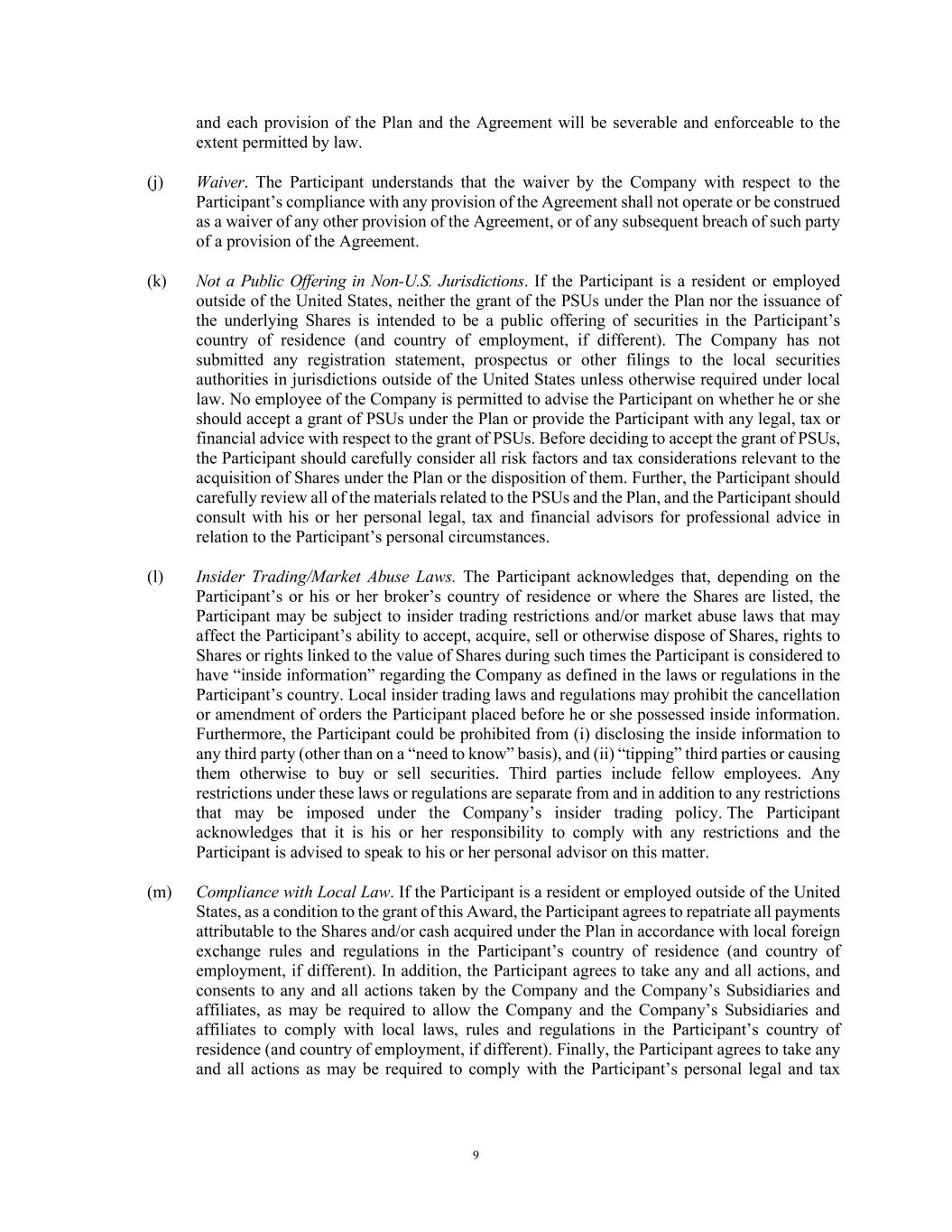9 and each provision of the Plan and the Agreement will be severable and enforceable to the extent permitted by law. (j) Waiver. The Participant understands that the waiver by the Company with respect to the Participant’s compliance with any provision of the Agreement shall not operate or be construed as a waiver of any other provision of the Agreement, or of any subsequent breach of such party of a provision of the Agreement. (k) Not a Public Offering in Non-U.S. Jurisdictions. If the Participant is a resident or employed outside of the United States, neither the grant of the PSUs under the Plan nor the issuance of the underlying Shares is intended to be a public offering of securities in the Participant’s country of residence (and country of employment, if different). The Company has not submitted any registration statement, prospectus or other filings to the local securities authorities in jurisdictions outside of the United States unless otherwise required under local law. No employee of the Company is permitted to advise the Participant on whether he or she should accept a grant of PSUs under the Plan or provide the Participant with any legal, tax or financial advice with respect to the grant of PSUs. Before deciding to accept the grant of PSUs, the Participant should carefully consider all risk factors and tax considerations relevant to the acquisition of Shares under the Plan or the disposition of them. Further, the Participant should carefully review all of the materials related to the PSUs and the Plan, and the Participant should consult with his or her personal legal, tax and financial advisors for professional advice in relation to the Participant’s personal circumstances. (l) Insider Trading/Market Abuse Laws. The Participant acknowledges that, depending on the Participant’s or his or her broker’s country of residence or where the Shares are listed, the Participant may be subject to insider trading restrictions and/or market abuse laws that may affect the Participant’s ability to accept, acquire, sell or otherwise dispose of Shares, rights to Shares or rights linked to the value of Shares during such times the Participant is considered to have “inside information” regarding the Company as defined in the laws or regulations in the Participant’s country. Local insider trading laws and regulations may prohibit the cancellation or amendment of orders the Participant placed before he or she possessed inside information. Furthermore, the Participant could be prohibited from (i) disclosing the inside information to any third party (other than on a “need to know” basis), and (ii) “tipping” third parties or causing them otherwise to buy or sell securities. Third parties include fellow employees. Any restrictions under these laws or regulations are separate from and in addition to any restrictions that may be imposed under the Company’s insider trading policy. The Participant acknowledges that it is his or her responsibility to comply with any restrictions and the Participant is advised to speak to his or her personal advisor on this matter. (m) Compliance with Local Law. If the Participant is a resident or employed outside of the United States, as a condition to the grant of this Award, the Participant agrees to repatriate all payments attributable to the Shares and/or cash acquired under the Plan in accordance with local foreign exchange rules and regulations in the Participant’s country of residence (and country of employment, if different). In addition, the Participant agrees to take any and all actions, and consents to any and all actions taken by the Company and the Company’s Subsidiaries and affiliates, as may be required to allow the Company and the Company’s Subsidiaries and affiliates to comply with local laws, rules and regulations in the Participant’s country of residence (and country of employment, if different). Finally, the Participant agrees to take any and all actions as may be required to comply with the Participant’s personal legal and tax