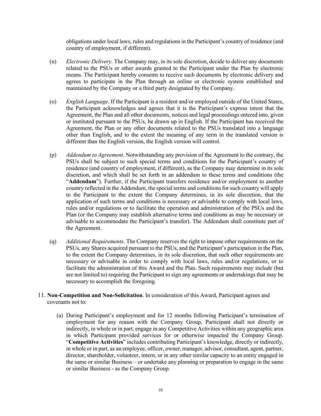 10 obligations under local laws, rules and regulations in the Participant’s country of residence (and country of employment, if different). (n) Electronic Delivery. The Company may, in its sole discretion, decide to deliver any documents related to the PSUs or other awards granted to the Participant under the Plan by electronic means. The Participant hereby consents to receive such documents by electronic delivery and agrees to participate in the Plan through an online or electronic system established and maintained by the Company or a third party designated by the Company. (o) English Language. If the Participant is a resident and/or employed outside of the United States, the Participant acknowledges and agrees that it is the Participant’s express intent that the Agreement, the Plan and all other documents, notices and legal proceedings entered into, given or instituted pursuant to the PSUs, be drawn up in English. If the Participant has received the Agreement, the Plan or any other documents related to the PSUs translated into a language other than English, and to the extent the meaning of any term in the translated version is different than the English version, the English version will control. (p) Addendum to Agreement. Notwithstanding any provision of the Agreement to the contrary, the PSUs shall be subject to such special terms and conditions for the Participant’s country of residence (and country of employment, if different), as the Company may determine in its sole discretion, and which shall be set forth in an addendum to these terms and conditions (the “Addendum”). Further, if the Participant transfers residence and/or employment to another country reflected in the Addendum, the special terms and conditions for such country will apply to the Participant to the extent the Company determines, in its sole discretion, that the application of such terms and conditions is necessary or advisable to comply with local laws, rules and/or regulations or to facilitate the operation and administration of the PSUs and the Plan (or the Company may establish alternative terms and conditions as may be necessary or advisable to accommodate the Participant’s transfer). The Addendum shall constitute part of the Agreement. (q) Additional Requirements. The Company reserves the right to impose other requirements on the PSUs, any Shares acquired pursuant to the PSUs, and the Participant’s participation in the Plan, to the extent the Company determines, in its sole discretion, that such other requirements are necessary or advisable in order to comply with local laws, rules and/or regulations, or to facilitate the administration of this Award and the Plan. Such requirements may include (but are not limited to) requiring the Participant to sign any agreements or undertakings that may be necessary to accomplish the foregoing. 11. Non-Competition and Non-Solicitation. In consideration of this Award, Participant agrees and covenants not to: (a) During Participant’s employment and for 12 months following Participant’s termination of employment for any reason with the Company Group, Participant shall not directly or indirectly, in whole or in part, engage in any Competitive Activities within any geographic area in which Participant provided services for or otherwise impacted the Company Group. “Competitive Activities” includes contributing Participant’s knowledge, directly or indirectly, in whole or in part, as an employee, officer, owner, manager, advisor, consultant, agent, partner, director, shareholder, volunteer, intern, or in any other similar capacity to an entity engaged in the same or similar Business – or undertake any planning or preparation to engage in the same or similar Business - as the Company Group.