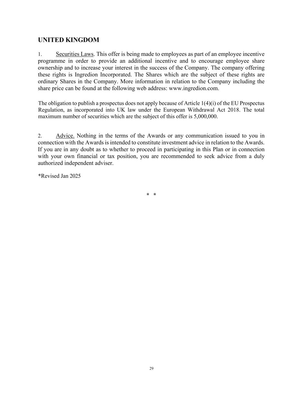 29 UNITED KINGDOM 1. Securities Laws. This offer is being made to employees as part of an employee incentive programme in order to provide an additional incentive and to encourage employee share ownership and to increase your interest in the success of the Company. The company offering these rights is Ingredion Incorporated. The Shares which are the subject of these rights are ordinary Shares in the Company. More information in relation to the Company including the share price can be found at the following web address: www.ingredion.com. The obligation to publish a prospectus does not apply because of Article 1(4)(i) of the EU Prospectus Regulation, as incorporated into UK law under the European Withdrawal Act 2018. The total maximum number of securities which are the subject of this offer is 5,000,000. 2. Advice. Nothing in the terms of the Awards or any communication issued to you in connection with the Awards is intended to constitute investment advice in relation to the Awards. If you are in any doubt as to whether to proceed in participating in this Plan or in connection with your own financial or tax position, you are recommended to seek advice from a duly authorized independent adviser. *Revised Jan 2025 * *