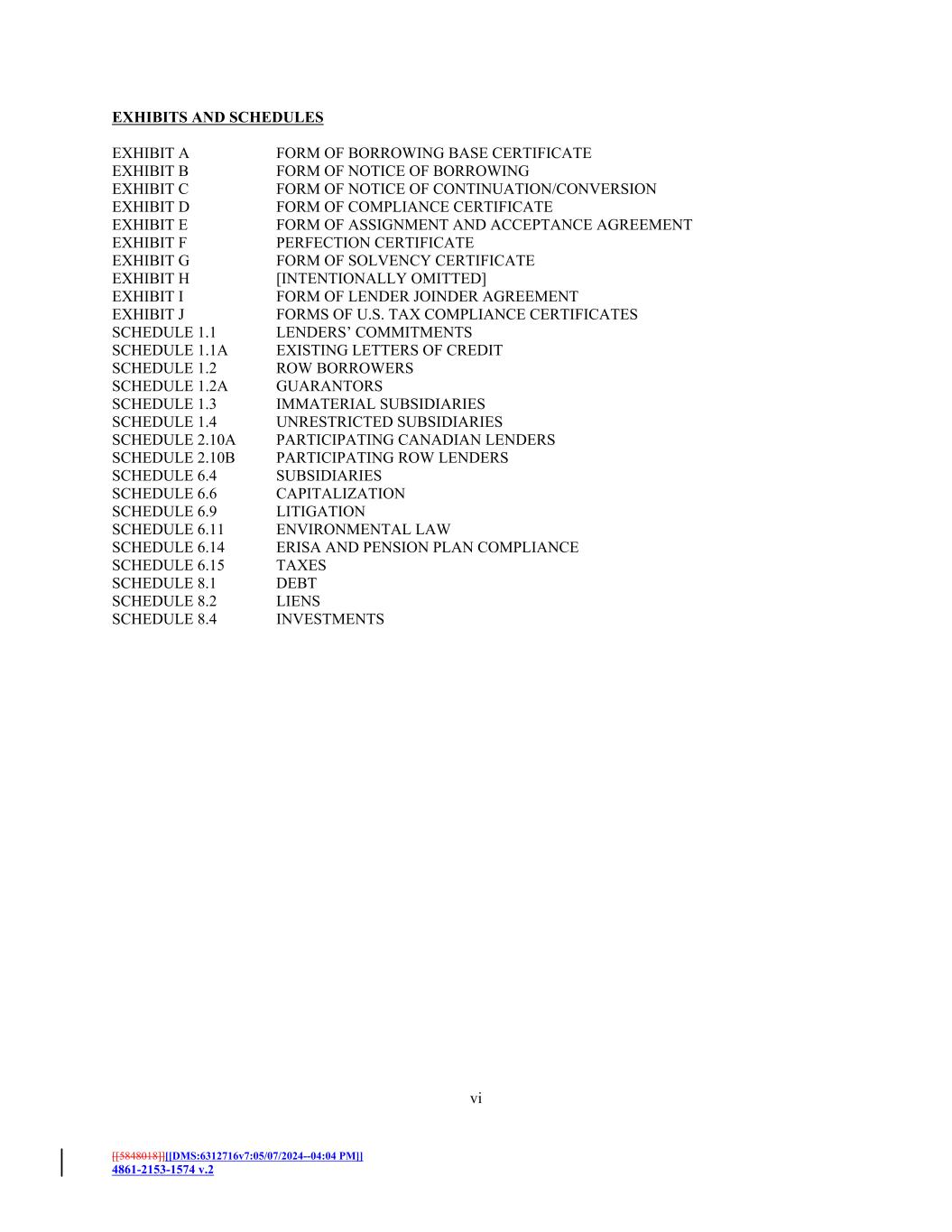 vi [[5848018]][[DMS:6312716v7:05/07/2024--04:04 PM]] 4861-2153-1574 v.2 SCHEDULE 1.2 ROW BORROWERS SCHEDULE 1.2A EXHIBIT F GUARANTORS EXHIBIT B PERFECTION CERTIFICATE SCHEDULE 1.3 IMMATERIAL SUBSIDIARIES FORM OF NOTICE OF BORROWING SCHEDULE 1.4 EXHIBIT G UNRESTRICTED SUBSIDIARIES FORM OF SOLVENCY CERTIFICATE SCHEDULE 2.10A PARTICIPATING CANADIAN LENDERS SCHEDULE 2.10B EXHIBIT H PARTICIPATING ROW LENDERS EXHIBIT C [INTENTIONALLY OMITTED] SCHEDULE 6.4 SUBSIDIARIES FORM OF NOTICE OF CONTINUATION/CONVERSION SCHEDULE 6.6 EXHIBIT I CAPITALIZATION FORM OF LENDER JOINDER AGREEMENT SCHEDULE 6.9 LITIGATION EXHIBITS AND SCHEDULES SCHEDULE 6.11 EXHIBIT J ENVIRONMENTAL LAW EXHIBIT D FORMS OF U.S. TAX COMPLIANCE CERTIFICATES SCHEDULE 6.14 EXHIBIT A ERISA AND PENSION PLAN COMPLIANCE FORM OF COMPLIANCE CERTIFICATE SCHEDULE 6.15 SCHEDULE 1.1 TAXES LENDERS’ COMMITMENTS SCHEDULE 8.1 DEBT FORM OF BORROWING BASE CERTIFICATE SCHEDULE 8.2 SCHEDULE 1.1A LIENS EXHIBIT E EXISTING LETTERS OF CREDIT SCHEDULE 8.4 INVESTMENTS FORM OF ASSIGNMENT AND ACCEPTANCE AGREEMENT
