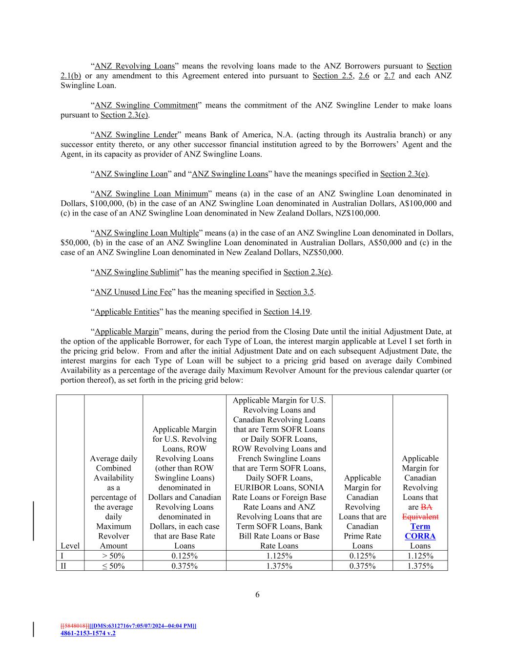 6 [[5848018]][[DMS:6312716v7:05/07/2024--04:04 PM]] 4861-2153-1574 v.2 Applicable Margin for U.S. Revolving Loans, ROW Revolving Loans (other than ROW Swingline Loans) denominated in Dollars and Canadian Revolving Loans denominated in Dollars, in each case that are Base Rate Loans 0.125% 1.125% Applicable Margin for U.S. Revolving Loans and Canadian Revolving Loans that are Term SOFR Loans or Daily SOFR Loans, ROW Revolving Loans and French Swingline Loans that are Term SOFR Loans, Daily SOFR Loans, EURIBOR Loans, SONIA Rate Loans or Foreign Base Rate Loans and ANZ Revolving Loans that are Term SOFR Loans, Bank Bill Rate Loans or Base Rate Loans 0.125% 1.125% Applicable Margin for Canadian Revolving Loans that are Canadian Prime Rate LoansLevel II Applicable Margin for Canadian Revolving Loans that are BA Equivalent Term CORRA Loans ≤ 50% 0.375% 1.375% Average daily Combined Availability as a percentage of the average daily Maximum Revolver Amount 0.375% I 1.375% “ANZ Revolving Loans” means the revolving loans made to the ANZ Borrowers pursuant to Section 2.1(b) or any amendment to this Agreement entered into pursuant to Section 2.5, 2.6 or 2.7 and each ANZ Swingline Loan. “ANZ Swingline Commitment” means the commitment of the ANZ Swingline Lender to make loans pursuant to Section 2.3(e). “ANZ Swingline Lender” means Bank of America, N.A. (acting through its Australia branch) or any successor entity thereto, or any other successor financial institution agreed to by the Borrowers’ Agent and the Agent, in its capacity as provider of ANZ Swingline Loans. “ANZ Swingline Loan” and “ANZ Swingline Loans” have the meanings specified in Section 2.3(e). “ANZ Swingline Loan Minimum” means (a) in the case of an ANZ Swingline Loan denominated in Dollars, $100,000, (b) in the case of an ANZ Swingline Loan denominated in Australian Dollars, A$100,000 and (c) in the case of an ANZ Swingline Loan denominated in New Zealand Dollars, NZ$100,000. “ANZ Swingline Loan Multiple” means (a) in the case of an ANZ Swingline Loan denominated in Dollars, $50,000, (b) in the case of an ANZ Swingline Loan denominated in Australian Dollars, A$50,000 and (c) in the case of an ANZ Swingline Loan denominated in New Zealand Dollars, NZ$50,000. “ANZ Swingline Sublimit” has the meaning specified in Section 2.3(e). “ANZ Unused Line Fee” has the meaning specified in Section 3.5. “Applicable Entities” has the meaning specified in Section 14.19. “Applicable Margin” means, during the period from the Closing Date until the initial Adjustment Date, at the option of the applicable Borrower, for each Type of Loan, the interest margin applicable at Level I set forth in the pricing grid below. From and after the initial Adjustment Date and on each subsequent Adjustment Date, the interest margins for each Type of Loan will be subject to a pricing grid based on average daily Combined Availability as a percentage of the average daily Maximum Revolver Amount for the previous calendar quarter (or portion thereof), as set forth in the pricing grid below: > 50%