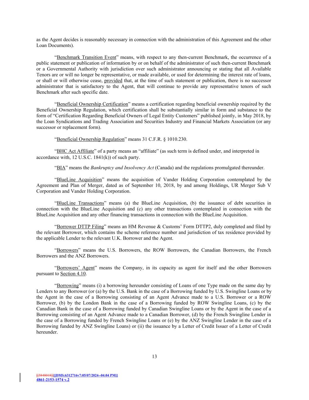 as the Agent decides is reasonably necessary in connection with the administration of this Agreement and the other Loan Documents). “Benchmark Transition Event” means, with respect to any then-current Benchmark, the occurrence of a public statement or publication of information by or on behalf of the administrator of such then-current Benchmark or a Governmental Authority with jurisdiction over such administrator announcing or stating that all Available Tenors are or will no longer be representative, or made available, or used for determining the interest rate of loans, or shall or will otherwise cease, provided that, at the time of such statement or publication, there is no successor administrator that is satisfactory to the Agent, that will continue to provide any representative tenors of such Benchmark after such specific date. “Beneficial Ownership Certification” means a certification regarding beneficial ownership required by the Beneficial Ownership Regulation, which certification shall be substantially similar in form and substance to the form of “Certification Regarding Beneficial Owners of Legal Entity Customers” published jointly, in May 2018, by the Loan Syndications and Trading Association and Securities Industry and Financial Markets Association (or any successor or replacement form). “Beneficial Ownership Regulation” means 31 C.F.R. § 1010.230. “BHC Act Affiliate” of a party means an “affiliate” (as such term is defined under, and interpreted in accordance with, 12 U.S.C. 1841(k)) of such party. “BIA” means the Bankruptcy and Insolvency Act (Canada) and the regulations promulgated thereunder. “BlueLine Acquisition” means the acquisition of Vander Holding Corporation contemplated by the Agreement and Plan of Merger, dated as of September 10, 2018, by and among Holdings, UR Merger Sub V Corporation and Vander Holding Corporation. “BlueLine Transactions” means (a) the BlueLine Acquisition, (b) the issuance of debt securities in connection with the BlueLine Acquisition and (c) any other transactions contemplated in connection with the BlueLine Acquisition and any other financing transactions in connection with the BlueLine Acquisition. “Borrower DTTP Filing” means an HM Revenue & Customs’ Form DTTP2, duly completed and filed by the relevant Borrower, which contains the scheme reference number and jurisdiction of tax residence provided by the applicable Lender to the relevant U.K. Borrower and the Agent. “Borrowers” means the U.S. Borrowers, the ROW Borrowers, the Canadian Borrowers, the French Borrowers and the ANZ Borrowers. “Borrowers’ Agent” means the Company, in its capacity as agent for itself and the other Borrowers pursuant to Section 4.10. “Borrowing” means (i) a borrowing hereunder consisting of Loans of one Type made on the same day by Lenders to any Borrower (or (a) by the U.S. Bank in the case of a Borrowing funded by U.S. Swingline Loans or by the Agent in the case of a Borrowing consisting of an Agent Advance made to a U.S. Borrower or a ROW Borrower, (b) by the London Bank in the case of a Borrowing funded by ROW Swingline Loans, (c) by the Canadian Bank in the case of a Borrowing funded by Canadian Swingline Loans or by the Agent in the case of a Borrowing consisting of an Agent Advance made to a Canadian Borrower, (d) by the French Swingline Lender in the case of a Borrowing funded by French Swingline Loans or (e) by the ANZ Swingline Lender in the case of a Borrowing funded by ANZ Swingline Loans) or (ii) the issuance by a Letter of Credit Issuer of a Letter of Credit hereunder. 13 [[5848018]][[DMS:6312716v7:05/07/2024--04:04 PM]] 4861-2153-1574 v.2