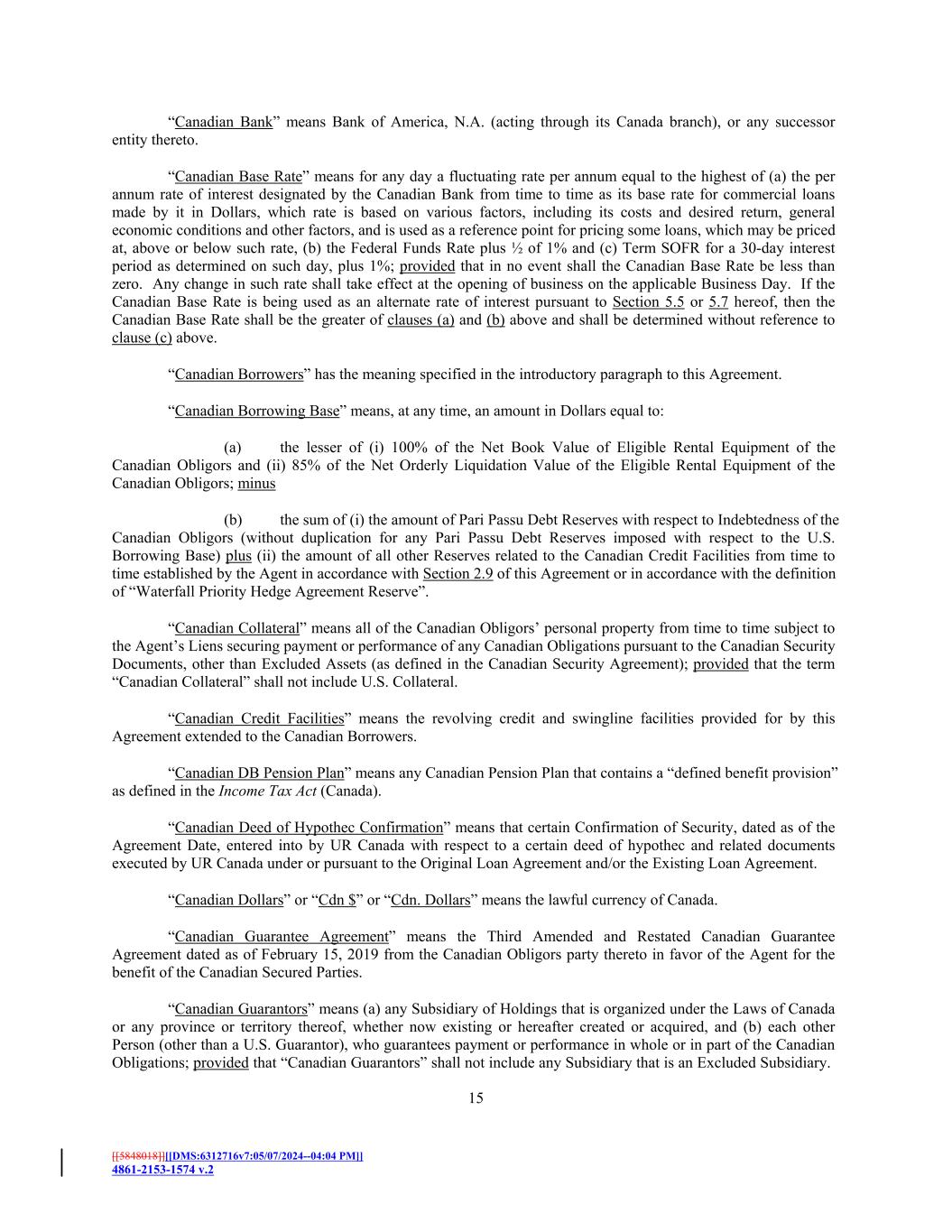 “Canadian Bank” means Bank of America, N.A. (acting through its Canada branch), or any successor entity thereto. “Canadian Base Rate” means for any day a fluctuating rate per annum equal to the highest of (a) the per annum rate of interest designated by the Canadian Bank from time to time as its base rate for commercial loans made by it in Dollars, which rate is based on various factors, including its costs and desired return, general economic conditions and other factors, and is used as a reference point for pricing some loans, which may be priced at, above or below such rate, (b) the Federal Funds Rate plus ½ of 1% and (c) Term SOFR for a 30-day interest period as determined on such day, plus 1%; provided that in no event shall the Canadian Base Rate be less than zero. Any change in such rate shall take effect at the opening of business on the applicable Business Day. If the Canadian Base Rate is being used as an alternate rate of interest pursuant to Section 5.5 or 5.7 hereof, then the Canadian Base Rate shall be the greater of clauses (a) and (b) above and shall be determined without reference to clause (c) above. “Canadian Borrowers” has the meaning specified in the introductory paragraph to this Agreement. “Canadian Borrowing Base” means, at any time, an amount in Dollars equal to: (a) the lesser of (i) 100% of the Net Book Value of Eligible Rental Equipment of the Canadian Obligors and (ii) 85% of the Net Orderly Liquidation Value of the Eligible Rental Equipment of the Canadian Obligors; minus (b) the sum of (i) the amount of Pari Passu Debt Reserves with respect to Indebtedness of the Canadian Obligors (without duplication for any Pari Passu Debt Reserves imposed with respect to the U.S. Borrowing Base) plus (ii) the amount of all other Reserves related to the Canadian Credit Facilities from time to time established by the Agent in accordance with Section 2.9 of this Agreement or in accordance with the definition of “Waterfall Priority Hedge Agreement Reserve”. “Canadian Collateral” means all of the Canadian Obligors’ personal property from time to time subject to the Agent’s Liens securing payment or performance of any Canadian Obligations pursuant to the Canadian Security Documents, other than Excluded Assets (as defined in the Canadian Security Agreement); provided that the term “Canadian Collateral” shall not include U.S. Collateral. “Canadian Credit Facilities” means the revolving credit and swingline facilities provided for by this Agreement extended to the Canadian Borrowers. “Canadian DB Pension Plan” means any Canadian Pension Plan that contains a “defined benefit provision” as defined in the Income Tax Act (Canada). “Canadian Deed of Hypothec Confirmation” means that certain Confirmation of Security, dated as of the Agreement Date, entered into by UR Canada with respect to a certain deed of hypothec and related documents executed by UR Canada under or pursuant to the Original Loan Agreement and/or the Existing Loan Agreement. “Canadian Dollars” or “Cdn $” or “Cdn. Dollars” means the lawful currency of Canada. “Canadian Guarantee Agreement” means the Third Amended and Restated Canadian Guarantee Agreement dated as of February 15, 2019 from the Canadian Obligors party thereto in favor of the Agent for the benefit of the Canadian Secured Parties. “Canadian Guarantors” means (a) any Subsidiary of Holdings that is organized under the Laws of Canada or any province or territory thereof, whether now existing or hereafter created or acquired, and (b) each other Person (other than a U.S. Guarantor), who guarantees payment or performance in whole or in part of the Canadian Obligations; provided that “Canadian Guarantors” shall not include any Subsidiary that is an Excluded Subsidiary. 15 [[5848018]][[DMS:6312716v7:05/07/2024--04:04 PM]] 4861-2153-1574 v.2