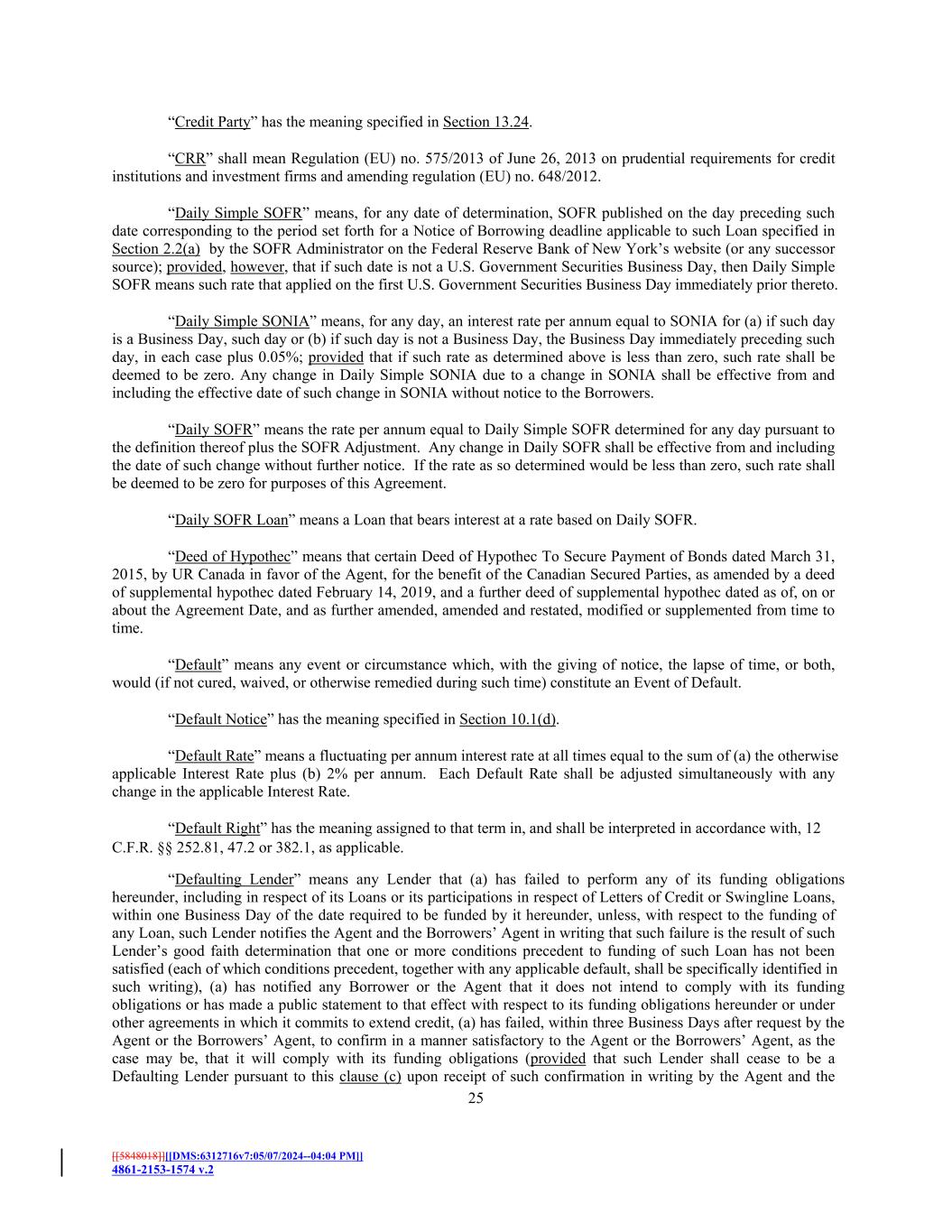 “Credit Party” has the meaning specified in Section 13.24. “CRR” shall mean Regulation (EU) no. 575/2013 of June 26, 2013 on prudential requirements for credit institutions and investment firms and amending regulation (EU) no. 648/2012. “Daily Simple SOFR” means, for any date of determination, SOFR published on the day preceding such date corresponding to the period set forth for a Notice of Borrowing deadline applicable to such Loan specified in Section 2.2(a) by the SOFR Administrator on the Federal Reserve Bank of New York’s website (or any successor source); provided, however, that if such date is not a U.S. Government Securities Business Day, then Daily Simple SOFR means such rate that applied on the first U.S. Government Securities Business Day immediately prior thereto. “Daily Simple SONIA” means, for any day, an interest rate per annum equal to SONIA for (a) if such day is a Business Day, such day or (b) if such day is not a Business Day, the Business Day immediately preceding such day, in each case plus 0.05%; provided that if such rate as determined above is less than zero, such rate shall be deemed to be zero. Any change in Daily Simple SONIA due to a change in SONIA shall be effective from and including the effective date of such change in SONIA without notice to the Borrowers. “Daily SOFR” means the rate per annum equal to Daily Simple SOFR determined for any day pursuant to the definition thereof plus the SOFR Adjustment. Any change in Daily SOFR shall be effective from and including the date of such change without further notice. If the rate as so determined would be less than zero, such rate shall be deemed to be zero for purposes of this Agreement. “Daily SOFR Loan” means a Loan that bears interest at a rate based on Daily SOFR. “Deed of Hypothec” means that certain Deed of Hypothec To Secure Payment of Bonds dated March 31, 2015, by UR Canada in favor of the Agent, for the benefit of the Canadian Secured Parties, as amended by a deed of supplemental hypothec dated February 14, 2019, and a further deed of supplemental hypothec dated as of, on or about the Agreement Date, and as further amended, amended and restated, modified or supplemented from time to time. “Default” means any event or circumstance which, with the giving of notice, the lapse of time, or both, would (if not cured, waived, or otherwise remedied during such time) constitute an Event of Default. “Default Notice” has the meaning specified in Section 10.1(d). “Default Rate” means a fluctuating per annum interest rate at all times equal to the sum of (a) the otherwise applicable Interest Rate plus (b) 2% per annum. Each Default Rate shall be adjusted simultaneously with any change in the applicable Interest Rate. “Default Right” has the meaning assigned to that term in, and shall be interpreted in accordance with, 12 C.F.R. §§ 252.81, 47.2 or 382.1, as applicable. “Defaulting Lender” means any Lender that (a) has failed to perform any of its funding obligations hereunder, including in respect of its Loans or its participations in respect of Letters of Credit or Swingline Loans, within one Business Day of the date required to be funded by it hereunder, unless, with respect to the funding of any Loan, such Lender notifies the Agent and the Borrowers’ Agent in writing that such failure is the result of such Lender’s good faith determination that one or more conditions precedent to funding of such Loan has not been satisfied (each of which conditions precedent, together with any applicable default, shall be specifically identified in such writing), (a) has notified any Borrower or the Agent that it does not intend to comply with its funding obligations or has made a public statement to that effect with respect to its funding obligations hereunder or under other agreements in which it commits to extend credit, (a) has failed, within three Business Days after request by the Agent or the Borrowers’ Agent, to confirm in a manner satisfactory to the Agent or the Borrowers’ Agent, as the case may be, that it will comply with its funding obligations (provided that such Lender shall cease to be a Defaulting Lender pursuant to this clause (c) upon receipt of such confirmation in writing by the Agent and the 25 [[5848018]][[DMS:6312716v7:05/07/2024--04:04 PM]] 4861-2153-1574 v.2