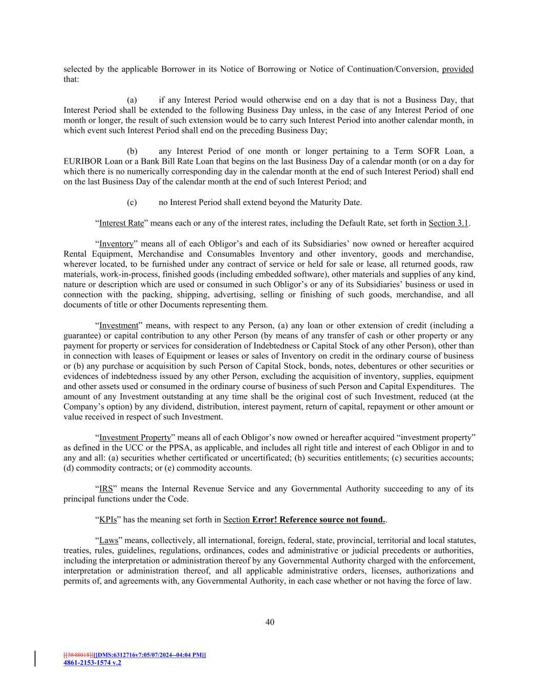 selected by the applicable Borrower in its Notice of Borrowing or Notice of Continuation/Conversion, provided that: (a) if any Interest Period would otherwise end on a day that is not a Business Day, that Interest Period shall be extended to the following Business Day unless, in the case of any Interest Period of one month or longer, the result of such extension would be to carry such Interest Period into another calendar month, in which event such Interest Period shall end on the preceding Business Day; (b) any Interest Period of one month or longer pertaining to a Term SOFR Loan, a EURIBOR Loan or a Bank Bill Rate Loan that begins on the last Business Day of a calendar month (or on a day for which there is no numerically corresponding day in the calendar month at the end of such Interest Period) shall end on the last Business Day of the calendar month at the end of such Interest Period; and (c) no Interest Period shall extend beyond the Maturity Date. “Interest Rate” means each or any of the interest rates, including the Default Rate, set forth in Section 3.1. “Inventory” means all of each Obligor’s and each of its Subsidiaries’ now owned or hereafter acquired Rental Equipment, Merchandise and Consumables Inventory and other inventory, goods and merchandise, wherever located, to be furnished under any contract of service or held for sale or lease, all returned goods, raw materials, work-in-process, finished goods (including embedded software), other materials and supplies of any kind, nature or description which are used or consumed in such Obligor’s or any of its Subsidiaries’ business or used in connection with the packing, shipping, advertising, selling or finishing of such goods, merchandise, and all documents of title or other Documents representing them. “Investment” means, with respect to any Person, (a) any loan or other extension of credit (including a guarantee) or capital contribution to any other Person (by means of any transfer of cash or other property or any payment for property or services for consideration of Indebtedness or Capital Stock of any other Person), other than in connection with leases of Equipment or leases or sales of Inventory on credit in the ordinary course of business or (b) any purchase or acquisition by such Person of Capital Stock, bonds, notes, debentures or other securities or evidences of indebtedness issued by any other Person, excluding the acquisition of inventory, supplies, equipment and other assets used or consumed in the ordinary course of business of such Person and Capital Expenditures. The amount of any Investment outstanding at any time shall be the original cost of such Investment, reduced (at the Company’s option) by any dividend, distribution, interest payment, return of capital, repayment or other amount or value received in respect of such Investment. “Investment Property” means all of each Obligor’s now owned or hereafter acquired “investment property” as defined in the UCC or the PPSA, as applicable, and includes all right title and interest of each Obligor in and to any and all: (a) securities whether certificated or uncertificated; (b) securities entitlements; (c) securities accounts; (d) commodity contracts; or (e) commodity accounts. “IRS” means the Internal Revenue Service and any Governmental Authority succeeding to any of its principal functions under the Code. “KPIs” has the meaning set forth in Section Error! Reference source not found.. “Laws” means, collectively, all international, foreign, federal, state, provincial, territorial and local statutes, treaties, rules, guidelines, regulations, ordinances, codes and administrative or judicial precedents or authorities, including the interpretation or administration thereof by any Governmental Authority charged with the enforcement, interpretation or administration thereof, and all applicable administrative orders, licenses, authorizations and permits of, and agreements with, any Governmental Authority, in each case whether or not having the force of law. 40 [[5848018]][[DMS:6312716v7:05/07/2024--04:04 PM]] 4861-2153-1574 v.2
