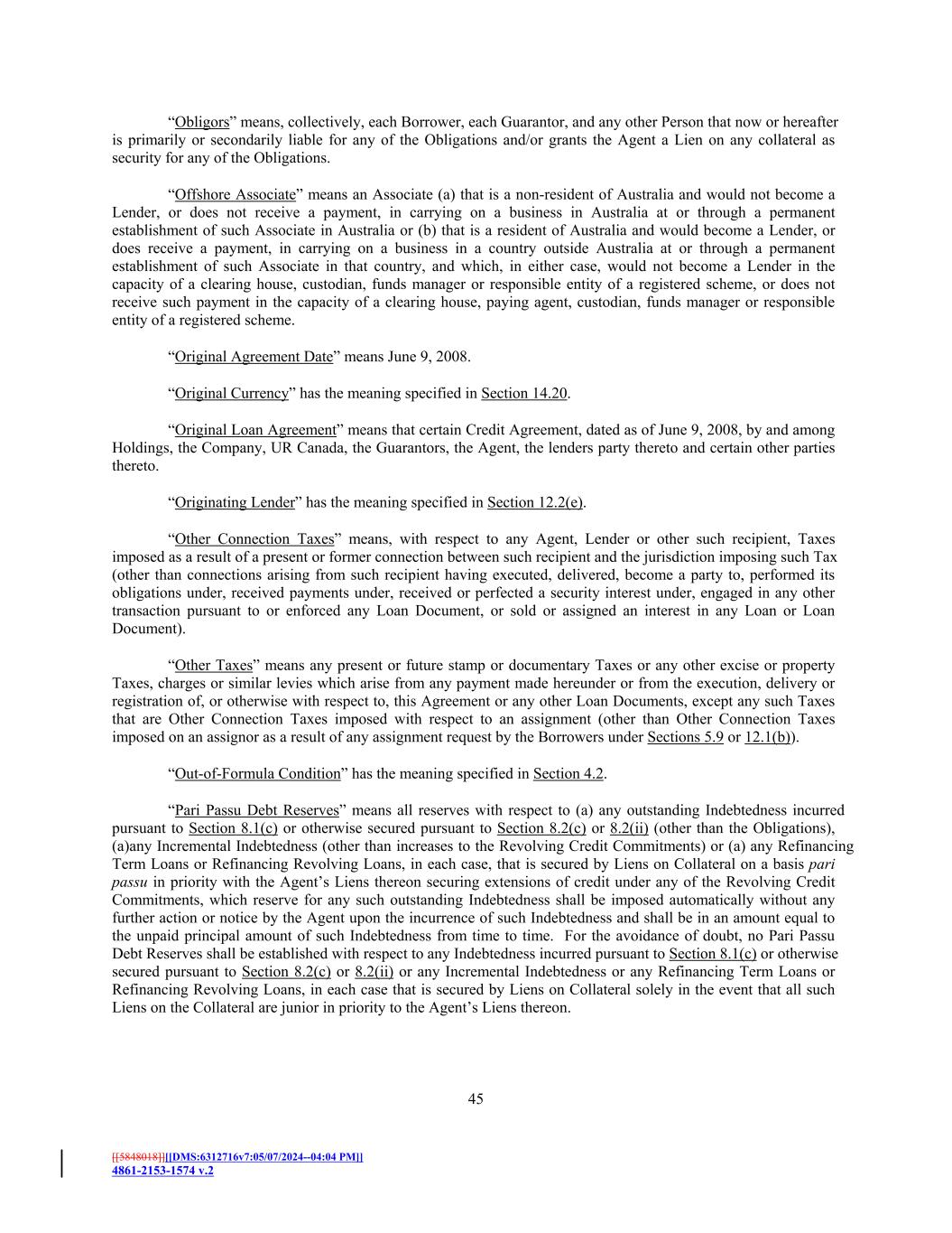 “Obligors” means, collectively, each Borrower, each Guarantor, and any other Person that now or hereafter is primarily or secondarily liable for any of the Obligations and/or grants the Agent a Lien on any collateral as security for any of the Obligations. “Offshore Associate” means an Associate (a) that is a non-resident of Australia and would not become a Lender, or does not receive a payment, in carrying on a business in Australia at or through a permanent establishment of such Associate in Australia or (b) that is a resident of Australia and would become a Lender, or does receive a payment, in carrying on a business in a country outside Australia at or through a permanent establishment of such Associate in that country, and which, in either case, would not become a Lender in the capacity of a clearing house, custodian, funds manager or responsible entity of a registered scheme, or does not receive such payment in the capacity of a clearing house, paying agent, custodian, funds manager or responsible entity of a registered scheme. “Original Agreement Date” means June 9, 2008. “Original Currency” has the meaning specified in Section 14.20. “Original Loan Agreement” means that certain Credit Agreement, dated as of June 9, 2008, by and among Holdings, the Company, UR Canada, the Guarantors, the Agent, the lenders party thereto and certain other parties thereto. “Originating Lender” has the meaning specified in Section 12.2(e). “Other Connection Taxes” means, with respect to any Agent, Lender or other such recipient, Taxes imposed as a result of a present or former connection between such recipient and the jurisdiction imposing such Tax (other than connections arising from such recipient having executed, delivered, become a party to, performed its obligations under, received payments under, received or perfected a security interest under, engaged in any other transaction pursuant to or enforced any Loan Document, or sold or assigned an interest in any Loan or Loan Document). “Other Taxes” means any present or future stamp or documentary Taxes or any other excise or property Taxes, charges or similar levies which arise from any payment made hereunder or from the execution, delivery or registration of, or otherwise with respect to, this Agreement or any other Loan Documents, except any such Taxes that are Other Connection Taxes imposed with respect to an assignment (other than Other Connection Taxes imposed on an assignor as a result of any assignment request by the Borrowers under Sections 5.9 or 12.1(b)). “Out-of-Formula Condition” has the meaning specified in Section 4.2. “Pari Passu Debt Reserves” means all reserves with respect to (a) any outstanding Indebtedness incurred pursuant to Section 8.1(c) or otherwise secured pursuant to Section 8.2(c) or 8.2(ii) (other than the Obligations), (a)any Incremental Indebtedness (other than increases to the Revolving Credit Commitments) or (a) any Refinancing Term Loans or Refinancing Revolving Loans, in each case, that is secured by Liens on Collateral on a basis pari passu in priority with the Agent’s Liens thereon securing extensions of credit under any of the Revolving Credit Commitments, which reserve for any such outstanding Indebtedness shall be imposed automatically without any further action or notice by the Agent upon the incurrence of such Indebtedness and shall be in an amount equal to the unpaid principal amount of such Indebtedness from time to time. For the avoidance of doubt, no Pari Passu Debt Reserves shall be established with respect to any Indebtedness incurred pursuant to Section 8.1(c) or otherwise secured pursuant to Section 8.2(c) or 8.2(ii) or any Incremental Indebtedness or any Refinancing Term Loans or Refinancing Revolving Loans, in each case that is secured by Liens on Collateral solely in the event that all such Liens on the Collateral are junior in priority to the Agent’s Liens thereon. 45 [[5848018]][[DMS:6312716v7:05/07/2024--04:04 PM]] 4861-2153-1574 v.2