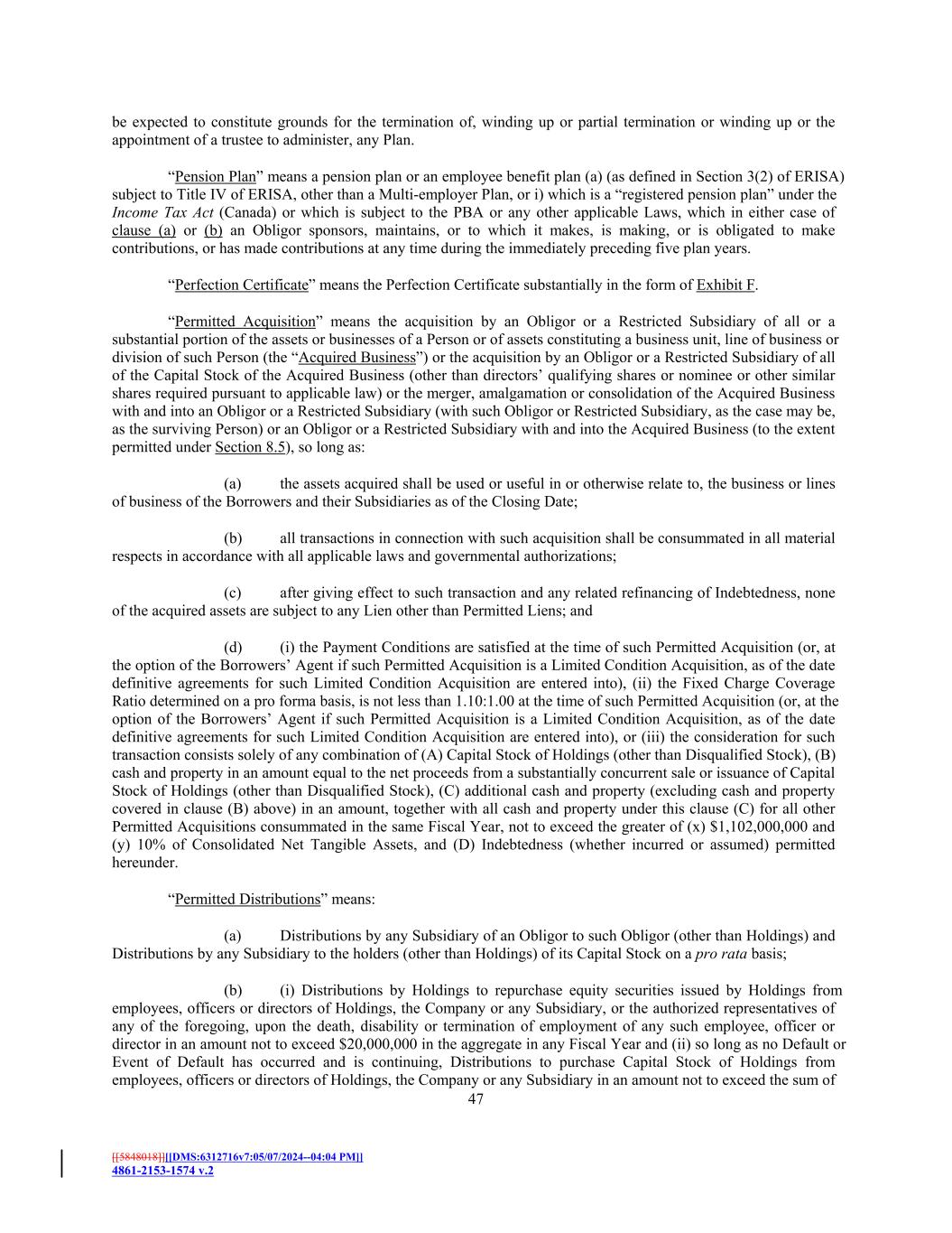 be expected to constitute grounds for the termination of, winding up or partial termination or winding up or the appointment of a trustee to administer, any Plan. “Pension Plan” means a pension plan or an employee benefit plan (a) (as defined in Section 3(2) of ERISA) subject to Title IV of ERISA, other than a Multi-employer Plan, or i) which is a “registered pension plan” under the Income Tax Act (Canada) or which is subject to the PBA or any other applicable Laws, which in either case of clause (a) or (b) an Obligor sponsors, maintains, or to which it makes, is making, or is obligated to make contributions, or has made contributions at any time during the immediately preceding five plan years. “Perfection Certificate” means the Perfection Certificate substantially in the form of Exhibit F. “Permitted Acquisition” means the acquisition by an Obligor or a Restricted Subsidiary of all or a substantial portion of the assets or businesses of a Person or of assets constituting a business unit, line of business or division of such Person (the “Acquired Business”) or the acquisition by an Obligor or a Restricted Subsidiary of all of the Capital Stock of the Acquired Business (other than directors’ qualifying shares or nominee or other similar shares required pursuant to applicable law) or the merger, amalgamation or consolidation of the Acquired Business with and into an Obligor or a Restricted Subsidiary (with such Obligor or Restricted Subsidiary, as the case may be, as the surviving Person) or an Obligor or a Restricted Subsidiary with and into the Acquired Business (to the extent permitted under Section 8.5), so long as: (a) the assets acquired shall be used or useful in or otherwise relate to, the business or lines of business of the Borrowers and their Subsidiaries as of the Closing Date; (b) all transactions in connection with such acquisition shall be consummated in all material respects in accordance with all applicable laws and governmental authorizations; (c) after giving effect to such transaction and any related refinancing of Indebtedness, none of the acquired assets are subject to any Lien other than Permitted Liens; and (d) (i) the Payment Conditions are satisfied at the time of such Permitted Acquisition (or, at the option of the Borrowers’ Agent if such Permitted Acquisition is a Limited Condition Acquisition, as of the date definitive agreements for such Limited Condition Acquisition are entered into), (ii) the Fixed Charge Coverage Ratio determined on a pro forma basis, is not less than 1.10:1.00 at the time of such Permitted Acquisition (or, at the option of the Borrowers’ Agent if such Permitted Acquisition is a Limited Condition Acquisition, as of the date definitive agreements for such Limited Condition Acquisition are entered into), or (iii) the consideration for such transaction consists solely of any combination of (A) Capital Stock of Holdings (other than Disqualified Stock), (B) cash and property in an amount equal to the net proceeds from a substantially concurrent sale or issuance of Capital Stock of Holdings (other than Disqualified Stock), (C) additional cash and property (excluding cash and property covered in clause (B) above) in an amount, together with all cash and property under this clause (C) for all other Permitted Acquisitions consummated in the same Fiscal Year, not to exceed the greater of (x) $1,102,000,000 and (y) 10% of Consolidated Net Tangible Assets, and (D) Indebtedness (whether incurred or assumed) permitted hereunder. “Permitted Distributions” means: (a) Distributions by any Subsidiary of an Obligor to such Obligor (other than Holdings) and Distributions by any Subsidiary to the holders (other than Holdings) of its Capital Stock on a pro rata basis; (b) (i) Distributions by Holdings to repurchase equity securities issued by Holdings from employees, officers or directors of Holdings, the Company or any Subsidiary, or the authorized representatives of any of the foregoing, upon the death, disability or termination of employment of any such employee, officer or director in an amount not to exceed $20,000,000 in the aggregate in any Fiscal Year and (ii) so long as no Default or Event of Default has occurred and is continuing, Distributions to purchase Capital Stock of Holdings from employees, officers or directors of Holdings, the Company or any Subsidiary in an amount not to exceed the sum of 47 [[5848018]][[DMS:6312716v7:05/07/2024--04:04 PM]] 4861-2153-1574 v.2