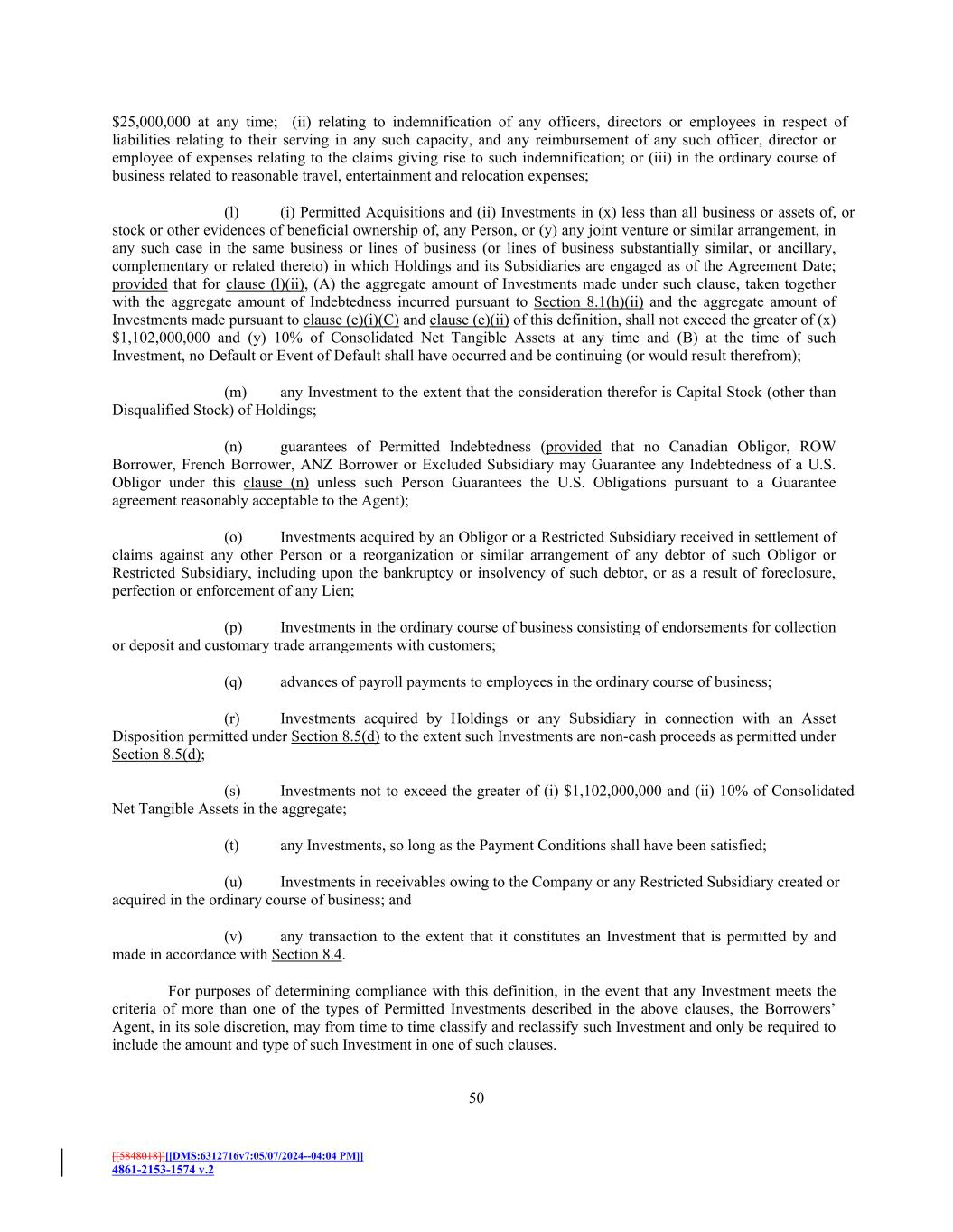 $25,000,000 at any time; (ii) relating to indemnification of any officers, directors or employees in respect of liabilities relating to their serving in any such capacity, and any reimbursement of any such officer, director or employee of expenses relating to the claims giving rise to such indemnification; or (iii) in the ordinary course of business related to reasonable travel, entertainment and relocation expenses; (l) (i) Permitted Acquisitions and (ii) Investments in (x) less than all business or assets of, or stock or other evidences of beneficial ownership of, any Person, or (y) any joint venture or similar arrangement, in any such case in the same business or lines of business (or lines of business substantially similar, or ancillary, complementary or related thereto) in which Holdings and its Subsidiaries are engaged as of the Agreement Date; provided that for clause (l)(ii), (A) the aggregate amount of Investments made under such clause, taken together with the aggregate amount of Indebtedness incurred pursuant to Section 8.1(h)(ii) and the aggregate amount of Investments made pursuant to clause (e)(i)(C) and clause (e)(ii) of this definition, shall not exceed the greater of (x) $1,102,000,000 and (y) 10% of Consolidated Net Tangible Assets at any time and (B) at the time of such Investment, no Default or Event of Default shall have occurred and be continuing (or would result therefrom); (m) any Investment to the extent that the consideration therefor is Capital Stock (other than Disqualified Stock) of Holdings; (n) guarantees of Permitted Indebtedness (provided that no Canadian Obligor, ROW Borrower, French Borrower, ANZ Borrower or Excluded Subsidiary may Guarantee any Indebtedness of a U.S. Obligor under this clause (n) unless such Person Guarantees the U.S. Obligations pursuant to a Guarantee agreement reasonably acceptable to the Agent); (o) Investments acquired by an Obligor or a Restricted Subsidiary received in settlement of claims against any other Person or a reorganization or similar arrangement of any debtor of such Obligor or Restricted Subsidiary, including upon the bankruptcy or insolvency of such debtor, or as a result of foreclosure, perfection or enforcement of any Lien; (p) Investments in the ordinary course of business consisting of endorsements for collection or deposit and customary trade arrangements with customers; (q) advances of payroll payments to employees in the ordinary course of business; (r) Investments acquired by Holdings or any Subsidiary in connection with an Asset Disposition permitted under Section 8.5(d) to the extent such Investments are non-cash proceeds as permitted under Section 8.5(d); (s) Investments not to exceed the greater of (i) $1,102,000,000 and (ii) 10% of Consolidated Net Tangible Assets in the aggregate; (t) any Investments, so long as the Payment Conditions shall have been satisfied; (u) Investments in receivables owing to the Company or any Restricted Subsidiary created or acquired in the ordinary course of business; and (v) any transaction to the extent that it constitutes an Investment that is permitted by and made in accordance with Section 8.4. For purposes of determining compliance with this definition, in the event that any Investment meets the criteria of more than one of the types of Permitted Investments described in the above clauses, the Borrowers’ Agent, in its sole discretion, may from time to time classify and reclassify such Investment and only be required to include the amount and type of such Investment in one of such clauses. 50 [[5848018]][[DMS:6312716v7:05/07/2024--04:04 PM]] 4861-2153-1574 v.2