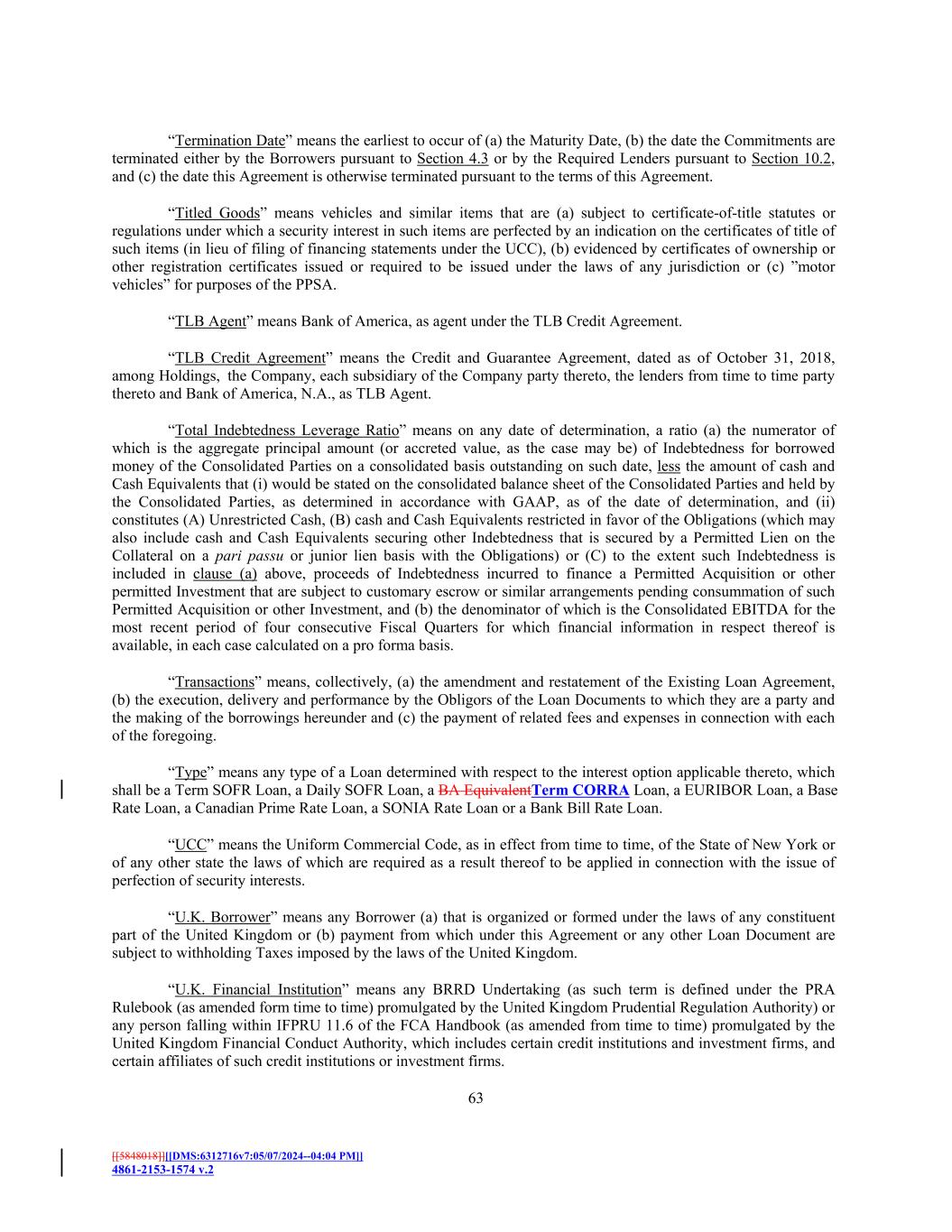 “Termination Date” means the earliest to occur of (a) the Maturity Date, (b) the date the Commitments are terminated either by the Borrowers pursuant to Section 4.3 or by the Required Lenders pursuant to Section 10.2, and (c) the date this Agreement is otherwise terminated pursuant to the terms of this Agreement. “Titled Goods” means vehicles and similar items that are (a) subject to certificate-of-title statutes or regulations under which a security interest in such items are perfected by an indication on the certificates of title of such items (in lieu of filing of financing statements under the UCC), (b) evidenced by certificates of ownership or other registration certificates issued or required to be issued under the laws of any jurisdiction or (c) ”motor vehicles” for purposes of the PPSA. “TLB Agent” means Bank of America, as agent under the TLB Credit Agreement. “TLB Credit Agreement” means the Credit and Guarantee Agreement, dated as of October 31, 2018, among Holdings, the Company, each subsidiary of the Company party thereto, the lenders from time to time party thereto and Bank of America, N.A., as TLB Agent. “Total Indebtedness Leverage Ratio” means on any date of determination, a ratio (a) the numerator of which is the aggregate principal amount (or accreted value, as the case may be) of Indebtedness for borrowed money of the Consolidated Parties on a consolidated basis outstanding on such date, less the amount of cash and Cash Equivalents that (i) would be stated on the consolidated balance sheet of the Consolidated Parties and held by the Consolidated Parties, as determined in accordance with GAAP, as of the date of determination, and (ii) constitutes (A) Unrestricted Cash, (B) cash and Cash Equivalents restricted in favor of the Obligations (which may also include cash and Cash Equivalents securing other Indebtedness that is secured by a Permitted Lien on the Collateral on a pari passu or junior lien basis with the Obligations) or (C) to the extent such Indebtedness is included in clause (a) above, proceeds of Indebtedness incurred to finance a Permitted Acquisition or other permitted Investment that are subject to customary escrow or similar arrangements pending consummation of such Permitted Acquisition or other Investment, and (b) the denominator of which is the Consolidated EBITDA for the most recent period of four consecutive Fiscal Quarters for which financial information in respect thereof is available, in each case calculated on a pro forma basis. “Transactions” means, collectively, (a) the amendment and restatement of the Existing Loan Agreement, (b) the execution, delivery and performance by the Obligors of the Loan Documents to which they are a party and the making of the borrowings hereunder and (c) the payment of related fees and expenses in connection with each of the foregoing. “Type” means any type of a Loan determined with respect to the interest option applicable thereto, which shall be a Term SOFR Loan, a Daily SOFR Loan, a BA EquivalentTerm CORRA Loan, a EURIBOR Loan, a Base Rate Loan, a Canadian Prime Rate Loan, a SONIA Rate Loan or a Bank Bill Rate Loan. “UCC” means the Uniform Commercial Code, as in effect from time to time, of the State of New York or of any other state the laws of which are required as a result thereof to be applied in connection with the issue of perfection of security interests. “U.K. Borrower” means any Borrower (a) that is organized or formed under the laws of any constituent part of the United Kingdom or (b) payment from which under this Agreement or any other Loan Document are subject to withholding Taxes imposed by the laws of the United Kingdom. “U.K. Financial Institution” means any BRRD Undertaking (as such term is defined under the PRA Rulebook (as amended form time to time) promulgated by the United Kingdom Prudential Regulation Authority) or any person falling within IFPRU 11.6 of the FCA Handbook (as amended from time to time) promulgated by the United Kingdom Financial Conduct Authority, which includes certain credit institutions and investment firms, and certain affiliates of such credit institutions or investment firms. 63 [[5848018]][[DMS:6312716v7:05/07/2024--04:04 PM]] 4861-2153-1574 v.2