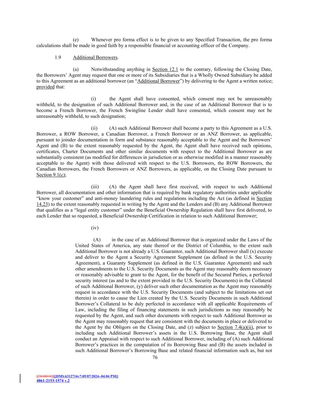 (e) Whenever pro forma effect is to be given to any Specified Transaction, the pro forma calculations shall be made in good faith by a responsible financial or accounting officer of the Company. 1.9 Additional Borrowers. (a) Notwithstanding anything in Section 12.1 to the contrary, following the Closing Date, the Borrowers’ Agent may request that one or more of its Subsidiaries that is a Wholly Owned Subsidiary be added to this Agreement as an additional borrower (an “Additional Borrower”) by delivering to the Agent a written notice; provided that: (i) the Agent shall have consented, which consent may not be unreasonably withheld, to the designation of such Additional Borrower and, in the case of an Additional Borrower that is to become a French Borrower, the French Swingline Lender shall have consented, which consent may not be unreasonably withheld, to such designation; (ii) (A) such Additional Borrower shall become a party to this Agreement as a U.S. Borrower, a ROW Borrower, a Canadian Borrower, a French Borrower or an ANZ Borrower, as applicable, pursuant to joinder documentation in form and substance reasonably acceptable to the Agent and the Borrowers’ Agent and (B) to the extent reasonably requested by the Agent, the Agent shall have received such opinions, certificates, Charter Documents and other similar documents with respect to the Additional Borrower as are substantially consistent (as modified for differences in jurisdiction or as otherwise modified in a manner reasonably acceptable to the Agent) with those delivered with respect to the U.S. Borrowers, the ROW Borrowers, the Canadian Borrowers, the French Borrowers or ANZ Borrowers, as applicable, on the Closing Date pursuant to Section 9.1(c); (iii) (A) the Agent shall have first received, with respect to such Additional Borrower, all documentation and other information that is required by bank regulatory authorities under applicable “know your customer” and anti-money laundering rules and regulations including the Act (as defined in Section 14.23) to the extent reasonably requested in writing by the Agent and the Lenders and (B) any Additional Borrower that qualifies as a “legal entity customer” under the Beneficial Ownership Regulation shall have first delivered, to each Lender that so requested, a Beneficial Ownership Certification in relation to such Additional Borrower; (iv) (A) in the case of an Additional Borrower that is organized under the Laws of the United States of America, any state thereof or the District of Columbia, to the extent such Additional Borrower is not already a U.S. Guarantor, such Additional Borrower shall (x) execute and deliver to the Agent a Security Agreement Supplement (as defined in the U.S. Security Agreement), a Guaranty Supplement (as defined in the U.S. Guarantee Agreement) and such other amendments to the U.S. Security Documents as the Agent may reasonably deem necessary or reasonably advisable to grant to the Agent, for the benefit of the Secured Parties, a perfected security interest (as and to the extent provided in the U.S. Security Documents) in the Collateral of such Additional Borrower, (y) deliver such other documentation as the Agent may reasonably request in accordance with the U.S. Security Documents (and subject to the limitations set out therein) in order to cause the Lien created by the U.S. Security Documents in such Additional Borrower’s Collateral to be duly perfected in accordance with all applicable Requirements of Law, including the filing of financing statements in such jurisdictions as may reasonably be requested by the Agent, and such other documents with respect to such Additional Borrower as the Agent may reasonably request that are consistent with the documents in place or delivered to the Agent by the Obligors on the Closing Date, and (z) subject to Section 7.4(a)(ii), prior to including such Additional Borrower’s assets in the U.S. Borrowing Base, the Agent shall conduct an Appraisal with respect to such Additional Borrower, including of (A) such Additional Borrower’s practices in the computation of its Borrowing Base and (B) the assets included in such Additional Borrower’s Borrowing Base and related financial information such as, but not 76 [[5848018]][[DMS:6312716v7:05/07/2024--04:04 PM]] 4861-2153-1574 v.2