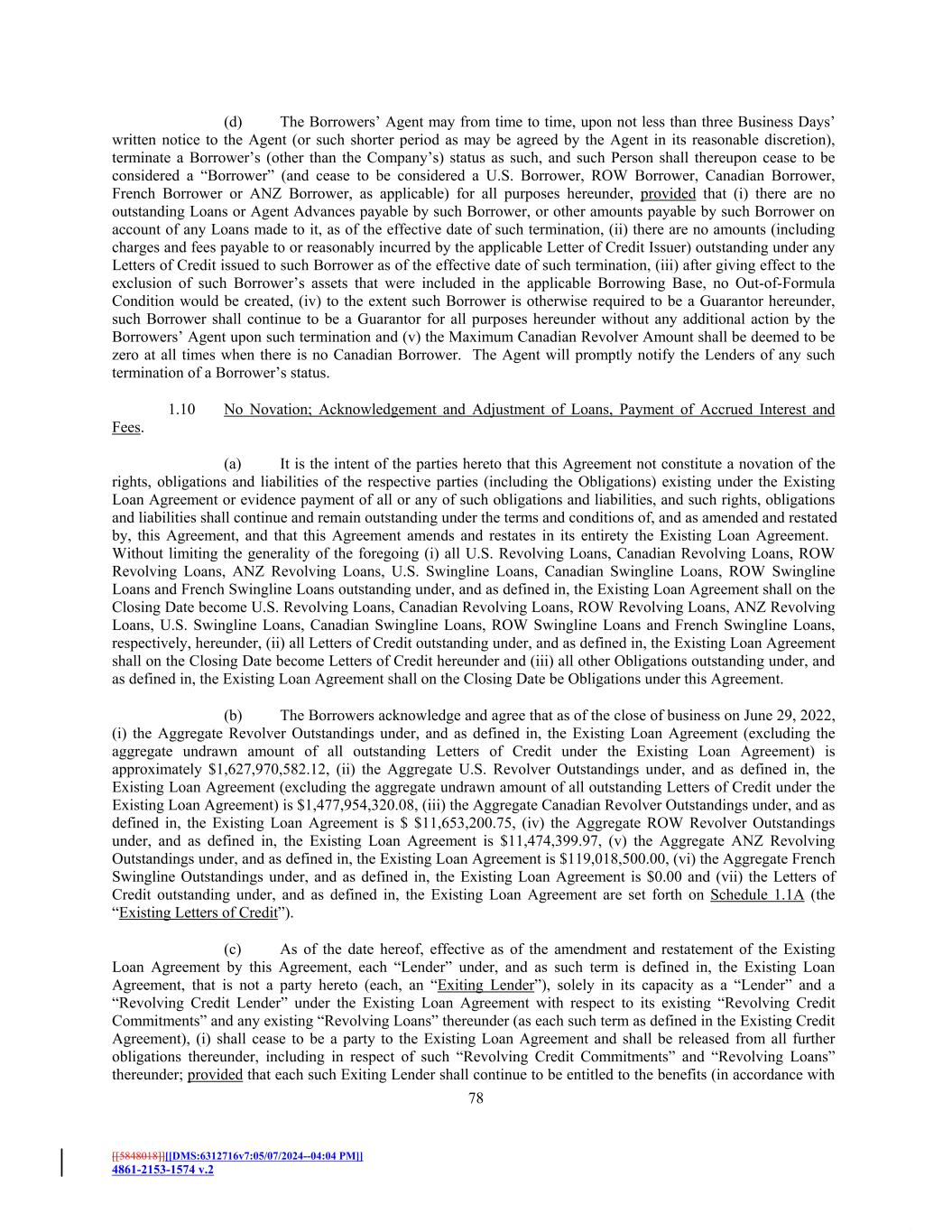 (d) The Borrowers’ Agent may from time to time, upon not less than three Business Days’ written notice to the Agent (or such shorter period as may be agreed by the Agent in its reasonable discretion), terminate a Borrower’s (other than the Company’s) status as such, and such Person shall thereupon cease to be considered a “Borrower” (and cease to be considered a U.S. Borrower, ROW Borrower, Canadian Borrower, French Borrower or ANZ Borrower, as applicable) for all purposes hereunder, provided that (i) there are no outstanding Loans or Agent Advances payable by such Borrower, or other amounts payable by such Borrower on account of any Loans made to it, as of the effective date of such termination, (ii) there are no amounts (including charges and fees payable to or reasonably incurred by the applicable Letter of Credit Issuer) outstanding under any Letters of Credit issued to such Borrower as of the effective date of such termination, (iii) after giving effect to the exclusion of such Borrower’s assets that were included in the applicable Borrowing Base, no Out-of-Formula Condition would be created, (iv) to the extent such Borrower is otherwise required to be a Guarantor hereunder, such Borrower shall continue to be a Guarantor for all purposes hereunder without any additional action by the Borrowers’ Agent upon such termination and (v) the Maximum Canadian Revolver Amount shall be deemed to be zero at all times when there is no Canadian Borrower. The Agent will promptly notify the Lenders of any such termination of a Borrower’s status. 1.10 No Novation; Acknowledgement and Adjustment of Loans, Payment of Accrued Interest and Fees. (a) It is the intent of the parties hereto that this Agreement not constitute a novation of the rights, obligations and liabilities of the respective parties (including the Obligations) existing under the Existing Loan Agreement or evidence payment of all or any of such obligations and liabilities, and such rights, obligations and liabilities shall continue and remain outstanding under the terms and conditions of, and as amended and restated by, this Agreement, and that this Agreement amends and restates in its entirety the Existing Loan Agreement. Without limiting the generality of the foregoing (i) all U.S. Revolving Loans, Canadian Revolving Loans, ROW Revolving Loans, ANZ Revolving Loans, U.S. Swingline Loans, Canadian Swingline Loans, ROW Swingline Loans and French Swingline Loans outstanding under, and as defined in, the Existing Loan Agreement shall on the Closing Date become U.S. Revolving Loans, Canadian Revolving Loans, ROW Revolving Loans, ANZ Revolving Loans, U.S. Swingline Loans, Canadian Swingline Loans, ROW Swingline Loans and French Swingline Loans, respectively, hereunder, (ii) all Letters of Credit outstanding under, and as defined in, the Existing Loan Agreement shall on the Closing Date become Letters of Credit hereunder and (iii) all other Obligations outstanding under, and as defined in, the Existing Loan Agreement shall on the Closing Date be Obligations under this Agreement. (b) The Borrowers acknowledge and agree that as of the close of business on June 29, 2022, (i) the Aggregate Revolver Outstandings under, and as defined in, the Existing Loan Agreement (excluding the aggregate undrawn amount of all outstanding Letters of Credit under the Existing Loan Agreement) is approximately $1,627,970,582.12, (ii) the Aggregate U.S. Revolver Outstandings under, and as defined in, the Existing Loan Agreement (excluding the aggregate undrawn amount of all outstanding Letters of Credit under the Existing Loan Agreement) is $1,477,954,320.08, (iii) the Aggregate Canadian Revolver Outstandings under, and as defined in, the Existing Loan Agreement is $ $11,653,200.75, (iv) the Aggregate ROW Revolver Outstandings under, and as defined in, the Existing Loan Agreement is $11,474,399.97, (v) the Aggregate ANZ Revolving Outstandings under, and as defined in, the Existing Loan Agreement is $119,018,500.00, (vi) the Aggregate French Swingline Outstandings under, and as defined in, the Existing Loan Agreement is $0.00 and (vii) the Letters of Credit outstanding under, and as defined in, the Existing Loan Agreement are set forth on Schedule 1.1A (the “Existing Letters of Credit”). (c) As of the date hereof, effective as of the amendment and restatement of the Existing Loan Agreement by this Agreement, each “Lender” under, and as such term is defined in, the Existing Loan Agreement, that is not a party hereto (each, an “Exiting Lender”), solely in its capacity as a “Lender” and a “Revolving Credit Lender” under the Existing Loan Agreement with respect to its existing “Revolving Credit Commitments” and any existing “Revolving Loans” thereunder (as each such term as defined in the Existing Credit Agreement), (i) shall cease to be a party to the Existing Loan Agreement and shall be released from all further obligations thereunder, including in respect of such “Revolving Credit Commitments” and “Revolving Loans” thereunder; provided that each such Exiting Lender shall continue to be entitled to the benefits (in accordance with 78 [[5848018]][[DMS:6312716v7:05/07/2024--04:04 PM]] 4861-2153-1574 v.2