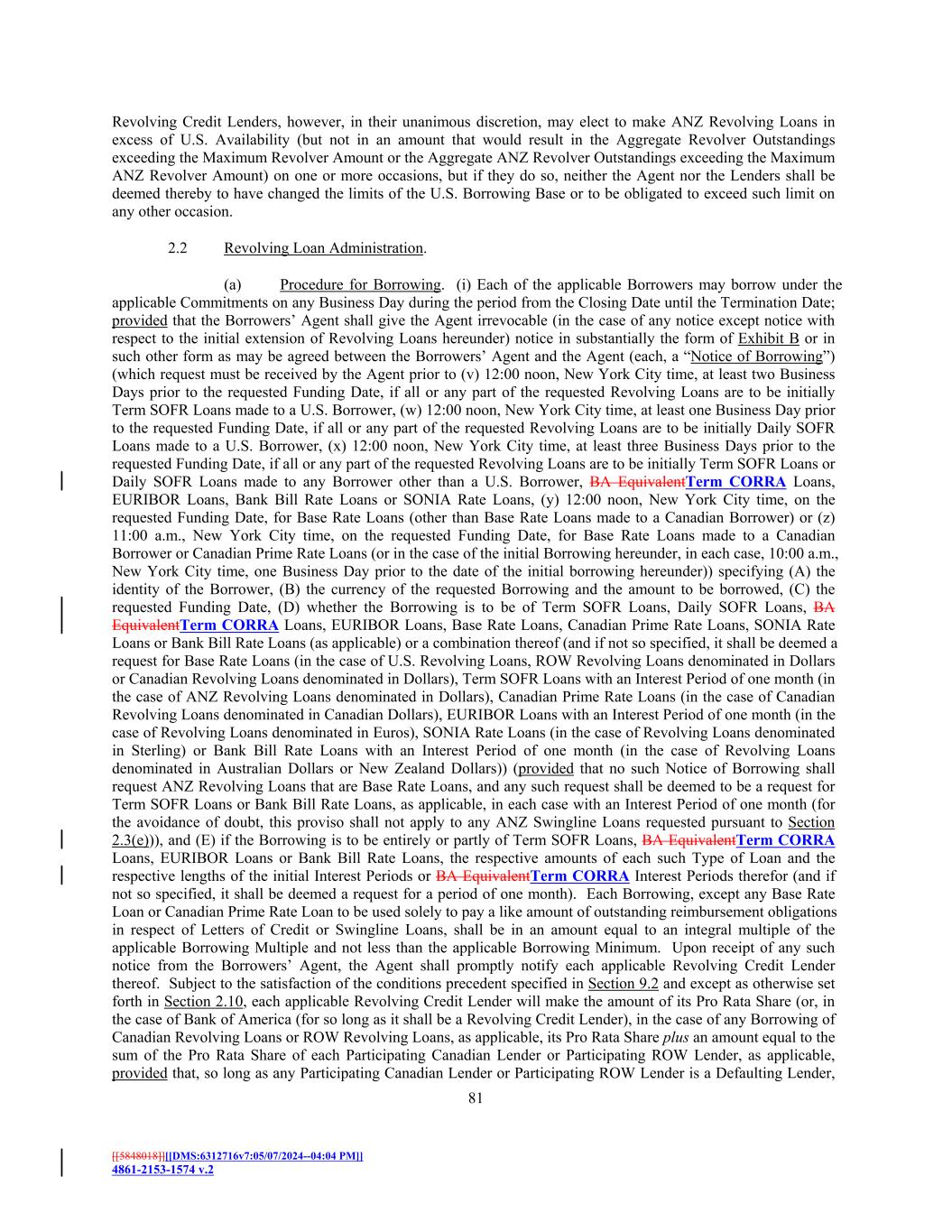 Revolving Credit Lenders, however, in their unanimous discretion, may elect to make ANZ Revolving Loans in excess of U.S. Availability (but not in an amount that would result in the Aggregate Revolver Outstandings exceeding the Maximum Revolver Amount or the Aggregate ANZ Revolver Outstandings exceeding the Maximum ANZ Revolver Amount) on one or more occasions, but if they do so, neither the Agent nor the Lenders shall be deemed thereby to have changed the limits of the U.S. Borrowing Base or to be obligated to exceed such limit on any other occasion. 2.2 Revolving Loan Administration. (a) Procedure for Borrowing. (i) Each of the applicable Borrowers may borrow under the applicable Commitments on any Business Day during the period from the Closing Date until the Termination Date; provided that the Borrowers’ Agent shall give the Agent irrevocable (in the case of any notice except notice with respect to the initial extension of Revolving Loans hereunder) notice in substantially the form of Exhibit B or in such other form as may be agreed between the Borrowers’ Agent and the Agent (each, a “Notice of Borrowing”) (which request must be received by the Agent prior to (v) 12:00 noon, New York City time, at least two Business Days prior to the requested Funding Date, if all or any part of the requested Revolving Loans are to be initially Term SOFR Loans made to a U.S. Borrower, (w) 12:00 noon, New York City time, at least one Business Day prior to the requested Funding Date, if all or any part of the requested Revolving Loans are to be initially Daily SOFR Loans made to a U.S. Borrower, (x) 12:00 noon, New York City time, at least three Business Days prior to the requested Funding Date, if all or any part of the requested Revolving Loans are to be initially Term SOFR Loans or Daily SOFR Loans made to any Borrower other than a U.S. Borrower, BA EquivalentTerm CORRA Loans, EURIBOR Loans, Bank Bill Rate Loans or SONIA Rate Loans, (y) 12:00 noon, New York City time, on the requested Funding Date, for Base Rate Loans (other than Base Rate Loans made to a Canadian Borrower) or (z) 11:00 a.m., New York City time, on the requested Funding Date, for Base Rate Loans made to a Canadian Borrower or Canadian Prime Rate Loans (or in the case of the initial Borrowing hereunder, in each case, 10:00 a.m., New York City time, one Business Day prior to the date of the initial borrowing hereunder)) specifying (A) the identity of the Borrower, (B) the currency of the requested Borrowing and the amount to be borrowed, (C) the requested Funding Date, (D) whether the Borrowing is to be of Term SOFR Loans, Daily SOFR Loans, BA EquivalentTerm CORRA Loans, EURIBOR Loans, Base Rate Loans, Canadian Prime Rate Loans, SONIA Rate Loans or Bank Bill Rate Loans (as applicable) or a combination thereof (and if not so specified, it shall be deemed a request for Base Rate Loans (in the case of U.S. Revolving Loans, ROW Revolving Loans denominated in Dollars or Canadian Revolving Loans denominated in Dollars), Term SOFR Loans with an Interest Period of one month (in the case of ANZ Revolving Loans denominated in Dollars), Canadian Prime Rate Loans (in the case of Canadian Revolving Loans denominated in Canadian Dollars), EURIBOR Loans with an Interest Period of one month (in the case of Revolving Loans denominated in Euros), SONIA Rate Loans (in the case of Revolving Loans denominated in Sterling) or Bank Bill Rate Loans with an Interest Period of one month (in the case of Revolving Loans denominated in Australian Dollars or New Zealand Dollars)) (provided that no such Notice of Borrowing shall request ANZ Revolving Loans that are Base Rate Loans, and any such request shall be deemed to be a request for Term SOFR Loans or Bank Bill Rate Loans, as applicable, in each case with an Interest Period of one month (for the avoidance of doubt, this proviso shall not apply to any ANZ Swingline Loans requested pursuant to Section 2.3(e))), and (E) if the Borrowing is to be entirely or partly of Term SOFR Loans, BA EquivalentTerm CORRA Loans, EURIBOR Loans or Bank Bill Rate Loans, the respective amounts of each such Type of Loan and the respective lengths of the initial Interest Periods or BA EquivalentTerm CORRA Interest Periods therefor (and if not so specified, it shall be deemed a request for a period of one month). Each Borrowing, except any Base Rate Loan or Canadian Prime Rate Loan to be used solely to pay a like amount of outstanding reimbursement obligations in respect of Letters of Credit or Swingline Loans, shall be in an amount equal to an integral multiple of the applicable Borrowing Multiple and not less than the applicable Borrowing Minimum. Upon receipt of any such notice from the Borrowers’ Agent, the Agent shall promptly notify each applicable Revolving Credit Lender thereof. Subject to the satisfaction of the conditions precedent specified in Section 9.2 and except as otherwise set forth in Section 2.10, each applicable Revolving Credit Lender will make the amount of its Pro Rata Share (or, in the case of Bank of America (for so long as it shall be a Revolving Credit Lender), in the case of any Borrowing of Canadian Revolving Loans or ROW Revolving Loans, as applicable, its Pro Rata Share plus an amount equal to the sum of the Pro Rata Share of each Participating Canadian Lender or Participating ROW Lender, as applicable, provided that, so long as any Participating Canadian Lender or Participating ROW Lender is a Defaulting Lender, 81 [[5848018]][[DMS:6312716v7:05/07/2024--04:04 PM]] 4861-2153-1574 v.2