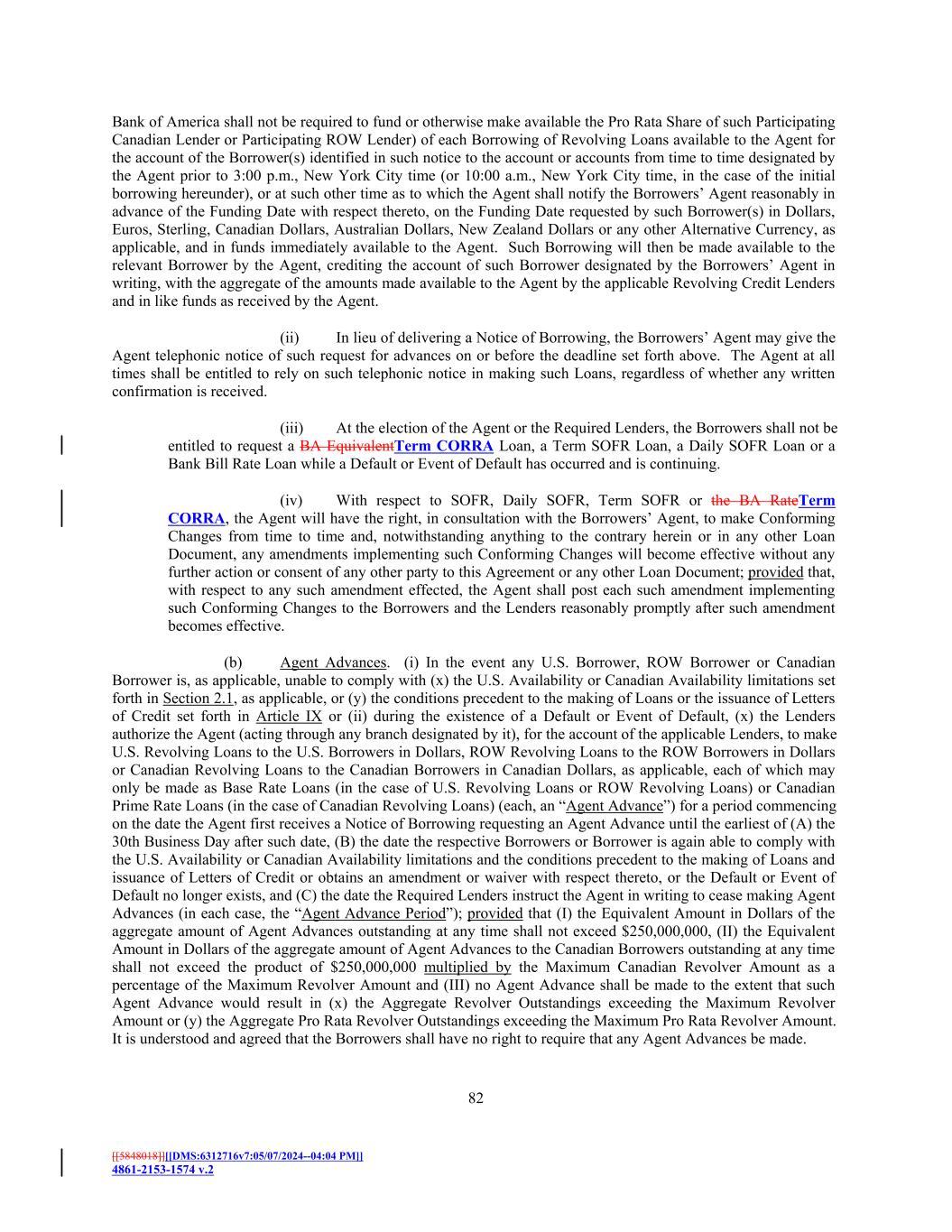 Bank of America shall not be required to fund or otherwise make available the Pro Rata Share of such Participating Canadian Lender or Participating ROW Lender) of each Borrowing of Revolving Loans available to the Agent for the account of the Borrower(s) identified in such notice to the account or accounts from time to time designated by the Agent prior to 3:00 p.m., New York City time (or 10:00 a.m., New York City time, in the case of the initial borrowing hereunder), or at such other time as to which the Agent shall notify the Borrowers’ Agent reasonably in advance of the Funding Date with respect thereto, on the Funding Date requested by such Borrower(s) in Dollars, Euros, Sterling, Canadian Dollars, Australian Dollars, New Zealand Dollars or any other Alternative Currency, as applicable, and in funds immediately available to the Agent. Such Borrowing will then be made available to the relevant Borrower by the Agent, crediting the account of such Borrower designated by the Borrowers’ Agent in writing, with the aggregate of the amounts made available to the Agent by the applicable Revolving Credit Lenders and in like funds as received by the Agent. (ii) In lieu of delivering a Notice of Borrowing, the Borrowers’ Agent may give the Agent telephonic notice of such request for advances on or before the deadline set forth above. The Agent at all times shall be entitled to rely on such telephonic notice in making such Loans, regardless of whether any written confirmation is received. (iii) At the election of the Agent or the Required Lenders, the Borrowers shall not be entitled to request a BA EquivalentTerm CORRA Loan, a Term SOFR Loan, a Daily SOFR Loan or a Bank Bill Rate Loan while a Default or Event of Default has occurred and is continuing. (iv) With respect to SOFR, Daily SOFR, Term SOFR or the BA RateTerm CORRA, the Agent will have the right, in consultation with the Borrowers’ Agent, to make Conforming Changes from time to time and, notwithstanding anything to the contrary herein or in any other Loan Document, any amendments implementing such Conforming Changes will become effective without any further action or consent of any other party to this Agreement or any other Loan Document; provided that, with respect to any such amendment effected, the Agent shall post each such amendment implementing such Conforming Changes to the Borrowers and the Lenders reasonably promptly after such amendment becomes effective. (b) Agent Advances. (i) In the event any U.S. Borrower, ROW Borrower or Canadian Borrower is, as applicable, unable to comply with (x) the U.S. Availability or Canadian Availability limitations set forth in Section 2.1, as applicable, or (y) the conditions precedent to the making of Loans or the issuance of Letters of Credit set forth in Article IX or (ii) during the existence of a Default or Event of Default, (x) the Lenders authorize the Agent (acting through any branch designated by it), for the account of the applicable Lenders, to make U.S. Revolving Loans to the U.S. Borrowers in Dollars, ROW Revolving Loans to the ROW Borrowers in Dollars or Canadian Revolving Loans to the Canadian Borrowers in Canadian Dollars, as applicable, each of which may only be made as Base Rate Loans (in the case of U.S. Revolving Loans or ROW Revolving Loans) or Canadian Prime Rate Loans (in the case of Canadian Revolving Loans) (each, an “Agent Advance”) for a period commencing on the date the Agent first receives a Notice of Borrowing requesting an Agent Advance until the earliest of (A) the 30th Business Day after such date, (B) the date the respective Borrowers or Borrower is again able to comply with the U.S. Availability or Canadian Availability limitations and the conditions precedent to the making of Loans and issuance of Letters of Credit or obtains an amendment or waiver with respect thereto, or the Default or Event of Default no longer exists, and (C) the date the Required Lenders instruct the Agent in writing to cease making Agent Advances (in each case, the “Agent Advance Period”); provided that (I) the Equivalent Amount in Dollars of the aggregate amount of Agent Advances outstanding at any time shall not exceed $250,000,000, (II) the Equivalent Amount in Dollars of the aggregate amount of Agent Advances to the Canadian Borrowers outstanding at any time shall not exceed the product of $250,000,000 multiplied by the Maximum Canadian Revolver Amount as a percentage of the Maximum Revolver Amount and (III) no Agent Advance shall be made to the extent that such Agent Advance would result in (x) the Aggregate Revolver Outstandings exceeding the Maximum Revolver Amount or (y) the Aggregate Pro Rata Revolver Outstandings exceeding the Maximum Pro Rata Revolver Amount. It is understood and agreed that the Borrowers shall have no right to require that any Agent Advances be made. 82 [[5848018]][[DMS:6312716v7:05/07/2024--04:04 PM]] 4861-2153-1574 v.2