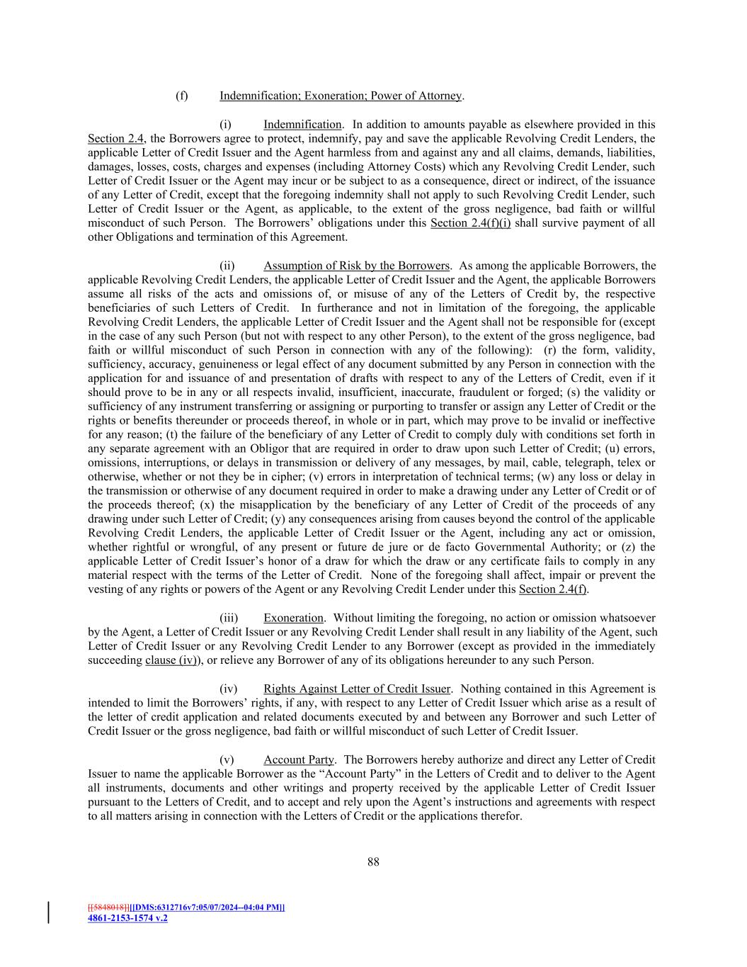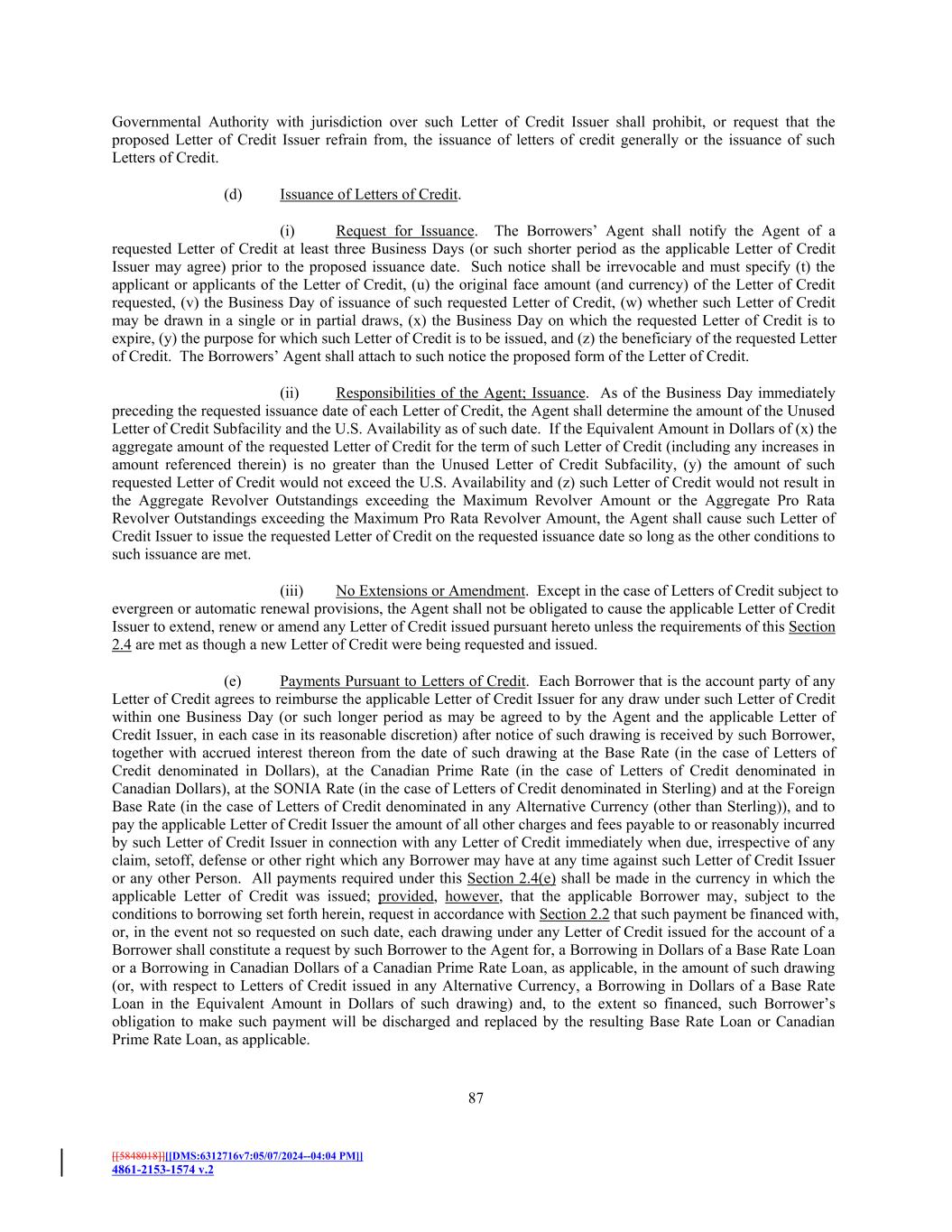 Governmental Authority with jurisdiction over such Letter of Credit Issuer shall prohibit, or request that the proposed Letter of Credit Issuer refrain from, the issuance of letters of credit generally or the issuance of such Letters of Credit. (d) Issuance of Letters of Credit. (i) Request for Issuance. The Borrowers’ Agent shall notify the Agent of a requested Letter of Credit at least three Business Days (or such shorter period as the applicable Letter of Credit Issuer may agree) prior to the proposed issuance date. Such notice shall be irrevocable and must specify (t) the applicant or applicants of the Letter of Credit, (u) the original face amount (and currency) of the Letter of Credit requested, (v) the Business Day of issuance of such requested Letter of Credit, (w) whether such Letter of Credit may be drawn in a single or in partial draws, (x) the Business Day on which the requested Letter of Credit is to expire, (y) the purpose for which such Letter of Credit is to be issued, and (z) the beneficiary of the requested Letter of Credit. The Borrowers’ Agent shall attach to such notice the proposed form of the Letter of Credit. (ii) Responsibilities of the Agent; Issuance. As of the Business Day immediately preceding the requested issuance date of each Letter of Credit, the Agent shall determine the amount of the Unused Letter of Credit Subfacility and the U.S. Availability as of such date. If the Equivalent Amount in Dollars of (x) the aggregate amount of the requested Letter of Credit for the term of such Letter of Credit (including any increases in amount referenced therein) is no greater than the Unused Letter of Credit Subfacility, (y) the amount of such requested Letter of Credit would not exceed the U.S. Availability and (z) such Letter of Credit would not result in the Aggregate Revolver Outstandings exceeding the Maximum Revolver Amount or the Aggregate Pro Rata Revolver Outstandings exceeding the Maximum Pro Rata Revolver Amount, the Agent shall cause such Letter of Credit Issuer to issue the requested Letter of Credit on the requested issuance date so long as the other conditions to such issuance are met. (iii) No Extensions or Amendment. Except in the case of Letters of Credit subject to evergreen or automatic renewal provisions, the Agent shall not be obligated to cause the applicable Letter of Credit Issuer to extend, renew or amend any Letter of Credit issued pursuant hereto unless the requirements of this Section 2.4 are met as though a new Letter of Credit were being requested and issued. (e) Payments Pursuant to Letters of Credit. Each Borrower that is the account party of any Letter of Credit agrees to reimburse the applicable Letter of Credit Issuer for any draw under such Letter of Credit within one Business Day (or such longer period as may be agreed to by the Agent and the applicable Letter of Credit Issuer, in each case in its reasonable discretion) after notice of such drawing is received by such Borrower, together with accrued interest thereon from the date of such drawing at the Base Rate (in the case of Letters of Credit denominated in Dollars), at the Canadian Prime Rate (in the case of Letters of Credit denominated in Canadian Dollars), at the SONIA Rate (in the case of Letters of Credit denominated in Sterling) and at the Foreign Base Rate (in the case of Letters of Credit denominated in any Alternative Currency (other than Sterling)), and to pay the applicable Letter of Credit Issuer the amount of all other charges and fees payable to or reasonably incurred by such Letter of Credit Issuer in connection with any Letter of Credit immediately when due, irrespective of any claim, setoff, defense or other right which any Borrower may have at any time against such Letter of Credit Issuer or any other Person. All payments required under this Section 2.4(e) shall be made in the currency in which the applicable Letter of Credit was issued; provided, however, that the applicable Borrower may, subject to the conditions to borrowing set forth herein, request in accordance with Section 2.2 that such payment be financed with, or, in the event not so requested on such date, each drawing under any Letter of Credit issued for the account of a Borrower shall constitute a request by such Borrower to the Agent for, a Borrowing in Dollars of a Base Rate Loan or a Borrowing in Canadian Dollars of a Canadian Prime Rate Loan, as applicable, in the amount of such drawing (or, with respect to Letters of Credit issued in any Alternative Currency, a Borrowing in Dollars of a Base Rate Loan in the Equivalent Amount in Dollars of such drawing) and, to the extent so financed, such Borrower’s obligation to make such payment will be discharged and replaced by the resulting Base Rate Loan or Canadian Prime Rate Loan, as applicable. 87 [[5848018]][[DMS:6312716v7:05/07/2024--04:04 PM]] 4861-2153-1574 v.2