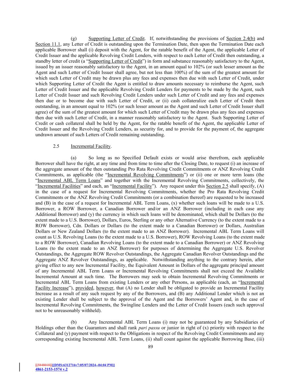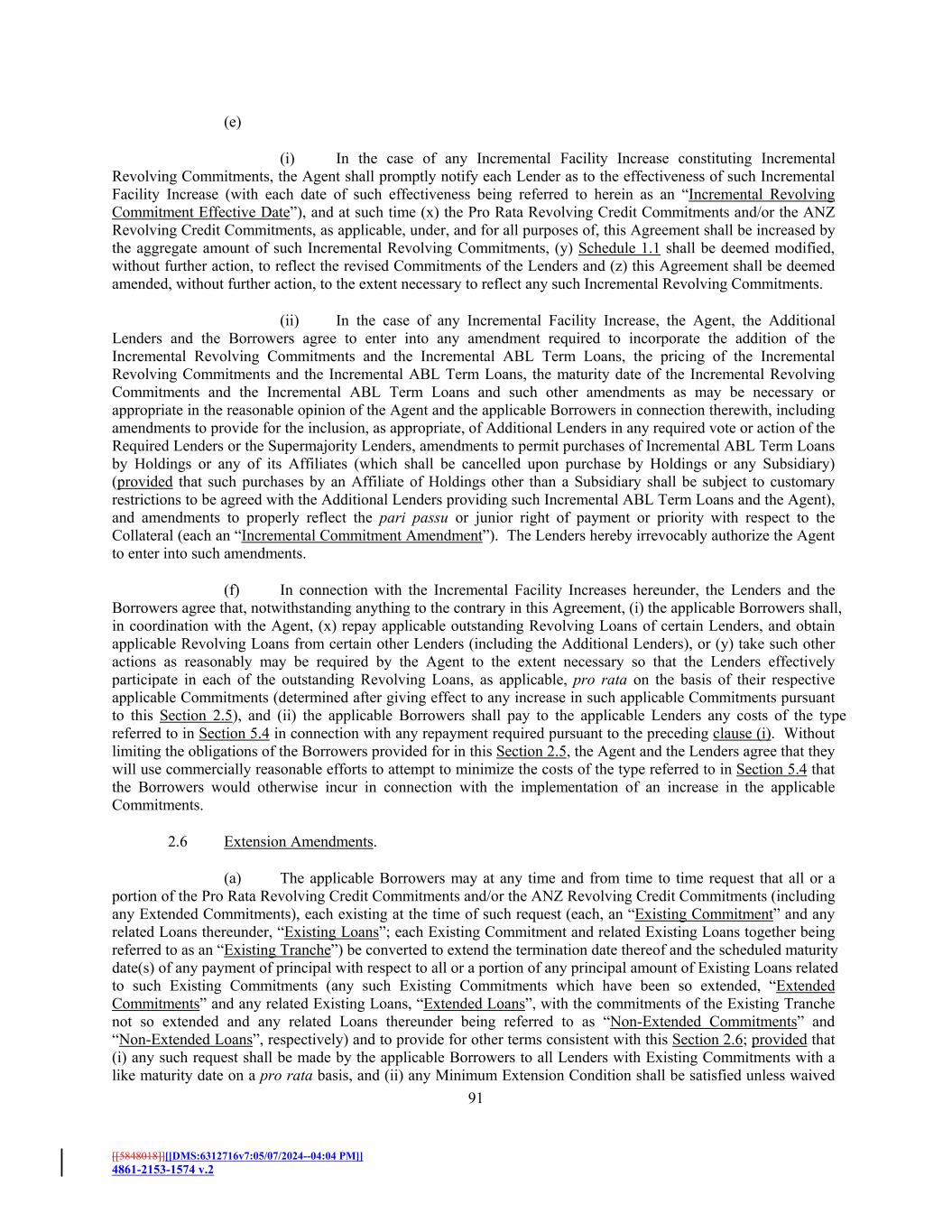 (H) shall have an Applicable Margin determined by the applicable Borrowers and the applicable Refinancing Revolving Lenders, and (I) shall not be subject to any guarantee by any person other than an Obligor and shall not include any borrower other than a Borrower hereunder. (f) Commitments in respect of Refinancing Term Loans and Refinancing Revolving Commitments shall become additional Commitments under this Agreement pursuant to an amendment (a “Refinancing Amendment”) to this Agreement and, as appropriate, the other Loan Documents, executed by the applicable Borrowers, each Refinancing Lender providing such Commitments and the Agent. The Refinancing Amendment may, without the consent of any other Obligor, agent or Lender, effect such amendments to this Agreement and the other Loan Documents as may be necessary or appropriate, in the reasonable opinion of the Agent and the applicable Borrowers, to effect the provisions of this Section 2.7, including, if applicable, amendments as deemed necessary by the Agent in its reasonable judgment to effect (i) any lien subordination and associated rights of the applicable Lenders to the extent any Refinancing Loans are to rank junior in right of security and (ii) that any Previously Absent Financial Maintenance Covenant does not benefit any term loan hereunder. The applicable Borrowers will use the proceeds, if any, of the Refinancing Term Loans and Refinancing Revolving Commitments in exchange for, or to extend, renew, replace, repurchase, retire or refinance, and shall permanently terminate applicable commitments under, substantially concurrently, the applicable Refinanced Debt. In the event any Refinancing Revolving Commitments extend beyond the Maturity Date, any applicable Refinancing Amendment may provide that the maturity date for Swingline Loans and/or Letters of Credit may be extended and the related obligations to make Swingline Loans and issue Letters of Credit may be continued so long as the U.S. Swingline Lender, the ROW Swingline Lender, the Canadian Swingline Lender, the French Swingline Lender, the ANZ Swingline Lender and/or the applicable Letter of Credit Issuer, as applicable, have consented to such extensions in their sole discretion (it being understood that no consent of any other Lender shall be required in connection with any such extension). (g) Upon any Refinancing Closing Date on which Refinancing Revolving Commitments are effected through the establishment of a new class of revolving commitments pursuant to this Section 2.7, (i) if, on such date, there are any applicable Revolving Loans outstanding, such Revolving Loans shall be prepaid from the proceeds of new Refinancing Revolving Loans under such new class of Refinancing Revolving Commitments in such amounts as shall be necessary in order that, after giving effect to such Loans and all such related prepayments, all applicable Revolving Loans will be held by all applicable Lenders under the applicable Revolving Credit Commitments (including Lenders providing such Refinancing Revolving Commitments) ratably in accordance with their applicable Revolving Credit Commitments (after giving effect to the establishment of such Refinancing Revolving Commitments), (ii) in the case of a Revolving Credit Commitment, there shall be an automatic adjustment to the participations hereunder in applicable Letters of Credit and applicable Swingline Loans held by each applicable Lender under the applicable Revolving Credit Commitments so that each such Lender shares ratably in such participations in accordance with their applicable Revolving Credit Commitments (after giving effect to the establishment of such Refinancing Revolving Commitments), (iii) each Refinancing Revolving Commitment shall be deemed for all purposes a Revolving Credit Commitment and each Loan made thereunder shall be deemed, for all purposes, a Revolving Loan and (iv) each Refinancing Revolving Lender shall become a Lender with respect to the Refinancing Revolving Commitments and all matters relating thereto. 2.8 [Intentionally Omitted]. 2.9 Reserves. Other than with respect to Pari Passu Debt Reserves and Waterfall Priority Hedge Agreement Reserves (which shall be established and changed as set forth in the respective definitions thereof and not in accordance with this Section 2.9 (including any requirement that they be established or changed in the exercise of the Agent’s Reasonable Credit Judgment)), the Agent may establish Reserves or change any of the Reserves, in the exercise of its Reasonable Credit Judgment. Notwithstanding the foregoing, Reserves (other than Pari Passu Debt Reserves and Waterfall Priority Hedge Agreement Reserves) shall not be established or changed after the Closing Date except upon not less than five Business Days’ notice to the Borrowers. The Agent will be available during such period to discuss any such proposed Reserve or change with the Borrowers and, without 98 [[5848018]][[DMS:6312716v7:05/07/2024--04:04 PM]] 4861-2153-1574 v.2
