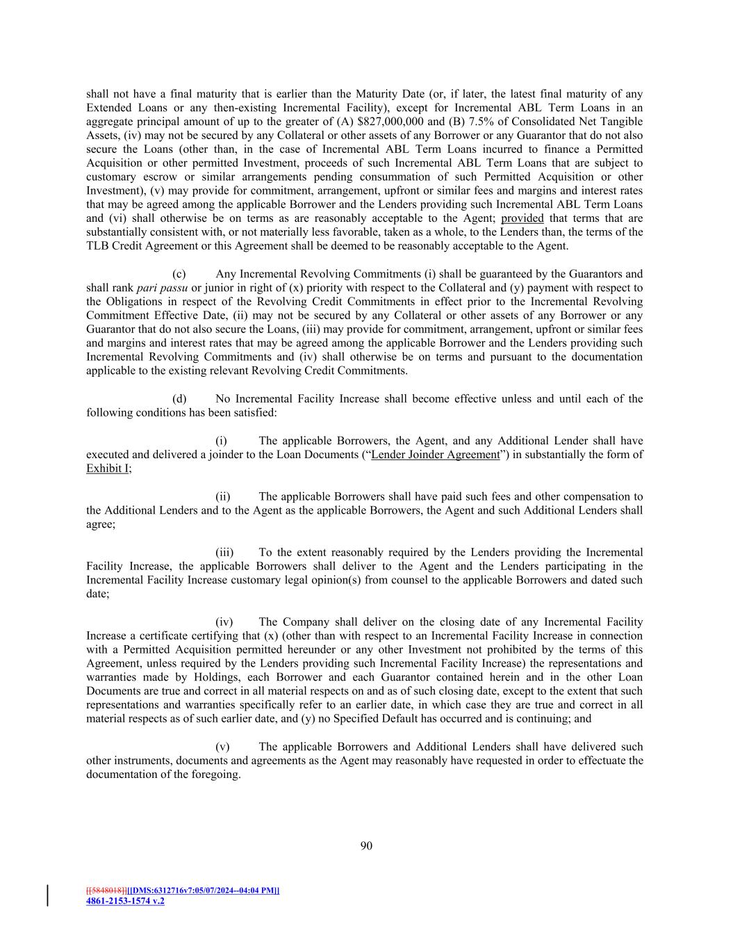 “Incremental ABL Term Loans” has the meaning specified in Section 2.5(a). “Incremental Commitment Amendment” has the meaning specified in Section 2.5(e)(ii). “Incremental Facility” and “Incremental Facilities” have the meanings specified in Section 2.5(a). “Incremental Facility Increase” has the meaning specified in Section 2.5(a). “Incremental Indebtedness” means any Indebtedness incurred by any Borrower pursuant to and in accordance with Section 2.5. “Incremental Revolving Commitment Effective Date” has the meaning specified in Section 2.5(e)(i). “Incremental Revolving Commitments” has the meaning specified in Section 2.5(a). “Indebtedness” means, without duplication, (a) all indebtedness for borrowed money or the deferred purchase price of property, excluding trade payables and the endorsement of checks and other similar instruments in the ordinary course of business; i) all obligations and liabilities of any other Person secured by any Lien on an Obligor’s or any of its Subsidiaries’ property, even if such Obligor or Subsidiary shall not have assumed or become liable for the payment thereof (the amount of such obligation being deemed to be the lesser of the value of such property (as determined in good faith by the Company) or the amount of the obligation so secured); i) all obligations or liabilities created or arising under any Capital Lease; i) all indebtedness created or arising under any conditional sale or other title retention agreement with respect to property acquired by such Person (even if the rights and remedies of the seller or lender under such agreement in the event of default are limited to repossession or sale of such property), but excluding trade accounts payable arising in the ordinary course of business; i) all obligations of such Person for the reimbursement of any obligor on any letter of credit, banker’s acceptance or similar credit transaction; i) all net obligations of such Person in respect of Hedge Agreements; and i) all obligations and liabilities under Guarantees in respect of obligations of the type described in any of clauses (a) through (f) above. “Indemnified Liabilities” has the meaning specified in Section 14.10. “Indemnified Person” has the meaning specified in Section 14.10. “Indemnified Taxes” means (a) all Taxes other than Excluded Taxes and (a) to the extent not otherwise described in clause (a), Other Taxes. “Instruments” means all instruments as such term is defined in Article 9 of the UCC or as is defined in the PPSA, as applicable, now owned or hereafter acquired by any Borrower, any Guarantor or any of their Subsidiaries. “Intercreditor Agreement Supplement” has the meaning specified in Section 13.17(b). “Interest Payment Date” means, with respect to any Term SOFR Loan or EURIBOR Loan, the Termination Date and the last day of each Interest Period applicable to such Loan and, with respect to each Interest Period of more than three months, each three-month anniversary of the commencement of such Interest Period for such Loan. “Interest Period” means, as to any Term SOFR Loan, EURIBOR Loan or Bank Bill Rate Loan, the period commencing on the Funding Date of such Loan or on the Continuation/Conversion Date on which the Loan is converted into or continued as a Term SOFR Loan, EURIBOR Loan or Bank Bill Rate Loan, as applicable, and ending on (i) the date ending on the numerically corresponding day in the calendar month that is one, three or six months thereafter (in each case subject to the availability thereof), or (ii) in the case of Term SOFR Loans only, if such tenor has become available, is agreed to by all the Lenders making or holding such Loan, and is determined to be administratively feasible for the Agent in its sole discretion, ending on the date one or two weeks thereafter, as 39 [[5848018]][[DMS:6312716v7:05/07/2024--04:04 PM]] 4861-2153-1574 v.2