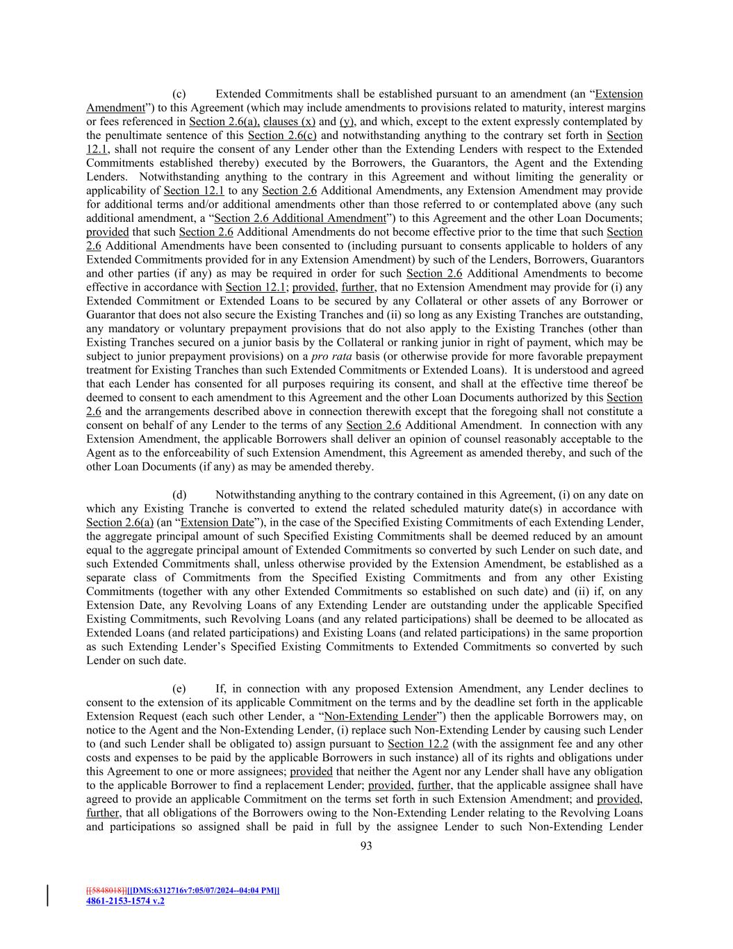 effected, subject to the satisfaction of the terms and conditions in this Section 2.7, (i) each Refinancing Term Lender of such class shall make a term loan, severally, but not jointly or jointly and severally with the other Refinancing Term Lenders, to the applicable Borrowers (a “Refinancing Term Loan”) in an amount equal to its Refinancing Term Commitment of such class and (ii) each Refinancing Term Lender of such class shall become a Lender hereunder with respect to the Refinancing Term Commitment of such class and the Refinancing Term Loans of such class made pursuant thereto. On any Refinancing Closing Date on which any Refinancing Revolving Commitments of any class are effected, subject to the satisfaction of the terms and conditions in this Section 2.7, (x) each Refinancing Revolving Lender of such class shall make its Refinancing Revolving Commitment available to the applicable Borrowers (when borrowed, a “Refinancing Revolving Loan” and collectively with any Refinancing Term Loan, a “Refinancing Loan”) and (y) each Refinancing Revolving Lender of such class shall become a Lender hereunder with respect to the Refinancing Revolving Commitment of such class and the Refinancing Revolving Loans of such class made pursuant thereto. (c) Each Refinancing Loan Request from the Borrowers’ Agent pursuant to this Section 2.7 shall set forth the requested amount and proposed terms of the relevant Refinancing Term Loans or Refinancing Revolving Commitments and identify the proposed Refinanced Debt with respect thereto. Refinancing Term Loans may be made, and Refinancing Revolving Commitments may be provided, by any existing Lender (but no existing Lender will have an obligation to make any Refinancing Commitment, nor will the Borrowers have any obligation to approach any existing Lender to provide any Refinancing Commitment) or by any additional Lender (each such Additional Lender providing such Refinancing Commitment or Refinancing Term Loan, a “Refinancing Revolving Lender” or “Refinancing Term Lender”, as applicable, and, collectively, “Refinancing Lenders”); provided that the Agent shall have consented (not to be unreasonably conditioned, withheld or delayed) to such Lender’s or Additional Lender’s making such Refinancing Term Loans or providing such Refinancing Revolving Commitments to the extent such consent, if any, would be required under Section 12.2 for an assignment of Loans or Revolving Credit Commitments, as applicable, to such Additional Lender. (d) The effectiveness of any Refinancing Amendment, and the Refinancing Commitments thereunder, shall be subject to the satisfaction on the date thereof (a “Refinancing Closing Date”) of each of the following conditions, together with any other conditions set forth in the Refinancing Amendment: (i) after giving effect to such Refinancing Commitments, the conditions of Sections 9.2(a)(i) and 9.2(a)(ii) shall be satisfied (it being understood that all references to “the date of such extension of credit” or similar language in such Section 9.2(a) shall be deemed to refer to the applicable Refinancing Closing Date); (ii) each Refinancing Commitment shall be in an aggregate principal amount that is not less than $5,000,000 and shall be in an increment of $1,000,000 (provided that such amount may be less than $5,000,000 and not in an increment of $1,000,000 if such amount is equal to (x) the entire outstanding principal amount of Refinanced Debt that is in the form of term loans or (y) the entire outstanding principal amount of Refinanced Debt (or commitments) that is in the form of Revolving Credit Commitments); and (iii) the principal amount (or accreted value, if applicable) of such Refinancing Indebtedness does not exceed the principal amount (or accreted value, if applicable) of the Refinanced Debt (plus the amount of unpaid accrued or capitalized interest and premiums thereon (including make-whole premiums, prepayment premiums, tender premiums and amounts required to be paid in connection with defeasance and satisfaction and discharge), underwriting discounts, original issue discount, defeasance costs, fees (including upfront fees), commissions and expenses). (e) The terms, provisions and documentation of the Refinancing Term Loans and Refinancing Term Commitments or the Refinancing Revolving Loans and Refinancing Revolving Commitments, as the case may be, of any class shall be as agreed between the Borrowers, the applicable Refinancing Lenders providing such Refinancing Commitments and the Agent (in the case of the Agent, only with respect to terms and provisions not otherwise specified in this Section 2.7 that adversely affect the rights or obligations of the Agent), and except as otherwise set forth herein, to the extent not substantially identical to any class of term loans or 95 [[5848018]][[DMS:6312716v7:05/07/2024--04:04 PM]] 4861-2153-1574 v.2