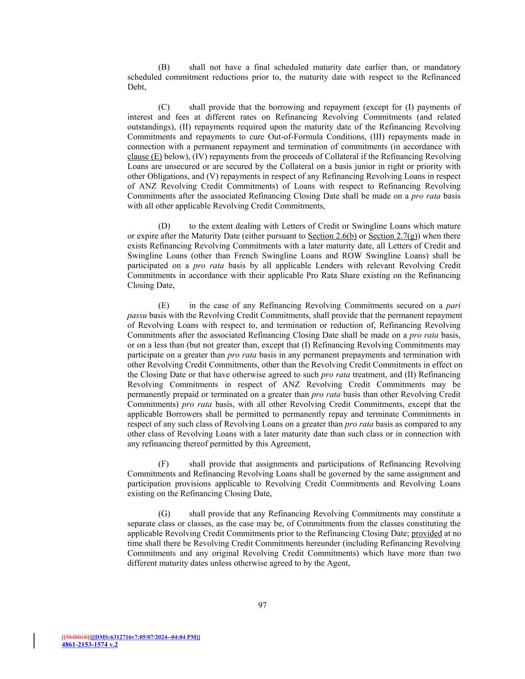 (B) shall not have a final scheduled maturity date earlier than, or mandatory scheduled commitment reductions prior to, the maturity date with respect to the Refinanced Debt, (C) shall provide that the borrowing and repayment (except for (I) payments of interest and fees at different rates on Refinancing Revolving Commitments (and related outstandings), (II) repayments required upon the maturity date of the Refinancing Revolving Commitments and repayments to cure Out-of-Formula Conditions, (III) repayments made in connection with a permanent repayment and termination of commitments (in accordance with clause (E) below), (IV) repayments from the proceeds of Collateral if the Refinancing Revolving Loans are unsecured or are secured by the Collateral on a basis junior in right or priority with other Obligations, and (V) repayments in respect of any Refinancing Revolving Loans in respect of ANZ Revolving Credit Commitments) of Loans with respect to Refinancing Revolving Commitments after the associated Refinancing Closing Date shall be made on a pro rata basis with all other applicable Revolving Credit Commitments, (D) to the extent dealing with Letters of Credit or Swingline Loans which mature or expire after the Maturity Date (either pursuant to Section 2.6(b) or Section 2.7(g)) when there exists Refinancing Revolving Commitments with a later maturity date, all Letters of Credit and Swingline Loans (other than French Swingline Loans and ROW Swingline Loans) shall be participated on a pro rata basis by all applicable Lenders with relevant Revolving Credit Commitments in accordance with their applicable Pro Rata Share existing on the Refinancing Closing Date, (E) in the case of any Refinancing Revolving Commitments secured on a pari passu basis with the Revolving Credit Commitments, shall provide that the permanent repayment of Revolving Loans with respect to, and termination or reduction of, Refinancing Revolving Commitments after the associated Refinancing Closing Date shall be made on a pro rata basis, or on a less than (but not greater than, except that (I) Refinancing Revolving Commitments may participate on a greater than pro rata basis in any permanent prepayments and termination with other Revolving Credit Commitments, other than the Revolving Credit Commitments in effect on the Closing Date or that have otherwise agreed to such pro rata treatment, and (II) Refinancing Revolving Commitments in respect of ANZ Revolving Credit Commitments may be permanently prepaid or terminated on a greater than pro rata basis than other Revolving Credit Commitments) pro rata basis, with all other Revolving Credit Commitments, except that the applicable Borrowers shall be permitted to permanently repay and terminate Commitments in respect of any such class of Revolving Loans on a greater than pro rata basis as compared to any other class of Revolving Loans with a later maturity date than such class or in connection with any refinancing thereof permitted by this Agreement, (F) shall provide that assignments and participations of Refinancing Revolving Commitments and Refinancing Revolving Loans shall be governed by the same assignment and participation provisions applicable to Revolving Credit Commitments and Revolving Loans existing on the Refinancing Closing Date, (G) shall provide that any Refinancing Revolving Commitments may constitute a separate class or classes, as the case may be, of Commitments from the classes constituting the applicable Revolving Credit Commitments prior to the Refinancing Closing Date; provided at no time shall there be Revolving Credit Commitments hereunder (including Refinancing Revolving Commitments and any original Revolving Credit Commitments) which have more than two different maturity dates unless otherwise agreed to by the Agent, 97 [[5848018]][[DMS:6312716v7:05/07/2024--04:04 PM]] 4861-2153-1574 v.2