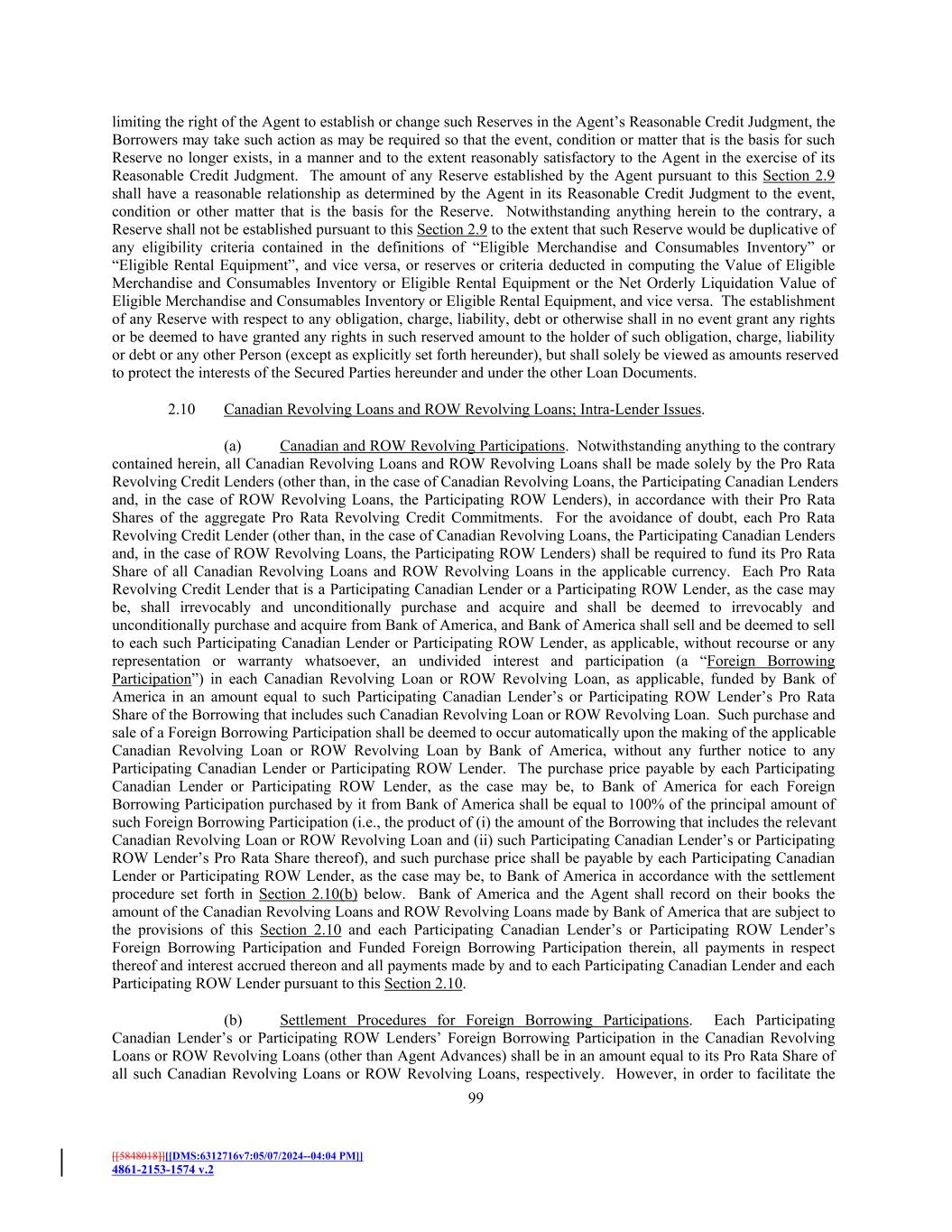 limiting the right of the Agent to establish or change such Reserves in the Agent’s Reasonable Credit Judgment, the Borrowers may take such action as may be required so that the event, condition or matter that is the basis for such Reserve no longer exists, in a manner and to the extent reasonably satisfactory to the Agent in the exercise of its Reasonable Credit Judgment. The amount of any Reserve established by the Agent pursuant to this Section 2.9 shall have a reasonable relationship as determined by the Agent in its Reasonable Credit Judgment to the event, condition or other matter that is the basis for the Reserve. Notwithstanding anything herein to the contrary, a Reserve shall not be established pursuant to this Section 2.9 to the extent that such Reserve would be duplicative of any eligibility criteria contained in the definitions of “Eligible Merchandise and Consumables Inventory” or “Eligible Rental Equipment”, and vice versa, or reserves or criteria deducted in computing the Value of Eligible Merchandise and Consumables Inventory or Eligible Rental Equipment or the Net Orderly Liquidation Value of Eligible Merchandise and Consumables Inventory or Eligible Rental Equipment, and vice versa. The establishment of any Reserve with respect to any obligation, charge, liability, debt or otherwise shall in no event grant any rights or be deemed to have granted any rights in such reserved amount to the holder of such obligation, charge, liability or debt or any other Person (except as explicitly set forth hereunder), but shall solely be viewed as amounts reserved to protect the interests of the Secured Parties hereunder and under the other Loan Documents. 2.10 Canadian Revolving Loans and ROW Revolving Loans; Intra-Lender Issues. (a) Canadian and ROW Revolving Participations. Notwithstanding anything to the contrary contained herein, all Canadian Revolving Loans and ROW Revolving Loans shall be made solely by the Pro Rata Revolving Credit Lenders (other than, in the case of Canadian Revolving Loans, the Participating Canadian Lenders and, in the case of ROW Revolving Loans, the Participating ROW Lenders), in accordance with their Pro Rata Shares of the aggregate Pro Rata Revolving Credit Commitments. For the avoidance of doubt, each Pro Rata Revolving Credit Lender (other than, in the case of Canadian Revolving Loans, the Participating Canadian Lenders and, in the case of ROW Revolving Loans, the Participating ROW Lenders) shall be required to fund its Pro Rata Share of all Canadian Revolving Loans and ROW Revolving Loans in the applicable currency. Each Pro Rata Revolving Credit Lender that is a Participating Canadian Lender or a Participating ROW Lender, as the case may be, shall irrevocably and unconditionally purchase and acquire and shall be deemed to irrevocably and unconditionally purchase and acquire from Bank of America, and Bank of America shall sell and be deemed to sell to each such Participating Canadian Lender or Participating ROW Lender, as applicable, without recourse or any representation or warranty whatsoever, an undivided interest and participation (a “Foreign Borrowing Participation”) in each Canadian Revolving Loan or ROW Revolving Loan, as applicable, funded by Bank of America in an amount equal to such Participating Canadian Lender’s or Participating ROW Lender’s Pro Rata Share of the Borrowing that includes such Canadian Revolving Loan or ROW Revolving Loan. Such purchase and sale of a Foreign Borrowing Participation shall be deemed to occur automatically upon the making of the applicable Canadian Revolving Loan or ROW Revolving Loan by Bank of America, without any further notice to any Participating Canadian Lender or Participating ROW Lender. The purchase price payable by each Participating Canadian Lender or Participating ROW Lender, as the case may be, to Bank of America for each Foreign Borrowing Participation purchased by it from Bank of America shall be equal to 100% of the principal amount of such Foreign Borrowing Participation (i.e., the product of (i) the amount of the Borrowing that includes the relevant Canadian Revolving Loan or ROW Revolving Loan and (ii) such Participating Canadian Lender’s or Participating ROW Lender’s Pro Rata Share thereof), and such purchase price shall be payable by each Participating Canadian Lender or Participating ROW Lender, as the case may be, to Bank of America in accordance with the settlement procedure set forth in Section 2.10(b) below. Bank of America and the Agent shall record on their books the amount of the Canadian Revolving Loans and ROW Revolving Loans made by Bank of America that are subject to the provisions of this Section 2.10 and each Participating Canadian Lender’s or Participating ROW Lender’s Foreign Borrowing Participation and Funded Foreign Borrowing Participation therein, all payments in respect thereof and interest accrued thereon and all payments made by and to each Participating Canadian Lender and each Participating ROW Lender pursuant to this Section 2.10. (b) Settlement Procedures for Foreign Borrowing Participations. Each Participating Canadian Lender’s or Participating ROW Lenders’ Foreign Borrowing Participation in the Canadian Revolving Loans or ROW Revolving Loans (other than Agent Advances) shall be in an amount equal to its Pro Rata Share of all such Canadian Revolving Loans or ROW Revolving Loans, respectively. However, in order to facilitate the 99 [[5848018]][[DMS:6312716v7:05/07/2024--04:04 PM]] 4861-2153-1574 v.2