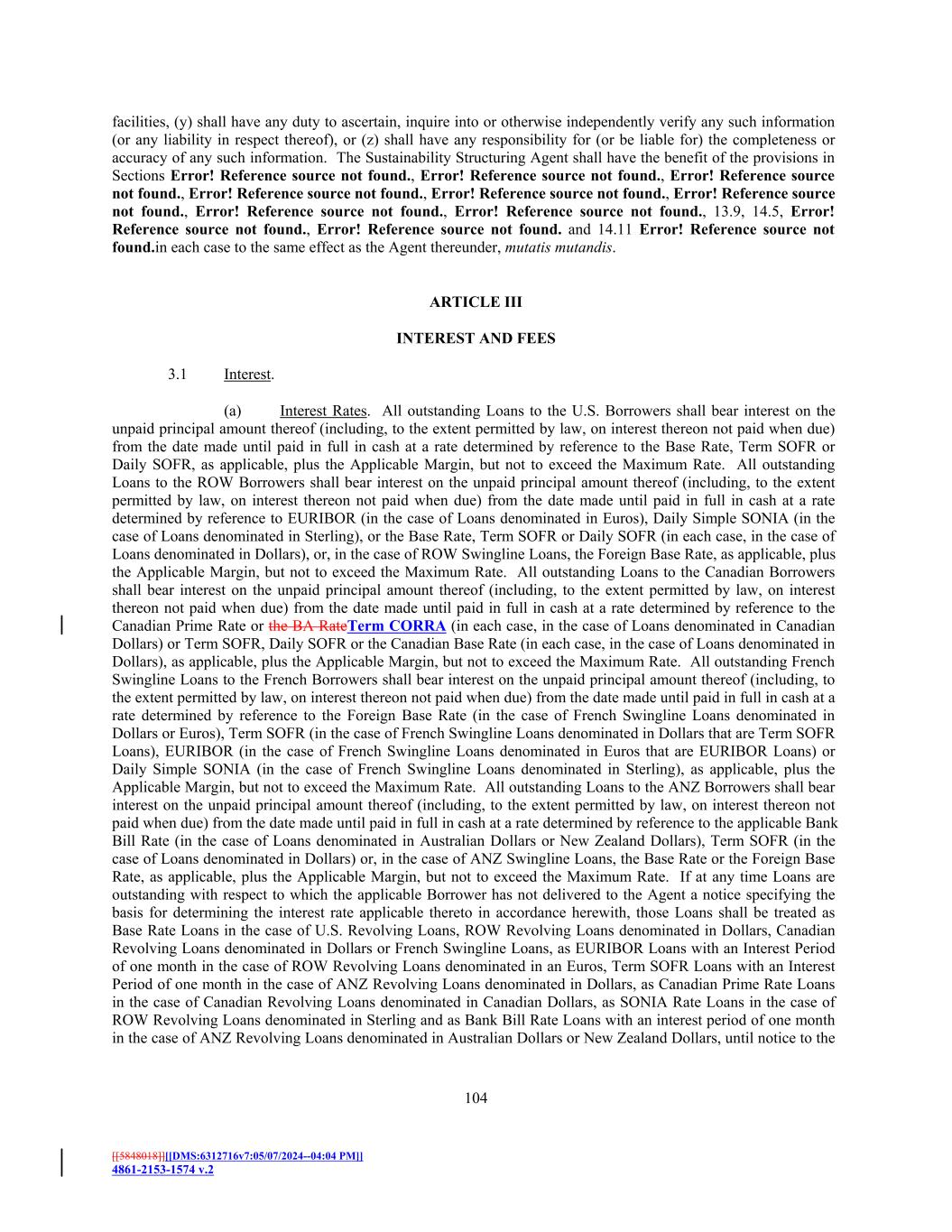 facilities, (y) shall have any duty to ascertain, inquire into or otherwise independently verify any such information (or any liability in respect thereof), or (z) shall have any responsibility for (or be liable for) the completeness or accuracy of any such information. The Sustainability Structuring Agent shall have the benefit of the provisions in Sections Error! Reference source not found., Error! Reference source not found., Error! Reference source not found., Error! Reference source not found., Error! Reference source not found., Error! Reference source not found., Error! Reference source not found., Error! Reference source not found., 13.9, 14.5, Error! Reference source not found., Error! Reference source not found. and 14.11 Error! Reference source not found.in each case to the same effect as the Agent thereunder, mutatis mutandis. ARTICLE III INTEREST AND FEES 3.1 Interest. (a) Interest Rates. All outstanding Loans to the U.S. Borrowers shall bear interest on the unpaid principal amount thereof (including, to the extent permitted by law, on interest thereon not paid when due) from the date made until paid in full in cash at a rate determined by reference to the Base Rate, Term SOFR or Daily SOFR, as applicable, plus the Applicable Margin, but not to exceed the Maximum Rate. All outstanding Loans to the ROW Borrowers shall bear interest on the unpaid principal amount thereof (including, to the extent permitted by law, on interest thereon not paid when due) from the date made until paid in full in cash at a rate determined by reference to EURIBOR (in the case of Loans denominated in Euros), Daily Simple SONIA (in the case of Loans denominated in Sterling), or the Base Rate, Term SOFR or Daily SOFR (in each case, in the case of Loans denominated in Dollars), or, in the case of ROW Swingline Loans, the Foreign Base Rate, as applicable, plus the Applicable Margin, but not to exceed the Maximum Rate. All outstanding Loans to the Canadian Borrowers shall bear interest on the unpaid principal amount thereof (including, to the extent permitted by law, on interest thereon not paid when due) from the date made until paid in full in cash at a rate determined by reference to the Canadian Prime Rate or the BA RateTerm CORRA (in each case, in the case of Loans denominated in Canadian Dollars) or Term SOFR, Daily SOFR or the Canadian Base Rate (in each case, in the case of Loans denominated in Dollars), as applicable, plus the Applicable Margin, but not to exceed the Maximum Rate. All outstanding French Swingline Loans to the French Borrowers shall bear interest on the unpaid principal amount thereof (including, to the extent permitted by law, on interest thereon not paid when due) from the date made until paid in full in cash at a rate determined by reference to the Foreign Base Rate (in the case of French Swingline Loans denominated in Dollars or Euros), Term SOFR (in the case of French Swingline Loans denominated in Dollars that are Term SOFR Loans), EURIBOR (in the case of French Swingline Loans denominated in Euros that are EURIBOR Loans) or Daily Simple SONIA (in the case of French Swingline Loans denominated in Sterling), as applicable, plus the Applicable Margin, but not to exceed the Maximum Rate. All outstanding Loans to the ANZ Borrowers shall bear interest on the unpaid principal amount thereof (including, to the extent permitted by law, on interest thereon not paid when due) from the date made until paid in full in cash at a rate determined by reference to the applicable Bank Bill Rate (in the case of Loans denominated in Australian Dollars or New Zealand Dollars), Term SOFR (in the case of Loans denominated in Dollars) or, in the case of ANZ Swingline Loans, the Base Rate or the Foreign Base Rate, as applicable, plus the Applicable Margin, but not to exceed the Maximum Rate. If at any time Loans are outstanding with respect to which the applicable Borrower has not delivered to the Agent a notice specifying the basis for determining the interest rate applicable thereto in accordance herewith, those Loans shall be treated as Base Rate Loans in the case of U.S. Revolving Loans, ROW Revolving Loans denominated in Dollars, Canadian Revolving Loans denominated in Dollars or French Swingline Loans, as EURIBOR Loans with an Interest Period of one month in the case of ROW Revolving Loans denominated in an Euros, Term SOFR Loans with an Interest Period of one month in the case of ANZ Revolving Loans denominated in Dollars, as Canadian Prime Rate Loans in the case of Canadian Revolving Loans denominated in Canadian Dollars, as SONIA Rate Loans in the case of ROW Revolving Loans denominated in Sterling and as Bank Bill Rate Loans with an interest period of one month in the case of ANZ Revolving Loans denominated in Australian Dollars or New Zealand Dollars, until notice to the 104 [[5848018]][[DMS:6312716v7:05/07/2024--04:04 PM]] 4861-2153-1574 v.2