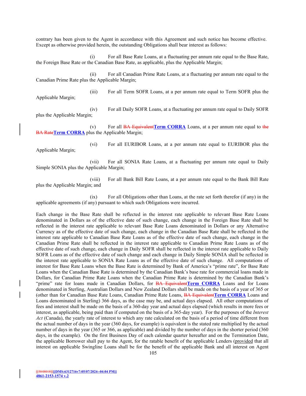contrary has been given to the Agent in accordance with this Agreement and such notice has become effective. Except as otherwise provided herein, the outstanding Obligations shall bear interest as follows: (i) For all Base Rate Loans, at a fluctuating per annum rate equal to the Base Rate, the Foreign Base Rate or the Canadian Base Rate, as applicable, plus the Applicable Margin; (ii) For all Canadian Prime Rate Loans, at a fluctuating per annum rate equal to the Canadian Prime Rate plus the Applicable Margin; (iii) For all Term SOFR Loans, at a per annum rate equal to Term SOFR plus the Applicable Margin; (iv) For all Daily SOFR Loans, at a fluctuating per annum rate equal to Daily SOFR plus the Applicable Margin; (v) For all BA EquivalentTerm CORRA Loans, at a per annum rate equal to the BA RateTerm CORRA plus the Applicable Margin; (vi) For all EURIBOR Loans, at a per annum rate equal to EURIBOR plus the Applicable Margin; (vii) For all SONIA Rate Loans, at a fluctuating per annum rate equal to Daily Simple SONIA plus the Applicable Margin; (viii) For all Bank Bill Rate Loans, at a per annum rate equal to the Bank Bill Rate plus the Applicable Margin; and (ix) For all Obligations other than Loans, at the rate set forth therefor (if any) in the applicable agreements (if any) pursuant to which such Obligations were incurred. Each change in the Base Rate shall be reflected in the interest rate applicable to relevant Base Rate Loans denominated in Dollars as of the effective date of such change, each change in the Foreign Base Rate shall be reflected in the interest rate applicable to relevant Base Rate Loans denominated in Dollars or any Alternative Currency as of the effective date of such change, each change in the Canadian Base Rate shall be reflected in the interest rate applicable to Canadian Base Rate Loans as of the effective date of such change, each change in the Canadian Prime Rate shall be reflected in the interest rate applicable to Canadian Prime Rate Loans as of the effective date of such change, each change in Daily SOFR shall be reflected in the interest rate applicable to Daily SOFR Loans as of the effective date of such change and each change in Daily Simple SONIA shall be reflected in the interest rate applicable to SONIA Rate Loans as of the effective date of such change. All computations of interest for Base Rate Loans when the Base Rate is determined by Bank of America’s “prime rate”, for Base Rate Loans when the Canadian Base Rate is determined by the Canadian Bank’s base rate for commercial loans made in Dollars, for Canadian Prime Rate Loans when the Canadian Prime Rate is determined by the Canadian Bank’s “prime” rate for loans made in Canadian Dollars, for BA EquivalentTerm CORRA Loans and for Loans denominated in Sterling, Australian Dollars and New Zealand Dollars shall be made on the basis of a year of 365 or (other than for Canadian Base Rate Loans, Canadian Prime Rate Loans, BA EquivalentTerm CORRA Loans and Loans denominated in Sterling) 366 days, as the case may be, and actual days elapsed. All other computations of fees and interest shall be made on the basis of a 360-day year and actual days elapsed (which results in more fees or interest, as applicable, being paid than if computed on the basis of a 365-day year). For the purposes of the Interest Act (Canada), the yearly rate of interest to which any rate calculated on the basis of a period of time different from the actual number of days in the year (360 days, for example) is equivalent is the stated rate multiplied by the actual number of days in the year (365 or 366, as applicable) and divided by the number of days in the shorter period (360 days, in the example). On the first Business Day of each calendar quarter hereafter and on the Termination Date, the applicable Borrower shall pay to the Agent, for the ratable benefit of the applicable Lenders (provided that all interest on applicable Swingline Loans shall be for the benefit of the applicable Bank and all interest on Agent 105 [[5848018]][[DMS:6312716v7:05/07/2024--04:04 PM]] 4861-2153-1574 v.2