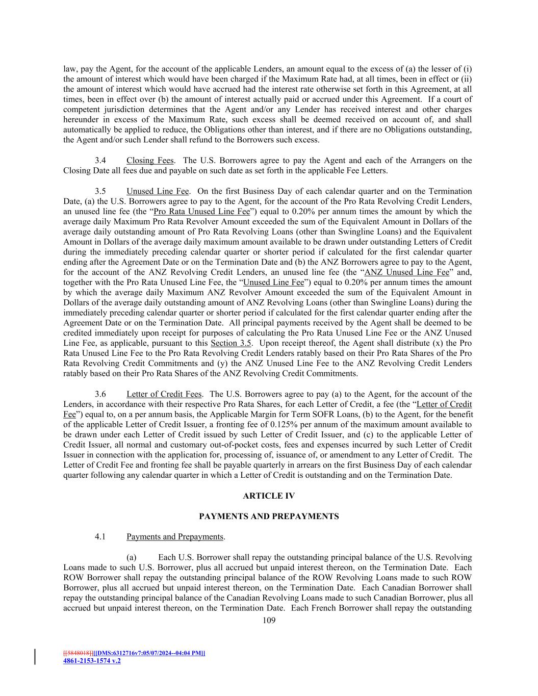 law, pay the Agent, for the account of the applicable Lenders, an amount equal to the excess of (a) the lesser of (i) the amount of interest which would have been charged if the Maximum Rate had, at all times, been in effect or (ii) the amount of interest which would have accrued had the interest rate otherwise set forth in this Agreement, at all times, been in effect over (b) the amount of interest actually paid or accrued under this Agreement. If a court of competent jurisdiction determines that the Agent and/or any Lender has received interest and other charges hereunder in excess of the Maximum Rate, such excess shall be deemed received on account of, and shall automatically be applied to reduce, the Obligations other than interest, and if there are no Obligations outstanding, the Agent and/or such Lender shall refund to the Borrowers such excess. 3.4 Closing Fees. The U.S. Borrowers agree to pay the Agent and each of the Arrangers on the Closing Date all fees due and payable on such date as set forth in the applicable Fee Letters. 3.5 Unused Line Fee. On the first Business Day of each calendar quarter and on the Termination Date, (a) the U.S. Borrowers agree to pay to the Agent, for the account of the Pro Rata Revolving Credit Lenders, an unused line fee (the “Pro Rata Unused Line Fee”) equal to 0.20% per annum times the amount by which the average daily Maximum Pro Rata Revolver Amount exceeded the sum of the Equivalent Amount in Dollars of the average daily outstanding amount of Pro Rata Revolving Loans (other than Swingline Loans) and the Equivalent Amount in Dollars of the average daily maximum amount available to be drawn under outstanding Letters of Credit during the immediately preceding calendar quarter or shorter period if calculated for the first calendar quarter ending after the Agreement Date or on the Termination Date and (b) the ANZ Borrowers agree to pay to the Agent, for the account of the ANZ Revolving Credit Lenders, an unused line fee (the “ANZ Unused Line Fee” and, together with the Pro Rata Unused Line Fee, the “Unused Line Fee”) equal to 0.20% per annum times the amount by which the average daily Maximum ANZ Revolver Amount exceeded the sum of the Equivalent Amount in Dollars of the average daily outstanding amount of ANZ Revolving Loans (other than Swingline Loans) during the immediately preceding calendar quarter or shorter period if calculated for the first calendar quarter ending after the Agreement Date or on the Termination Date. All principal payments received by the Agent shall be deemed to be credited immediately upon receipt for purposes of calculating the Pro Rata Unused Line Fee or the ANZ Unused Line Fee, as applicable, pursuant to this Section 3.5. Upon receipt thereof, the Agent shall distribute (x) the Pro Rata Unused Line Fee to the Pro Rata Revolving Credit Lenders ratably based on their Pro Rata Shares of the Pro Rata Revolving Credit Commitments and (y) the ANZ Unused Line Fee to the ANZ Revolving Credit Lenders ratably based on their Pro Rata Shares of the ANZ Revolving Credit Commitments. 3.6 Letter of Credit Fees. The U.S. Borrowers agree to pay (a) to the Agent, for the account of the Lenders, in accordance with their respective Pro Rata Shares, for each Letter of Credit, a fee (the “Letter of Credit Fee”) equal to, on a per annum basis, the Applicable Margin for Term SOFR Loans, (b) to the Agent, for the benefit of the applicable Letter of Credit Issuer, a fronting fee of 0.125% per annum of the maximum amount available to be drawn under each Letter of Credit issued by such Letter of Credit Issuer, and (c) to the applicable Letter of Credit Issuer, all normal and customary out-of-pocket costs, fees and expenses incurred by such Letter of Credit Issuer in connection with the application for, processing of, issuance of, or amendment to any Letter of Credit. The Letter of Credit Fee and fronting fee shall be payable quarterly in arrears on the first Business Day of each calendar quarter following any calendar quarter in which a Letter of Credit is outstanding and on the Termination Date. ARTICLE IV PAYMENTS AND PREPAYMENTS 4.1 Payments and Prepayments. (a) Each U.S. Borrower shall repay the outstanding principal balance of the U.S. Revolving Loans made to such U.S. Borrower, plus all accrued but unpaid interest thereon, on the Termination Date. Each ROW Borrower shall repay the outstanding principal balance of the ROW Revolving Loans made to such ROW Borrower, plus all accrued but unpaid interest thereon, on the Termination Date. Each Canadian Borrower shall repay the outstanding principal balance of the Canadian Revolving Loans made to such Canadian Borrower, plus all accrued but unpaid interest thereon, on the Termination Date. Each French Borrower shall repay the outstanding 109 [[5848018]][[DMS:6312716v7:05/07/2024--04:04 PM]] 4861-2153-1574 v.2