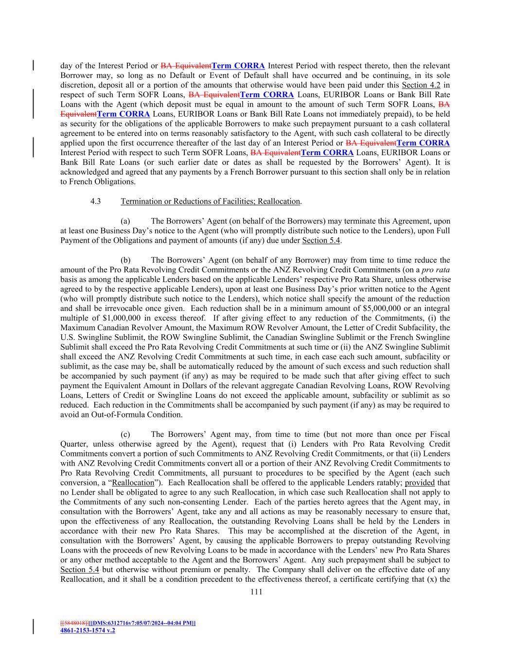 day of the Interest Period or BA EquivalentTerm CORRA Interest Period with respect thereto, then the relevant Borrower may, so long as no Default or Event of Default shall have occurred and be continuing, in its sole discretion, deposit all or a portion of the amounts that otherwise would have been paid under this Section 4.2 in respect of such Term SOFR Loans, BA EquivalentTerm CORRA Loans, EURIBOR Loans or Bank Bill Rate Loans with the Agent (which deposit must be equal in amount to the amount of such Term SOFR Loans, BA EquivalentTerm CORRA Loans, EURIBOR Loans or Bank Bill Rate Loans not immediately prepaid), to be held as security for the obligations of the applicable Borrowers to make such prepayment pursuant to a cash collateral agreement to be entered into on terms reasonably satisfactory to the Agent, with such cash collateral to be directly applied upon the first occurrence thereafter of the last day of an Interest Period or BA EquivalentTerm CORRA Interest Period with respect to such Term SOFR Loans, BA EquivalentTerm CORRA Loans, EURIBOR Loans or Bank Bill Rate Loans (or such earlier date or dates as shall be requested by the Borrowers’ Agent). It is acknowledged and agreed that any payments by a French Borrower pursuant to this section shall only be in relation to French Obligations. 4.3 Termination or Reductions of Facilities; Reallocation. (a) The Borrowers’ Agent (on behalf of the Borrowers) may terminate this Agreement, upon at least one Business Day’s notice to the Agent (who will promptly distribute such notice to the Lenders), upon Full Payment of the Obligations and payment of amounts (if any) due under Section 5.4. (b) The Borrowers’ Agent (on behalf of any Borrower) may from time to time reduce the amount of the Pro Rata Revolving Credit Commitments or the ANZ Revolving Credit Commitments (on a pro rata basis as among the applicable Lenders based on the applicable Lenders’ respective Pro Rata Share, unless otherwise agreed to by the respective applicable Lenders), upon at least one Business Day’s prior written notice to the Agent (who will promptly distribute such notice to the Lenders), which notice shall specify the amount of the reduction and shall be irrevocable once given. Each reduction shall be in a minimum amount of $5,000,000 or an integral multiple of $1,000,000 in excess thereof. If after giving effect to any reduction of the Commitments, (i) the Maximum Canadian Revolver Amount, the Maximum ROW Revolver Amount, the Letter of Credit Subfacility, the U.S. Swingline Sublimit, the ROW Swingline Sublimit, the Canadian Swingline Sublimit or the French Swingline Sublimit shall exceed the Pro Rata Revolving Credit Commitments at such time or (ii) the ANZ Swingline Sublimit shall exceed the ANZ Revolving Credit Commitments at such time, in each case each such amount, subfacility or sublimit, as the case may be, shall be automatically reduced by the amount of such excess and such reduction shall be accompanied by such payment (if any) as may be required to be made such that after giving effect to such payment the Equivalent Amount in Dollars of the relevant aggregate Canadian Revolving Loans, ROW Revolving Loans, Letters of Credit or Swingline Loans do not exceed the applicable amount, subfacility or sublimit as so reduced. Each reduction in the Commitments shall be accompanied by such payment (if any) as may be required to avoid an Out-of-Formula Condition. (c) The Borrowers’ Agent may, from time to time (but not more than once per Fiscal Quarter, unless otherwise agreed by the Agent), request that (i) Lenders with Pro Rata Revolving Credit Commitments convert a portion of such Commitments to ANZ Revolving Credit Commitments, or that (ii) Lenders with ANZ Revolving Credit Commitments convert all or a portion of their ANZ Revolving Credit Commitments to Pro Rata Revolving Credit Commitments, all pursuant to procedures to be specified by the Agent (each such conversion, a “Reallocation”). Each Reallocation shall be offered to the applicable Lenders ratably; provided that no Lender shall be obligated to agree to any such Reallocation, in which case such Reallocation shall not apply to the Commitments of any such non-consenting Lender. Each of the parties hereto agrees that the Agent may, in consultation with the Borrowers’ Agent, take any and all actions as may be reasonably necessary to ensure that, upon the effectiveness of any Reallocation, the outstanding Revolving Loans shall be held by the Lenders in accordance with their new Pro Rata Shares. This may be accomplished at the discretion of the Agent, in consultation with the Borrowers’ Agent, by causing the applicable Borrowers to prepay outstanding Revolving Loans with the proceeds of new Revolving Loans to be made in accordance with the Lenders’ new Pro Rata Shares or any other method acceptable to the Agent and the Borrowers’ Agent. Any such prepayment shall be subject to Section 5.4 but otherwise without premium or penalty. The Company shall deliver on the effective date of any Reallocation, and it shall be a condition precedent to the effectiveness thereof, a certificate certifying that (x) the 111 [[5848018]][[DMS:6312716v7:05/07/2024--04:04 PM]] 4861-2153-1574 v.2