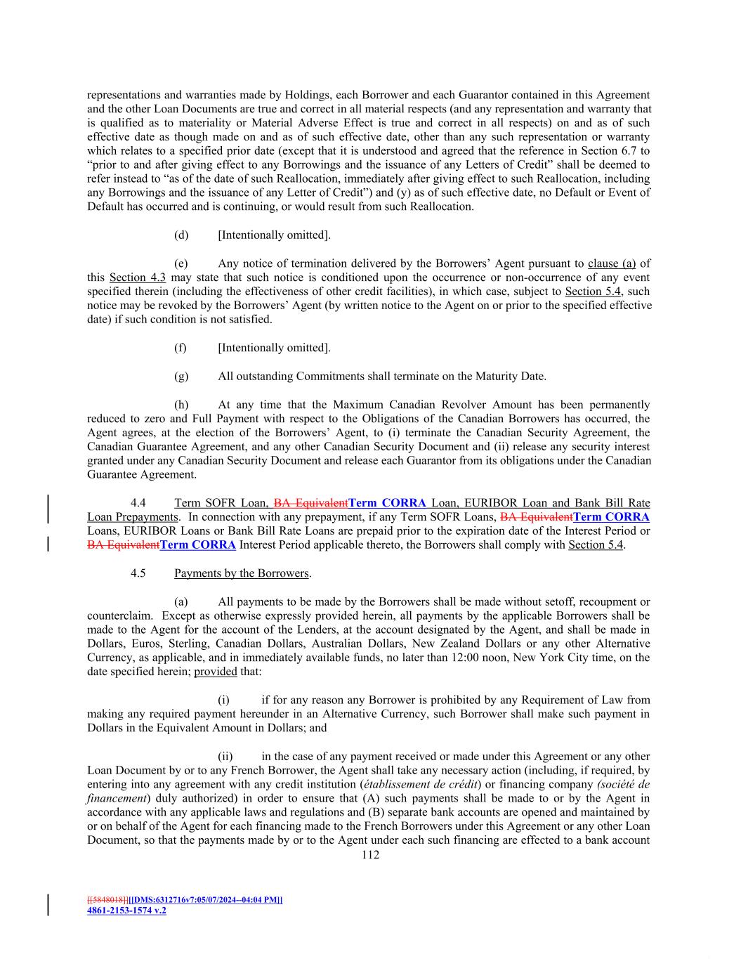 representations and warranties made by Holdings, each Borrower and each Guarantor contained in this Agreement and the other Loan Documents are true and correct in all material respects (and any representation and warranty that is qualified as to materiality or Material Adverse Effect is true and correct in all respects) on and as of such effective date as though made on and as of such effective date, other than any such representation or warranty which relates to a specified prior date (except that it is understood and agreed that the reference in Section 6.7 to “prior to and after giving effect to any Borrowings and the issuance of any Letters of Credit” shall be deemed to refer instead to “as of the date of such Reallocation, immediately after giving effect to such Reallocation, including any Borrowings and the issuance of any Letter of Credit”) and (y) as of such effective date, no Default or Event of Default has occurred and is continuing, or would result from such Reallocation. (d) [Intentionally omitted]. (e) Any notice of termination delivered by the Borrowers’ Agent pursuant to clause (a) of this Section 4.3 may state that such notice is conditioned upon the occurrence or non-occurrence of any event specified therein (including the effectiveness of other credit facilities), in which case, subject to Section 5.4, such notice may be revoked by the Borrowers’ Agent (by written notice to the Agent on or prior to the specified effective date) if such condition is not satisfied. (f) [Intentionally omitted]. (g) All outstanding Commitments shall terminate on the Maturity Date. (h) At any time that the Maximum Canadian Revolver Amount has been permanently reduced to zero and Full Payment with respect to the Obligations of the Canadian Borrowers has occurred, the Agent agrees, at the election of the Borrowers’ Agent, to (i) terminate the Canadian Security Agreement, the Canadian Guarantee Agreement, and any other Canadian Security Document and (ii) release any security interest granted under any Canadian Security Document and release each Guarantor from its obligations under the Canadian Guarantee Agreement. 4.4 Term SOFR Loan, BA EquivalentTerm CORRA Loan, EURIBOR Loan and Bank Bill Rate Loan Prepayments. In connection with any prepayment, if any Term SOFR Loans, BA EquivalentTerm CORRA Loans, EURIBOR Loans or Bank Bill Rate Loans are prepaid prior to the expiration date of the Interest Period or BA EquivalentTerm CORRA Interest Period applicable thereto, the Borrowers shall comply with Section 5.4. 4.5 Payments by the Borrowers. (a) All payments to be made by the Borrowers shall be made without setoff, recoupment or counterclaim. Except as otherwise expressly provided herein, all payments by the applicable Borrowers shall be made to the Agent for the account of the Lenders, at the account designated by the Agent, and shall be made in Dollars, Euros, Sterling, Canadian Dollars, Australian Dollars, New Zealand Dollars or any other Alternative Currency, as applicable, and in immediately available funds, no later than 12:00 noon, New York City time, on the date specified herein; provided that: (i) if for any reason any Borrower is prohibited by any Requirement of Law from making any required payment hereunder in an Alternative Currency, such Borrower shall make such payment in Dollars in the Equivalent Amount in Dollars; and (ii) in the case of any payment received or made under this Agreement or any other Loan Document by or to any French Borrower, the Agent shall take any necessary action (including, if required, by entering into any agreement with any credit institution (établissement de crédit) or financing company (société de financement) duly authorized) in order to ensure that (A) such payments shall be made to or by the Agent in accordance with any applicable laws and regulations and (B) separate bank accounts are opened and maintained by or on behalf of the Agent for each financing made to the French Borrowers under this Agreement or any other Loan Document, so that the payments made by or to the Agent under each such financing are effected to a bank account 112 [[5848018]][[DMS:6312716v7:05/07/2024--04:04 PM]] 4861-2153-1574 v.2