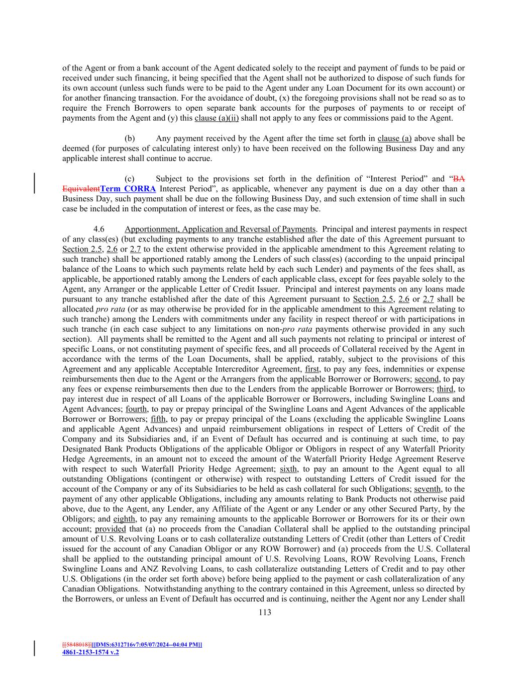of the Agent or from a bank account of the Agent dedicated solely to the receipt and payment of funds to be paid or received under such financing, it being specified that the Agent shall not be authorized to dispose of such funds for its own account (unless such funds were to be paid to the Agent under any Loan Document for its own account) or for another financing transaction. For the avoidance of doubt, (x) the foregoing provisions shall not be read so as to require the French Borrowers to open separate bank accounts for the purposes of payments to or receipt of payments from the Agent and (y) this clause (a)(ii) shall not apply to any fees or commissions paid to the Agent. (b) Any payment received by the Agent after the time set forth in clause (a) above shall be deemed (for purposes of calculating interest only) to have been received on the following Business Day and any applicable interest shall continue to accrue. (c) Subject to the provisions set forth in the definition of “Interest Period” and “BA EquivalentTerm CORRA Interest Period”, as applicable, whenever any payment is due on a day other than a Business Day, such payment shall be due on the following Business Day, and such extension of time shall in such case be included in the computation of interest or fees, as the case may be. 4.6 Apportionment, Application and Reversal of Payments. Principal and interest payments in respect of any class(es) (but excluding payments to any tranche established after the date of this Agreement pursuant to Section 2.5, 2.6 or 2.7 to the extent otherwise provided in the applicable amendment to this Agreement relating to such tranche) shall be apportioned ratably among the Lenders of such class(es) (according to the unpaid principal balance of the Loans to which such payments relate held by each such Lender) and payments of the fees shall, as applicable, be apportioned ratably among the Lenders of each applicable class, except for fees payable solely to the Agent, any Arranger or the applicable Letter of Credit Issuer. Principal and interest payments on any loans made pursuant to any tranche established after the date of this Agreement pursuant to Section 2.5, 2.6 or 2.7 shall be allocated pro rata (or as may otherwise be provided for in the applicable amendment to this Agreement relating to such tranche) among the Lenders with commitments under any facility in respect thereof or with participations in such tranche (in each case subject to any limitations on non-pro rata payments otherwise provided in any such section). All payments shall be remitted to the Agent and all such payments not relating to principal or interest of specific Loans, or not constituting payment of specific fees, and all proceeds of Collateral received by the Agent in accordance with the terms of the Loan Documents, shall be applied, ratably, subject to the provisions of this Agreement and any applicable Acceptable Intercreditor Agreement, first, to pay any fees, indemnities or expense reimbursements then due to the Agent or the Arrangers from the applicable Borrower or Borrowers; second, to pay any fees or expense reimbursements then due to the Lenders from the applicable Borrower or Borrowers; third, to pay interest due in respect of all Loans of the applicable Borrower or Borrowers, including Swingline Loans and Agent Advances; fourth, to pay or prepay principal of the Swingline Loans and Agent Advances of the applicable Borrower or Borrowers; fifth, to pay or prepay principal of the Loans (excluding the applicable Swingline Loans and applicable Agent Advances) and unpaid reimbursement obligations in respect of Letters of Credit of the Company and its Subsidiaries and, if an Event of Default has occurred and is continuing at such time, to pay Designated Bank Products Obligations of the applicable Obligor or Obligors in respect of any Waterfall Priority Hedge Agreements, in an amount not to exceed the amount of the Waterfall Priority Hedge Agreement Reserve with respect to such Waterfall Priority Hedge Agreement; sixth, to pay an amount to the Agent equal to all outstanding Obligations (contingent or otherwise) with respect to outstanding Letters of Credit issued for the account of the Company or any of its Subsidiaries to be held as cash collateral for such Obligations; seventh, to the payment of any other applicable Obligations, including any amounts relating to Bank Products not otherwise paid above, due to the Agent, any Lender, any Affiliate of the Agent or any Lender or any other Secured Party, by the Obligors; and eighth, to pay any remaining amounts to the applicable Borrower or Borrowers for its or their own account; provided that (a) no proceeds from the Canadian Collateral shall be applied to the outstanding principal amount of U.S. Revolving Loans or to cash collateralize outstanding Letters of Credit (other than Letters of Credit issued for the account of any Canadian Obligor or any ROW Borrower) and (a) proceeds from the U.S. Collateral shall be applied to the outstanding principal amount of U.S. Revolving Loans, ROW Revolving Loans, French Swingline Loans and ANZ Revolving Loans, to cash collateralize outstanding Letters of Credit and to pay other U.S. Obligations (in the order set forth above) before being applied to the payment or cash collateralization of any Canadian Obligations. Notwithstanding anything to the contrary contained in this Agreement, unless so directed by the Borrowers, or unless an Event of Default has occurred and is continuing, neither the Agent nor any Lender shall 113 [[5848018]][[DMS:6312716v7:05/07/2024--04:04 PM]] 4861-2153-1574 v.2