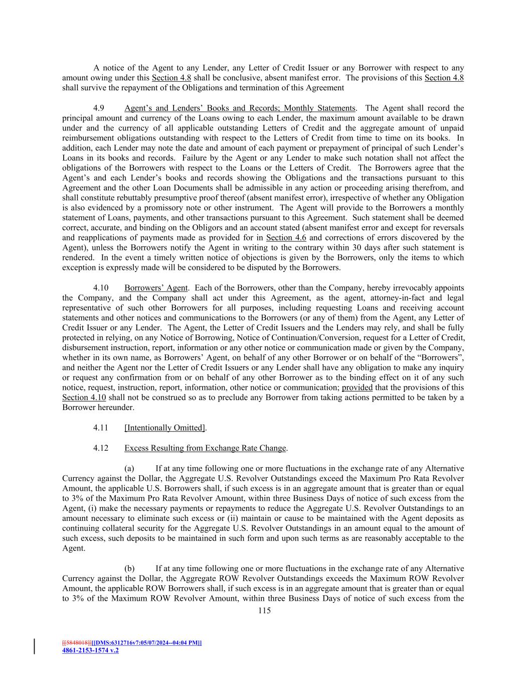 A notice of the Agent to any Lender, any Letter of Credit Issuer or any Borrower with respect to any amount owing under this Section 4.8 shall be conclusive, absent manifest error. The provisions of this Section 4.8 shall survive the repayment of the Obligations and termination of this Agreement 4.9 Agent’s and Lenders’ Books and Records; Monthly Statements. The Agent shall record the principal amount and currency of the Loans owing to each Lender, the maximum amount available to be drawn under and the currency of all applicable outstanding Letters of Credit and the aggregate amount of unpaid reimbursement obligations outstanding with respect to the Letters of Credit from time to time on its books. In addition, each Lender may note the date and amount of each payment or prepayment of principal of such Lender’s Loans in its books and records. Failure by the Agent or any Lender to make such notation shall not affect the obligations of the Borrowers with respect to the Loans or the Letters of Credit. The Borrowers agree that the Agent’s and each Lender’s books and records showing the Obligations and the transactions pursuant to this Agreement and the other Loan Documents shall be admissible in any action or proceeding arising therefrom, and shall constitute rebuttably presumptive proof thereof (absent manifest error), irrespective of whether any Obligation is also evidenced by a promissory note or other instrument. The Agent will provide to the Borrowers a monthly statement of Loans, payments, and other transactions pursuant to this Agreement. Such statement shall be deemed correct, accurate, and binding on the Obligors and an account stated (absent manifest error and except for reversals and reapplications of payments made as provided for in Section 4.6 and corrections of errors discovered by the Agent), unless the Borrowers notify the Agent in writing to the contrary within 30 days after such statement is rendered. In the event a timely written notice of objections is given by the Borrowers, only the items to which exception is expressly made will be considered to be disputed by the Borrowers. 4.10 Borrowers’ Agent. Each of the Borrowers, other than the Company, hereby irrevocably appoints the Company, and the Company shall act under this Agreement, as the agent, attorney-in-fact and legal representative of such other Borrowers for all purposes, including requesting Loans and receiving account statements and other notices and communications to the Borrowers (or any of them) from the Agent, any Letter of Credit Issuer or any Lender. The Agent, the Letter of Credit Issuers and the Lenders may rely, and shall be fully protected in relying, on any Notice of Borrowing, Notice of Continuation/Conversion, request for a Letter of Credit, disbursement instruction, report, information or any other notice or communication made or given by the Company, whether in its own name, as Borrowers’ Agent, on behalf of any other Borrower or on behalf of the “Borrowers”, and neither the Agent nor the Letter of Credit Issuers or any Lender shall have any obligation to make any inquiry or request any confirmation from or on behalf of any other Borrower as to the binding effect on it of any such notice, request, instruction, report, information, other notice or communication; provided that the provisions of this Section 4.10 shall not be construed so as to preclude any Borrower from taking actions permitted to be taken by a Borrower hereunder. 4.11 [Intentionally Omitted]. 4.12 Excess Resulting from Exchange Rate Change. (a) If at any time following one or more fluctuations in the exchange rate of any Alternative Currency against the Dollar, the Aggregate U.S. Revolver Outstandings exceed the Maximum Pro Rata Revolver Amount, the applicable U.S. Borrowers shall, if such excess is in an aggregate amount that is greater than or equal to 3% of the Maximum Pro Rata Revolver Amount, within three Business Days of notice of such excess from the Agent, (i) make the necessary payments or repayments to reduce the Aggregate U.S. Revolver Outstandings to an amount necessary to eliminate such excess or (ii) maintain or cause to be maintained with the Agent deposits as continuing collateral security for the Aggregate U.S. Revolver Outstandings in an amount equal to the amount of such excess, such deposits to be maintained in such form and upon such terms as are reasonably acceptable to the Agent. (b) If at any time following one or more fluctuations in the exchange rate of any Alternative Currency against the Dollar, the Aggregate ROW Revolver Outstandings exceeds the Maximum ROW Revolver Amount, the applicable ROW Borrowers shall, if such excess is in an aggregate amount that is greater than or equal to 3% of the Maximum ROW Revolver Amount, within three Business Days of notice of such excess from the 115 [[5848018]][[DMS:6312716v7:05/07/2024--04:04 PM]] 4861-2153-1574 v.2