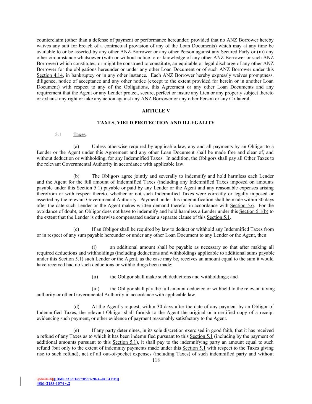 counterclaim (other than a defense of payment or performance hereunder; provided that no ANZ Borrower hereby waives any suit for breach of a contractual provision of any of the Loan Documents) which may at any time be available to or be asserted by any other ANZ Borrower or any other Person against any Secured Party or (iii) any other circumstance whatsoever (with or without notice to or knowledge of any other ANZ Borrower or such ANZ Borrower) which constitutes, or might be construed to constitute, an equitable or legal discharge of any other ANZ Borrower for the obligations hereunder or under any other Loan Document or of such ANZ Borrower under this Section 4.14, in bankruptcy or in any other instance. Each ANZ Borrower hereby expressly waives promptness, diligence, notice of acceptance and any other notice (except to the extent provided for herein or in another Loan Document) with respect to any of the Obligations, this Agreement or any other Loan Documents and any requirement that the Agent or any Lender protect, secure, perfect or insure any Lien or any property subject thereto or exhaust any right or take any action against any ANZ Borrower or any other Person or any Collateral. ARTICLE V TAXES, YIELD PROTECTION AND ILLEGALITY 5.1 Taxes. (a) Unless otherwise required by applicable law, any and all payments by an Obligor to a Lender or the Agent under this Agreement and any other Loan Document shall be made free and clear of, and without deduction or withholding, for any Indemnified Taxes. In addition, the Obligors shall pay all Other Taxes to the relevant Governmental Authority in accordance with applicable law. (b) The Obligors agree jointly and severally to indemnify and hold harmless each Lender and the Agent for the full amount of Indemnified Taxes (including any Indemnified Taxes imposed on amounts payable under this Section 5.1) payable or paid by any Lender or the Agent and any reasonable expenses arising therefrom or with respect thereto, whether or not such Indemnified Taxes were correctly or legally imposed or asserted by the relevant Governmental Authority. Payment under this indemnification shall be made within 30 days after the date such Lender or the Agent makes written demand therefor in accordance with Section 5.6. For the avoidance of doubt, an Obligor does not have to indemnify and hold harmless a Lender under this Section 5.1(b) to the extent that the Lender is otherwise compensated under a separate clause of this Section 5.1. (c) If an Obligor shall be required by law to deduct or withhold any Indemnified Taxes from or in respect of any sum payable hereunder or under any other Loan Document to any Lender or the Agent, then: (i) an additional amount shall be payable as necessary so that after making all required deductions and withholdings (including deductions and withholdings applicable to additional sums payable under this Section 5.1) such Lender or the Agent, as the case may be, receives an amount equal to the sum it would have received had no such deductions or withholdings been made; (ii) the Obligor shall make such deductions and withholdings; and (iii) the Obligor shall pay the full amount deducted or withheld to the relevant taxing authority or other Governmental Authority in accordance with applicable law. (d) At the Agent’s request, within 30 days after the date of any payment by an Obligor of Indemnified Taxes, the relevant Obligor shall furnish to the Agent the original or a certified copy of a receipt evidencing such payment, or other evidence of payment reasonably satisfactory to the Agent. (e) If any party determines, in its sole discretion exercised in good faith, that it has received a refund of any Taxes as to which it has been indemnified pursuant to this Section 5.1 (including by the payment of additional amounts pursuant to this Section 5.1), it shall pay to the indemnifying party an amount equal to such refund (but only to the extent of indemnity payments made under this Section 5.1 with respect to the Taxes giving rise to such refund), net of all out-of-pocket expenses (including Taxes) of such indemnified party and without 118 [[5848018]][[DMS:6312716v7:05/07/2024--04:04 PM]] 4861-2153-1574 v.2