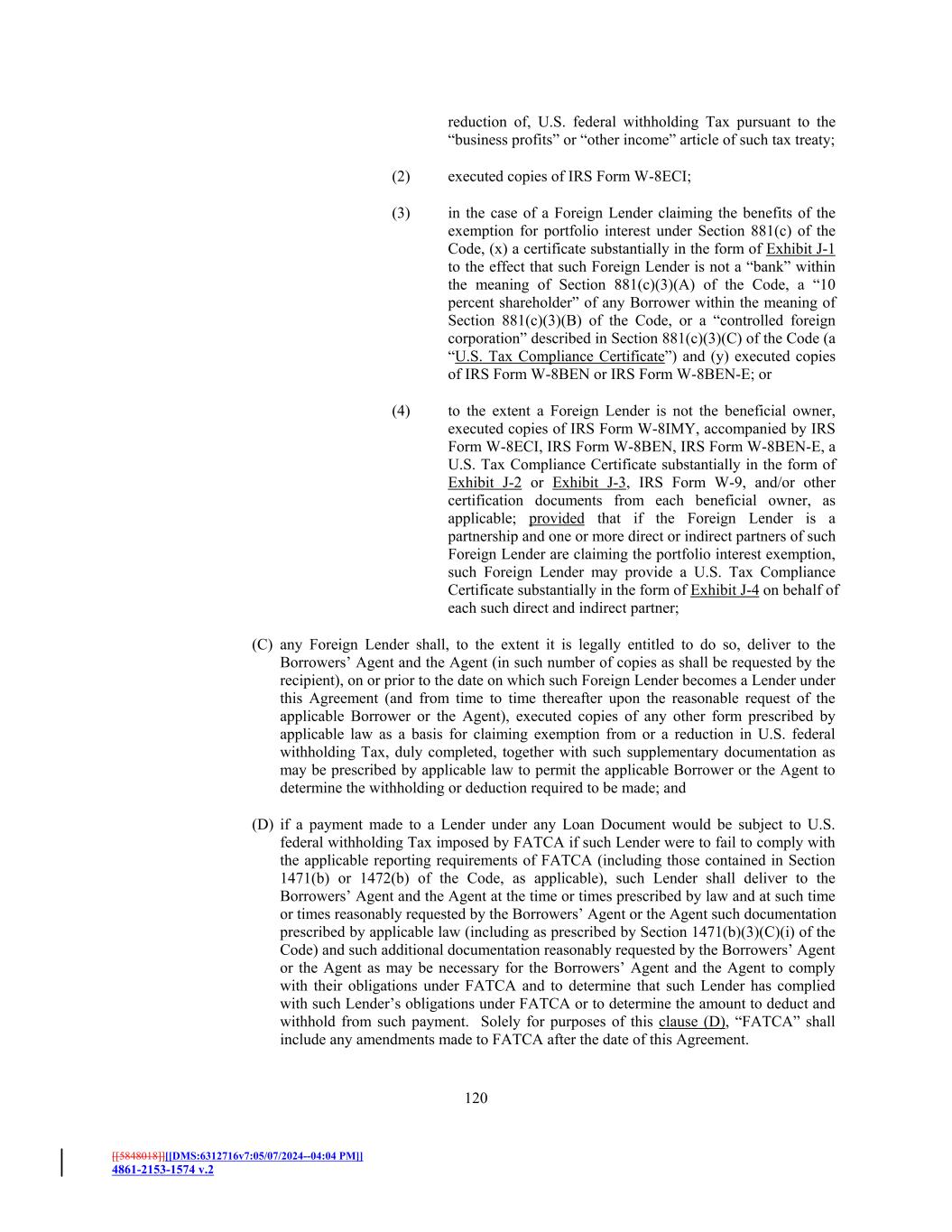 reduction of, U.S. federal withholding Tax pursuant to the “business profits” or “other income” article of such tax treaty; (2) executed copies of IRS Form W-8ECI; (3) in the case of a Foreign Lender claiming the benefits of the exemption for portfolio interest under Section 881(c) of the Code, (x) a certificate substantially in the form of Exhibit J-1 to the effect that such Foreign Lender is not a “bank” within the meaning of Section 881(c)(3)(A) of the Code, a “10 percent shareholder” of any Borrower within the meaning of Section 881(c)(3)(B) of the Code, or a “controlled foreign corporation” described in Section 881(c)(3)(C) of the Code (a “U.S. Tax Compliance Certificate”) and (y) executed copies of IRS Form W-8BEN or IRS Form W-8BEN-E; or (4) to the extent a Foreign Lender is not the beneficial owner, executed copies of IRS Form W-8IMY, accompanied by IRS Form W-8ECI, IRS Form W-8BEN, IRS Form W-8BEN-E, a U.S. Tax Compliance Certificate substantially in the form of Exhibit J-2 or Exhibit J-3, IRS Form W-9, and/or other certification documents from each beneficial owner, as applicable; provided that if the Foreign Lender is a partnership and one or more direct or indirect partners of such Foreign Lender are claiming the portfolio interest exemption, such Foreign Lender may provide a U.S. Tax Compliance Certificate substantially in the form of Exhibit J-4 on behalf of each such direct and indirect partner; (C) any Foreign Lender shall, to the extent it is legally entitled to do so, deliver to the Borrowers’ Agent and the Agent (in such number of copies as shall be requested by the recipient), on or prior to the date on which such Foreign Lender becomes a Lender under this Agreement (and from time to time thereafter upon the reasonable request of the applicable Borrower or the Agent), executed copies of any other form prescribed by applicable law as a basis for claiming exemption from or a reduction in U.S. federal withholding Tax, duly completed, together with such supplementary documentation as may be prescribed by applicable law to permit the applicable Borrower or the Agent to determine the withholding or deduction required to be made; and (D) if a payment made to a Lender under any Loan Document would be subject to U.S. federal withholding Tax imposed by FATCA if such Lender were to fail to comply with the applicable reporting requirements of FATCA (including those contained in Section 1471(b) or 1472(b) of the Code, as applicable), such Lender shall deliver to the Borrowers’ Agent and the Agent at the time or times prescribed by law and at such time or times reasonably requested by the Borrowers’ Agent or the Agent such documentation prescribed by applicable law (including as prescribed by Section 1471(b)(3)(C)(i) of the Code) and such additional documentation reasonably requested by the Borrowers’ Agent or the Agent as may be necessary for the Borrowers’ Agent and the Agent to comply with their obligations under FATCA and to determine that such Lender has complied with such Lender’s obligations under FATCA or to determine the amount to deduct and withhold from such payment. Solely for purposes of this clause (D), “FATCA” shall include any amendments made to FATCA after the date of this Agreement. 120 [[5848018]][[DMS:6312716v7:05/07/2024--04:04 PM]] 4861-2153-1574 v.2