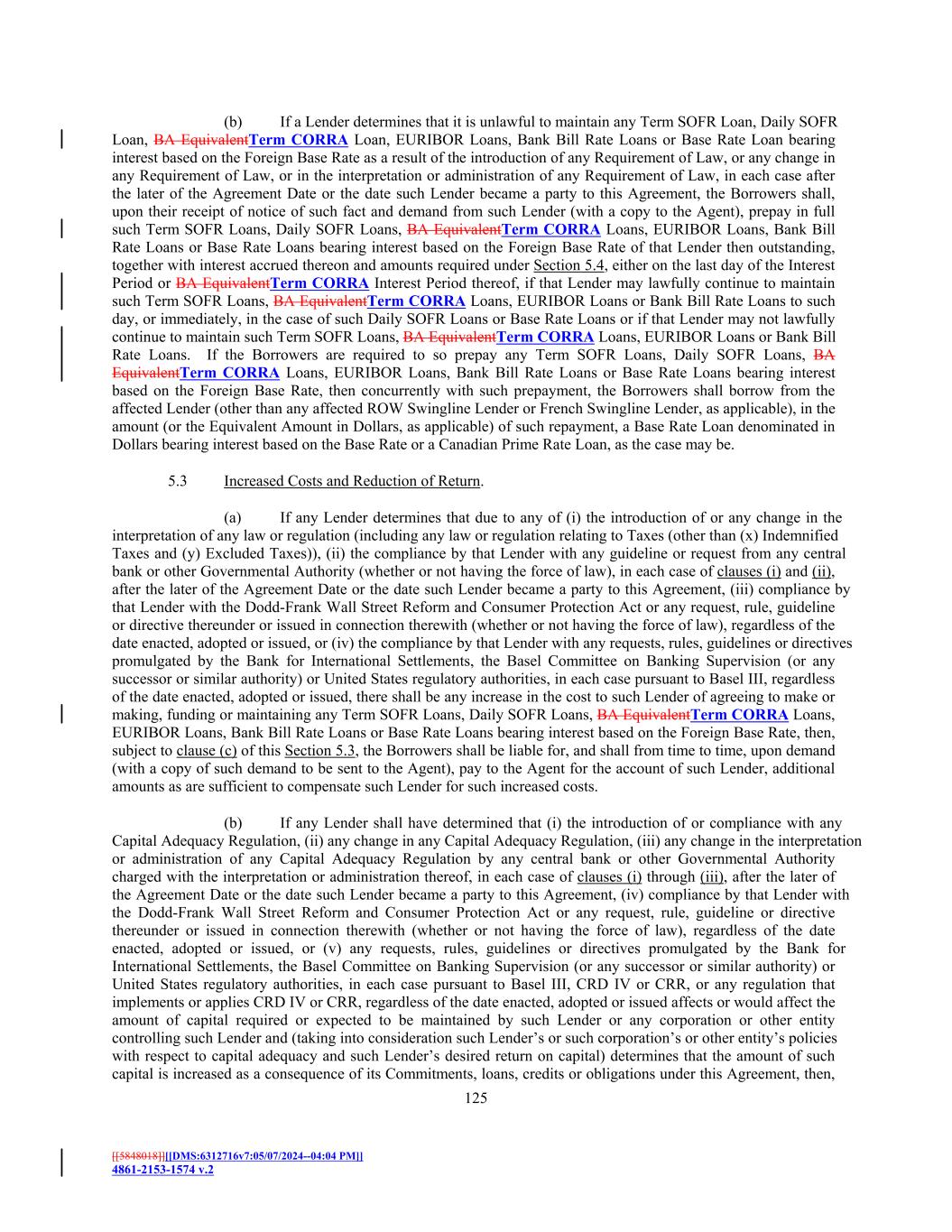(b) If a Lender determines that it is unlawful to maintain any Term SOFR Loan, Daily SOFR Loan, BA EquivalentTerm CORRA Loan, EURIBOR Loans, Bank Bill Rate Loans or Base Rate Loan bearing interest based on the Foreign Base Rate as a result of the introduction of any Requirement of Law, or any change in any Requirement of Law, or in the interpretation or administration of any Requirement of Law, in each case after the later of the Agreement Date or the date such Lender became a party to this Agreement, the Borrowers shall, upon their receipt of notice of such fact and demand from such Lender (with a copy to the Agent), prepay in full such Term SOFR Loans, Daily SOFR Loans, BA EquivalentTerm CORRA Loans, EURIBOR Loans, Bank Bill Rate Loans or Base Rate Loans bearing interest based on the Foreign Base Rate of that Lender then outstanding, together with interest accrued thereon and amounts required under Section 5.4, either on the last day of the Interest Period or BA EquivalentTerm CORRA Interest Period thereof, if that Lender may lawfully continue to maintain such Term SOFR Loans, BA EquivalentTerm CORRA Loans, EURIBOR Loans or Bank Bill Rate Loans to such day, or immediately, in the case of such Daily SOFR Loans or Base Rate Loans or if that Lender may not lawfully continue to maintain such Term SOFR Loans, BA EquivalentTerm CORRA Loans, EURIBOR Loans or Bank Bill Rate Loans. If the Borrowers are required to so prepay any Term SOFR Loans, Daily SOFR Loans, BA EquivalentTerm CORRA Loans, EURIBOR Loans, Bank Bill Rate Loans or Base Rate Loans bearing interest based on the Foreign Base Rate, then concurrently with such prepayment, the Borrowers shall borrow from the affected Lender (other than any affected ROW Swingline Lender or French Swingline Lender, as applicable), in the amount (or the Equivalent Amount in Dollars, as applicable) of such repayment, a Base Rate Loan denominated in Dollars bearing interest based on the Base Rate or a Canadian Prime Rate Loan, as the case may be. 5.3 Increased Costs and Reduction of Return. (a) If any Lender determines that due to any of (i) the introduction of or any change in the interpretation of any law or regulation (including any law or regulation relating to Taxes (other than (x) Indemnified Taxes and (y) Excluded Taxes)), (ii) the compliance by that Lender with any guideline or request from any central bank or other Governmental Authority (whether or not having the force of law), in each case of clauses (i) and (ii), after the later of the Agreement Date or the date such Lender became a party to this Agreement, (iii) compliance by that Lender with the Dodd-Frank Wall Street Reform and Consumer Protection Act or any request, rule, guideline or directive thereunder or issued in connection therewith (whether or not having the force of law), regardless of the date enacted, adopted or issued, or (iv) the compliance by that Lender with any requests, rules, guidelines or directives promulgated by the Bank for International Settlements, the Basel Committee on Banking Supervision (or any successor or similar authority) or United States regulatory authorities, in each case pursuant to Basel III, regardless of the date enacted, adopted or issued, there shall be any increase in the cost to such Lender of agreeing to make or making, funding or maintaining any Term SOFR Loans, Daily SOFR Loans, BA EquivalentTerm CORRA Loans, EURIBOR Loans, Bank Bill Rate Loans or Base Rate Loans bearing interest based on the Foreign Base Rate, then, subject to clause (c) of this Section 5.3, the Borrowers shall be liable for, and shall from time to time, upon demand (with a copy of such demand to be sent to the Agent), pay to the Agent for the account of such Lender, additional amounts as are sufficient to compensate such Lender for such increased costs. (b) If any Lender shall have determined that (i) the introduction of or compliance with any Capital Adequacy Regulation, (ii) any change in any Capital Adequacy Regulation, (iii) any change in the interpretation or administration of any Capital Adequacy Regulation by any central bank or other Governmental Authority charged with the interpretation or administration thereof, in each case of clauses (i) through (iii), after the later of the Agreement Date or the date such Lender became a party to this Agreement, (iv) compliance by that Lender with the Dodd-Frank Wall Street Reform and Consumer Protection Act or any request, rule, guideline or directive thereunder or issued in connection therewith (whether or not having the force of law), regardless of the date enacted, adopted or issued, or (v) any requests, rules, guidelines or directives promulgated by the Bank for International Settlements, the Basel Committee on Banking Supervision (or any successor or similar authority) or United States regulatory authorities, in each case pursuant to Basel III, CRD IV or CRR, or any regulation that implements or applies CRD IV or CRR, regardless of the date enacted, adopted or issued affects or would affect the amount of capital required or expected to be maintained by such Lender or any corporation or other entity controlling such Lender and (taking into consideration such Lender’s or such corporation’s or other entity’s policies with respect to capital adequacy and such Lender’s desired return on capital) determines that the amount of such capital is increased as a consequence of its Commitments, loans, credits or obligations under this Agreement, then, 125 [[5848018]][[DMS:6312716v7:05/07/2024--04:04 PM]] 4861-2153-1574 v.2