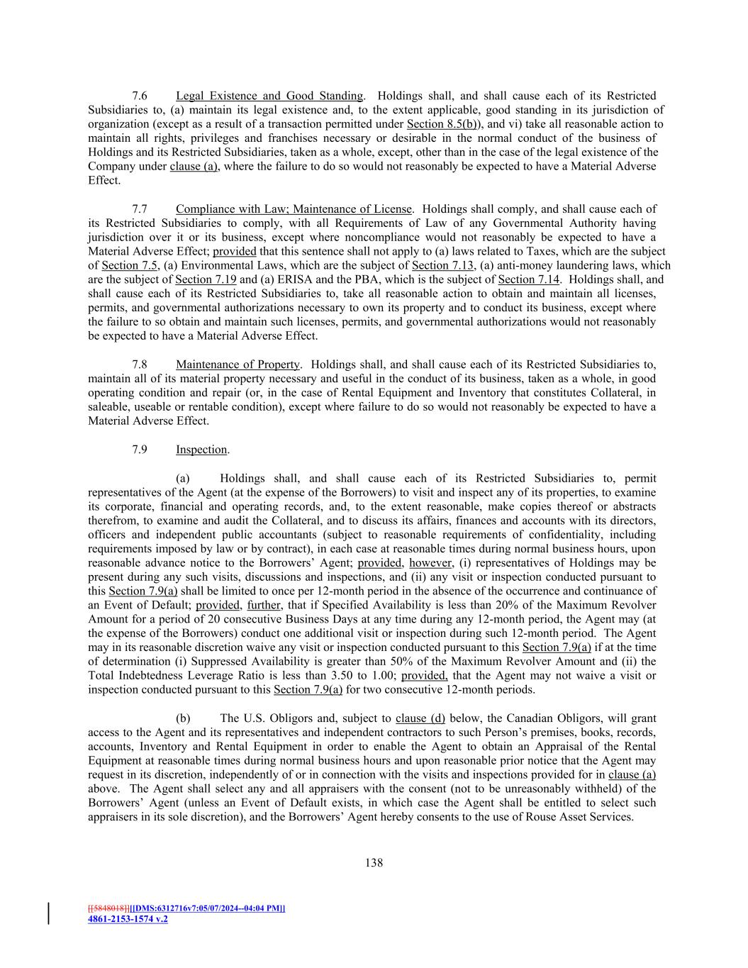 7.6 Legal Existence and Good Standing. Holdings shall, and shall cause each of its Restricted Subsidiaries to, (a) maintain its legal existence and, to the extent applicable, good standing in its jurisdiction of organization (except as a result of a transaction permitted under Section 8.5(b)), and vi) take all reasonable action to maintain all rights, privileges and franchises necessary or desirable in the normal conduct of the business of Holdings and its Restricted Subsidiaries, taken as a whole, except, other than in the case of the legal existence of the Company under clause (a), where the failure to do so would not reasonably be expected to have a Material Adverse Effect. 7.7 Compliance with Law; Maintenance of License. Holdings shall comply, and shall cause each of its Restricted Subsidiaries to comply, with all Requirements of Law of any Governmental Authority having jurisdiction over it or its business, except where noncompliance would not reasonably be expected to have a Material Adverse Effect; provided that this sentence shall not apply to (a) laws related to Taxes, which are the subject of Section 7.5, (a) Environmental Laws, which are the subject of Section 7.13, (a) anti-money laundering laws, which are the subject of Section 7.19 and (a) ERISA and the PBA, which is the subject of Section 7.14. Holdings shall, and shall cause each of its Restricted Subsidiaries to, take all reasonable action to obtain and maintain all licenses, permits, and governmental authorizations necessary to own its property and to conduct its business, except where the failure to so obtain and maintain such licenses, permits, and governmental authorizations would not reasonably be expected to have a Material Adverse Effect. 7.8 Maintenance of Property. Holdings shall, and shall cause each of its Restricted Subsidiaries to, maintain all of its material property necessary and useful in the conduct of its business, taken as a whole, in good operating condition and repair (or, in the case of Rental Equipment and Inventory that constitutes Collateral, in saleable, useable or rentable condition), except where failure to do so would not reasonably be expected to have a Material Adverse Effect. 7.9 Inspection. (a) Holdings shall, and shall cause each of its Restricted Subsidiaries to, permit representatives of the Agent (at the expense of the Borrowers) to visit and inspect any of its properties, to examine its corporate, financial and operating records, and, to the extent reasonable, make copies thereof or abstracts therefrom, to examine and audit the Collateral, and to discuss its affairs, finances and accounts with its directors, officers and independent public accountants (subject to reasonable requirements of confidentiality, including requirements imposed by law or by contract), in each case at reasonable times during normal business hours, upon reasonable advance notice to the Borrowers’ Agent; provided, however, (i) representatives of Holdings may be present during any such visits, discussions and inspections, and (ii) any visit or inspection conducted pursuant to this Section 7.9(a) shall be limited to once per 12-month period in the absence of the occurrence and continuance of an Event of Default; provided, further, that if Specified Availability is less than 20% of the Maximum Revolver Amount for a period of 20 consecutive Business Days at any time during any 12-month period, the Agent may (at the expense of the Borrowers) conduct one additional visit or inspection during such 12-month period. The Agent may in its reasonable discretion waive any visit or inspection conducted pursuant to this Section 7.9(a) if at the time of determination (i) Suppressed Availability is greater than 50% of the Maximum Revolver Amount and (ii) the Total Indebtedness Leverage Ratio is less than 3.50 to 1.00; provided, that the Agent may not waive a visit or inspection conducted pursuant to this Section 7.9(a) for two consecutive 12-month periods. (b) The U.S. Obligors and, subject to clause (d) below, the Canadian Obligors, will grant access to the Agent and its representatives and independent contractors to such Person’s premises, books, records, accounts, Inventory and Rental Equipment in order to enable the Agent to obtain an Appraisal of the Rental Equipment at reasonable times during normal business hours and upon reasonable prior notice that the Agent may request in its discretion, independently of or in connection with the visits and inspections provided for in clause (a) above. The Agent shall select any and all appraisers with the consent (not to be unreasonably withheld) of the Borrowers’ Agent (unless an Event of Default exists, in which case the Agent shall be entitled to select such appraisers in its sole discretion), and the Borrowers’ Agent hereby consents to the use of Rouse Asset Services. 138 [[5848018]][[DMS:6312716v7:05/07/2024--04:04 PM]] 4861-2153-1574 v.2