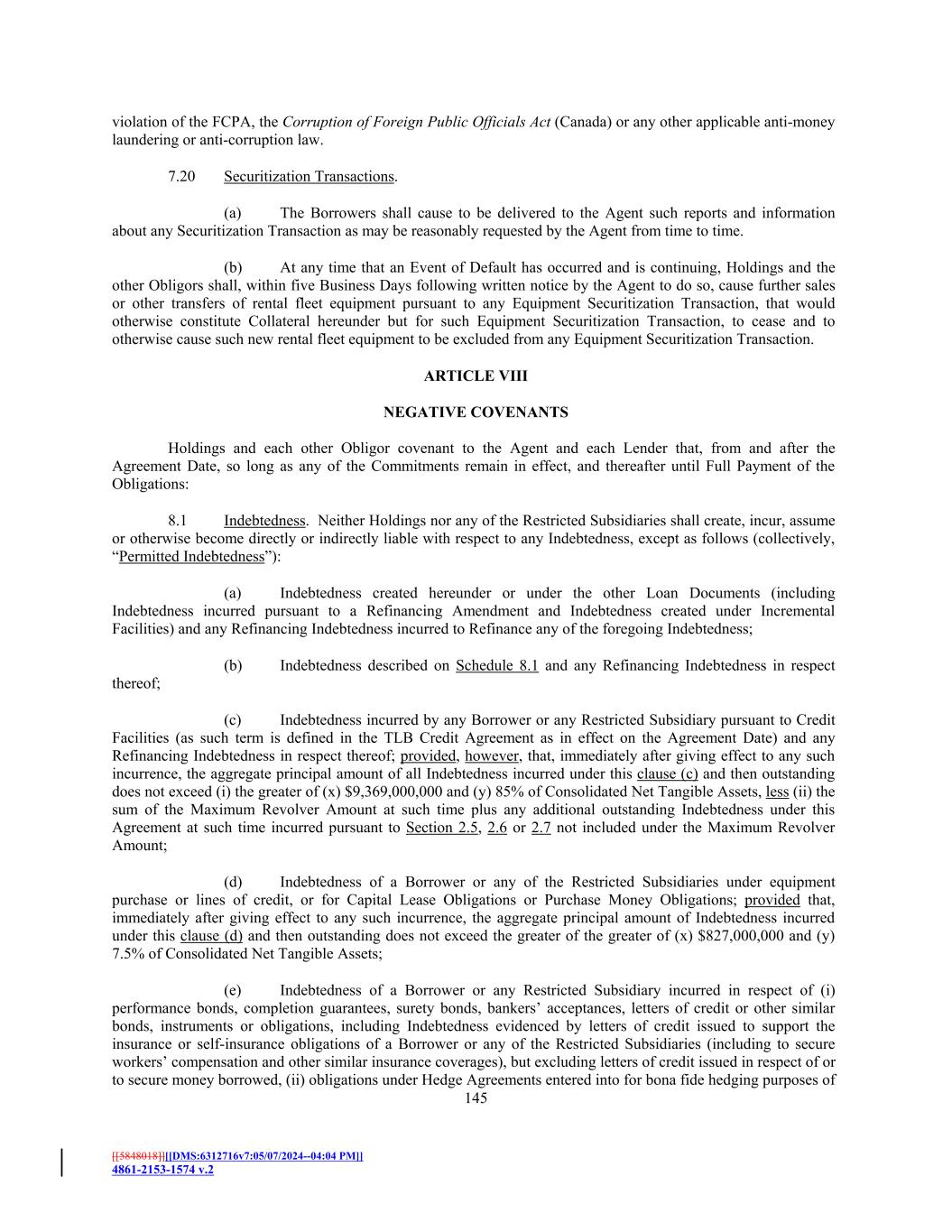 violation of the FCPA, the Corruption of Foreign Public Officials Act (Canada) or any other applicable anti-money laundering or anti-corruption law. 7.20 Securitization Transactions. (a) The Borrowers shall cause to be delivered to the Agent such reports and information about any Securitization Transaction as may be reasonably requested by the Agent from time to time. (b) At any time that an Event of Default has occurred and is continuing, Holdings and the other Obligors shall, within five Business Days following written notice by the Agent to do so, cause further sales or other transfers of rental fleet equipment pursuant to any Equipment Securitization Transaction, that would otherwise constitute Collateral hereunder but for such Equipment Securitization Transaction, to cease and to otherwise cause such new rental fleet equipment to be excluded from any Equipment Securitization Transaction. ARTICLE VIII NEGATIVE COVENANTS Holdings and each other Obligor covenant to the Agent and each Lender that, from and after the Agreement Date, so long as any of the Commitments remain in effect, and thereafter until Full Payment of the Obligations: 8.1 Indebtedness. Neither Holdings nor any of the Restricted Subsidiaries shall create, incur, assume or otherwise become directly or indirectly liable with respect to any Indebtedness, except as follows (collectively, “Permitted Indebtedness”): (a) Indebtedness created hereunder or under the other Loan Documents (including Indebtedness incurred pursuant to a Refinancing Amendment and Indebtedness created under Incremental Facilities) and any Refinancing Indebtedness incurred to Refinance any of the foregoing Indebtedness; (b) Indebtedness described on Schedule 8.1 and any Refinancing Indebtedness in respect thereof; (c) Indebtedness incurred by any Borrower or any Restricted Subsidiary pursuant to Credit Facilities (as such term is defined in the TLB Credit Agreement as in effect on the Agreement Date) and any Refinancing Indebtedness in respect thereof; provided, however, that, immediately after giving effect to any such incurrence, the aggregate principal amount of all Indebtedness incurred under this clause (c) and then outstanding does not exceed (i) the greater of (x) $9,369,000,000 and (y) 85% of Consolidated Net Tangible Assets, less (ii) the sum of the Maximum Revolver Amount at such time plus any additional outstanding Indebtedness under this Agreement at such time incurred pursuant to Section 2.5, 2.6 or 2.7 not included under the Maximum Revolver Amount; (d) Indebtedness of a Borrower or any of the Restricted Subsidiaries under equipment purchase or lines of credit, or for Capital Lease Obligations or Purchase Money Obligations; provided that, immediately after giving effect to any such incurrence, the aggregate principal amount of Indebtedness incurred under this clause (d) and then outstanding does not exceed the greater of the greater of (x) $827,000,000 and (y) 7.5% of Consolidated Net Tangible Assets; (e) Indebtedness of a Borrower or any Restricted Subsidiary incurred in respect of (i) performance bonds, completion guarantees, surety bonds, bankers’ acceptances, letters of credit or other similar bonds, instruments or obligations, including Indebtedness evidenced by letters of credit issued to support the insurance or self-insurance obligations of a Borrower or any of the Restricted Subsidiaries (including to secure workers’ compensation and other similar insurance coverages), but excluding letters of credit issued in respect of or to secure money borrowed, (ii) obligations under Hedge Agreements entered into for bona fide hedging purposes of 145 [[5848018]][[DMS:6312716v7:05/07/2024--04:04 PM]] 4861-2153-1574 v.2