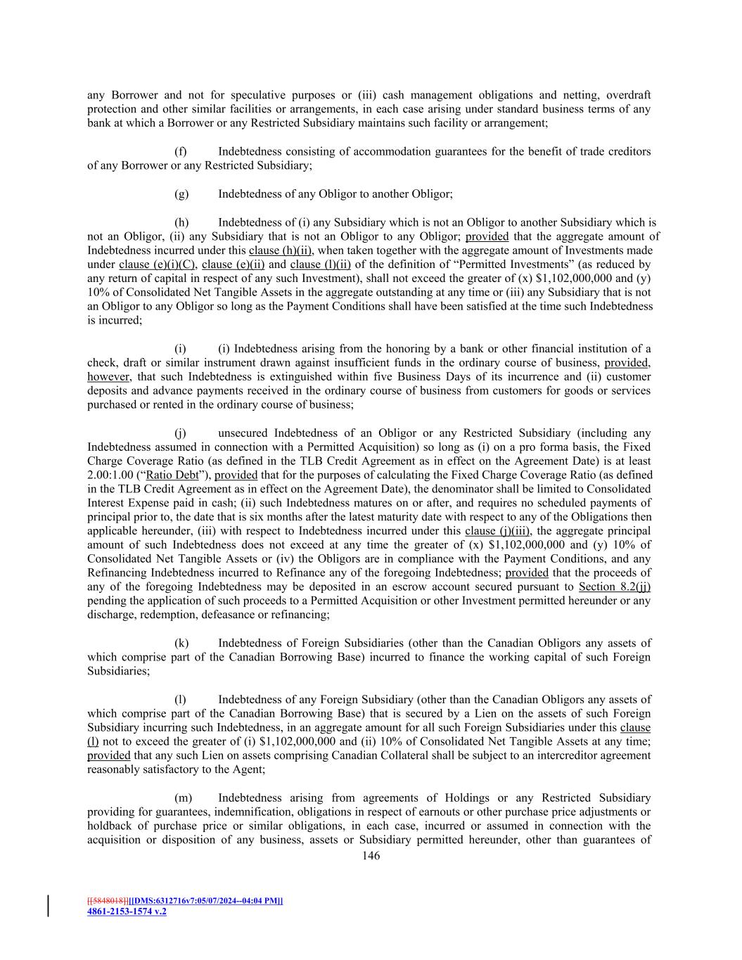 any Borrower and not for speculative purposes or (iii) cash management obligations and netting, overdraft protection and other similar facilities or arrangements, in each case arising under standard business terms of any bank at which a Borrower or any Restricted Subsidiary maintains such facility or arrangement; (f) Indebtedness consisting of accommodation guarantees for the benefit of trade creditors of any Borrower or any Restricted Subsidiary; (g) Indebtedness of any Obligor to another Obligor; (h) Indebtedness of (i) any Subsidiary which is not an Obligor to another Subsidiary which is not an Obligor, (ii) any Subsidiary that is not an Obligor to any Obligor; provided that the aggregate amount of Indebtedness incurred under this clause (h)(ii), when taken together with the aggregate amount of Investments made under clause (e)(i)(C), clause (e)(ii) and clause (l)(ii) of the definition of “Permitted Investments” (as reduced by any return of capital in respect of any such Investment), shall not exceed the greater of (x) $1,102,000,000 and (y) 10% of Consolidated Net Tangible Assets in the aggregate outstanding at any time or (iii) any Subsidiary that is not an Obligor to any Obligor so long as the Payment Conditions shall have been satisfied at the time such Indebtedness is incurred; (i) (i) Indebtedness arising from the honoring by a bank or other financial institution of a check, draft or similar instrument drawn against insufficient funds in the ordinary course of business, provided, however, that such Indebtedness is extinguished within five Business Days of its incurrence and (ii) customer deposits and advance payments received in the ordinary course of business from customers for goods or services purchased or rented in the ordinary course of business; (j) unsecured Indebtedness of an Obligor or any Restricted Subsidiary (including any Indebtedness assumed in connection with a Permitted Acquisition) so long as (i) on a pro forma basis, the Fixed Charge Coverage Ratio (as defined in the TLB Credit Agreement as in effect on the Agreement Date) is at least 2.00:1.00 (“Ratio Debt”), provided that for the purposes of calculating the Fixed Charge Coverage Ratio (as defined in the TLB Credit Agreement as in effect on the Agreement Date), the denominator shall be limited to Consolidated Interest Expense paid in cash; (ii) such Indebtedness matures on or after, and requires no scheduled payments of principal prior to, the date that is six months after the latest maturity date with respect to any of the Obligations then applicable hereunder, (iii) with respect to Indebtedness incurred under this clause (j)(iii), the aggregate principal amount of such Indebtedness does not exceed at any time the greater of (x) $1,102,000,000 and (y) 10% of Consolidated Net Tangible Assets or (iv) the Obligors are in compliance with the Payment Conditions, and any Refinancing Indebtedness incurred to Refinance any of the foregoing Indebtedness; provided that the proceeds of any of the foregoing Indebtedness may be deposited in an escrow account secured pursuant to Section 8.2(jj) pending the application of such proceeds to a Permitted Acquisition or other Investment permitted hereunder or any discharge, redemption, defeasance or refinancing; (k) Indebtedness of Foreign Subsidiaries (other than the Canadian Obligors any assets of which comprise part of the Canadian Borrowing Base) incurred to finance the working capital of such Foreign Subsidiaries; (l) Indebtedness of any Foreign Subsidiary (other than the Canadian Obligors any assets of which comprise part of the Canadian Borrowing Base) that is secured by a Lien on the assets of such Foreign Subsidiary incurring such Indebtedness, in an aggregate amount for all such Foreign Subsidiaries under this clause (l) not to exceed the greater of (i) $1,102,000,000 and (ii) 10% of Consolidated Net Tangible Assets at any time; provided that any such Lien on assets comprising Canadian Collateral shall be subject to an intercreditor agreement reasonably satisfactory to the Agent; (m) Indebtedness arising from agreements of Holdings or any Restricted Subsidiary providing for guarantees, indemnification, obligations in respect of earnouts or other purchase price adjustments or holdback of purchase price or similar obligations, in each case, incurred or assumed in connection with the acquisition or disposition of any business, assets or Subsidiary permitted hereunder, other than guarantees of 146 [[5848018]][[DMS:6312716v7:05/07/2024--04:04 PM]] 4861-2153-1574 v.2