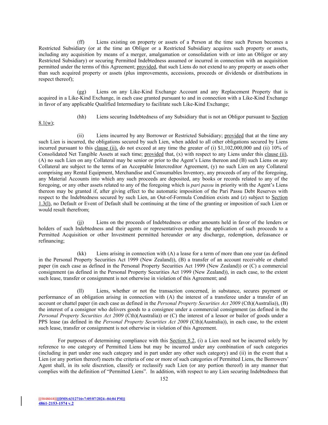 (ff) Liens existing on property or assets of a Person at the time such Person becomes a Restricted Subsidiary (or at the time an Obligor or a Restricted Subsidiary acquires such property or assets, including any acquisition by means of a merger, amalgamation or consolidation with or into an Obligor or any Restricted Subsidiary) or securing Permitted Indebtedness assumed or incurred in connection with an acquisition permitted under the terms of this Agreement; provided, that such Liens do not extend to any property or assets other than such acquired property or assets (plus improvements, accessions, proceeds or dividends or distributions in respect thereof); (gg) Liens on any Like-Kind Exchange Account and any Replacement Property that is acquired in a Like-Kind Exchange, in each case granted pursuant to and in connection with a Like-Kind Exchange in favor of any applicable Qualified Intermediary to facilitate such Like-Kind Exchange; (hh) Liens securing Indebtedness of any Subsidiary that is not an Obligor pursuant to Section 8.1(w); (ii) Liens incurred by any Borrower or Restricted Subsidiary; provided that at the time any such Lien is incurred, the obligations secured by such Lien, when added to all other obligations secured by Liens incurred pursuant to this clause (ii), do not exceed at any time the greater of (i) $1,102,000,000 and (ii) 10% of Consolidated Net Tangible Assets at such time; provided that, (x) with respect to any Liens under this clause (ii), (A) no such Lien on any Collateral may be senior or prior to the Agent’s Liens thereon and (B) such Liens on any Collateral are subject to the terms of an Acceptable Intercreditor Agreement, (y) no such Lien on any Collateral comprising any Rental Equipment, Merchandise and Consumables Inventory, any proceeds of any of the foregoing, any Material Accounts into which any such proceeds are deposited, any books or records related to any of the foregoing, or any other assets related to any of the foregoing which is pari passu in priority with the Agent’s Liens thereon may be granted if, after giving effect to the automatic imposition of the Pari Passu Debt Reserves with respect to the Indebtedness secured by such Lien, an Out-of-Formula Condition exists and (z) subject to Section 1.3(l), no Default or Event of Default shall be continuing at the time of the granting or imposition of such Lien or would result therefrom; (jj) Liens on the proceeds of Indebtedness or other amounts held in favor of the lenders or holders of such Indebtedness and their agents or representatives pending the application of such proceeds to a Permitted Acquisition or other Investment permitted hereunder or any discharge, redemption, defeasance or refinancing; (kk) Liens arising in connection with (A) a lease for a term of more than one year (as defined in the Personal Property Securities Act 1999 (New Zealand)), (B) a transfer of an account receivable or chattel paper (in each case as defined in the Personal Property Securities Act 1999 (New Zealand)) or (C) a commercial consignment (as defined in the Personal Property Securities Act 1999 (New Zealand)), in each case, to the extent such lease, transfer or consignment is not otherwise in violation of this Agreement; and (ll) Liens, whether or not the transaction concerned, in substance, secures payment or performance of an obligation arising in connection with (A) the interest of a transferee under a transfer of an account or chattel paper (in each case as defined in the Personal Property Securities Act 2009 (Cth)(Australia)), (B) the interest of a consignor who delivers goods to a consignee under a commercial consignment (as defined in the Personal Property Securities Act 2009 (Cth)(Australia)) or (C) the interest of a lessor or bailor of goods under a PPS lease (as defined in the Personal Property Securities Act 2009 (Cth)(Australia)), in each case, to the extent such lease, transfer or consignment is not otherwise in violation of this Agreement. For purposes of determining compliance with this Section 8.2, (i) a Lien need not be incurred solely by reference to one category of Permitted Liens but may be incurred under any combination of such categories (including in part under one such category and in part under any other such category) and (ii) in the event that a Lien (or any portion thereof) meets the criteria of one or more of such categories of Permitted Liens, the Borrowers’ Agent shall, in its sole discretion, classify or reclassify such Lien (or any portion thereof) in any manner that complies with the definition of “Permitted Liens”. In addition, with respect to any Lien securing Indebtedness that 152 [[5848018]][[DMS:6312716v7:05/07/2024--04:04 PM]] 4861-2153-1574 v.2