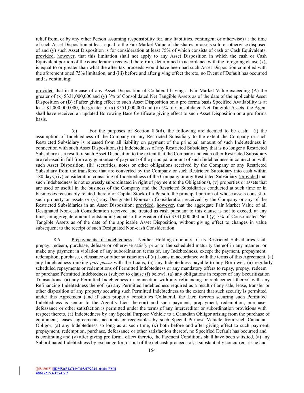 relief from, or by any other Person assuming responsibility for, any liabilities, contingent or otherwise) at the time of such Asset Disposition at least equal to the Fair Market Value of the shares or assets sold or otherwise disposed of and (y) such Asset Disposition is for consideration at least 75% of which consists of cash or Cash Equivalents; provided, however, that this limitation shall not apply to any Asset Disposition in which the cash or Cash Equivalent portion of the consideration received therefrom, determined in accordance with the foregoing clause (x), is equal to or greater than what the after-tax proceeds would have been had such Asset Disposition complied with the aforementioned 75% limitation, and (iii) before and after giving effect thereto, no Event of Default has occurred and is continuing; provided that in the case of any Asset Disposition of Collateral having a Fair Market Value exceeding (A) the greater of (x) $331,000,000 and (y) 3% of Consolidated Net Tangible Assets as of the date of the applicable Asset Disposition or (B) if after giving effect to such Asset Disposition on a pro forma basis Specified Availability is at least $1,000,000,000, the greater of (x) $551,000,000 and (y) 5% of Consolidated Net Tangible Assets, the Agent shall have received an updated Borrowing Base Certificate giving effect to such Asset Disposition on a pro forma basis. (e) For the purposes of Section 8.5(d), the following are deemed to be cash: (i) the assumption of Indebtedness of the Company or any Restricted Subsidiary to the extent the Company or such Restricted Subsidiary is released from all liability on payment of the principal amount of such Indebtedness in connection with such Asset Disposition, (ii) Indebtedness of any Restricted Subsidiary that is no longer a Restricted Subsidiary as a result of such Asset Disposition to the extent that the Company and each other Restricted Subsidiary are released in full from any guarantee of payment of the principal amount of such Indebtedness in connection with such Asset Disposition, (iii) securities, notes or other obligations received by the Company or any Restricted Subsidiary from the transferee that are converted by the Company or such Restricted Subsidiary into cash within 180 days, (iv) consideration consisting of Indebtedness of the Company or any Restricted Subsidiary (provided that such Indebtedness is not expressly subordinated in right of payment to the Obligations), (v) properties or assets that are used or useful in the business of the Company and the Restricted Subsidiaries conducted at such time or in businesses reasonably related thereto or Capital Stock of a Person, the principal portion of whose assets consist of such property or assets or (vi) any Designated Non-cash Consideration received by the Company or any of the Restricted Subsidiaries in an Asset Disposition; provided, however, that the aggregate Fair Market Value of all Designated Non-cash Consideration received and treated as cash pursuant to this clause is not to exceed, at any time, an aggregate amount outstanding equal to the greater of (x) $331,000,000 and (y) 3% of Consolidated Net Tangible Assets as of the date of the applicable Asset Disposition, without giving effect to changes in value subsequent to the receipt of such Designated Non-cash Consideration. 8.6 Prepayments of Indebtedness. Neither Holdings nor any of its Restricted Subsidiaries shall prepay, redeem, purchase, defease or otherwise satisfy prior to the scheduled maturity thereof in any manner, or make any payment in violation of any subordination terms of, any Indebtedness, except the payment, prepayment, redemption, purchase, defeasance or other satisfaction of (a) Loans in accordance with the terms of this Agreement, (a) any Indebtedness ranking pari passu with the Loans, (a) any Indebtedness payable to any Borrower, (a) regularly scheduled repayments or redemptions of Permitted Indebtedness or any mandatory offers to repay, prepay, redeem or purchase Permitted Indebtedness (subject to clause (f) below), (a) any obligations in respect of any Securitization Transactions, (a) any Permitted Indebtedness in connection with any refinancing or replacement thereof with any Refinancing Indebtedness thereof, (a) any Permitted Indebtedness required as a result of any sale, lease, transfer or other disposition of any property securing such Permitted Indebtedness to the extent that such security is permitted under this Agreement (and if such property constitutes Collateral, the Lien thereon securing such Permitted Indebtedness is senior to the Agent’s Lien thereon) and such payment, prepayment, redemption, purchase, defeasance or other satisfaction is permitted under the terms of any intercreditor or subordination provisions with respect thereto, (a) Indebtedness by any Special Purpose Vehicle to a Canadian Obligor arising from the purchase of equipment, leases, agreements, accounts or receivables by such Special Purpose Vehicle from such Canadian Obligor, (a) any Indebtedness so long as at such time, (x) both before and after giving effect to such payment, prepayment, redemption, purchase, defeasance or other satisfaction thereof, no Specified Default has occurred and is continuing and (y) after giving pro forma effect thereto, the Payment Conditions shall have been satisfied, (a) any Subordinated Indebtedness by exchange for, or out of the net cash proceeds of, a substantially concurrent issue and 154 [[5848018]][[DMS:6312716v7:05/07/2024--04:04 PM]] 4861-2153-1574 v.2