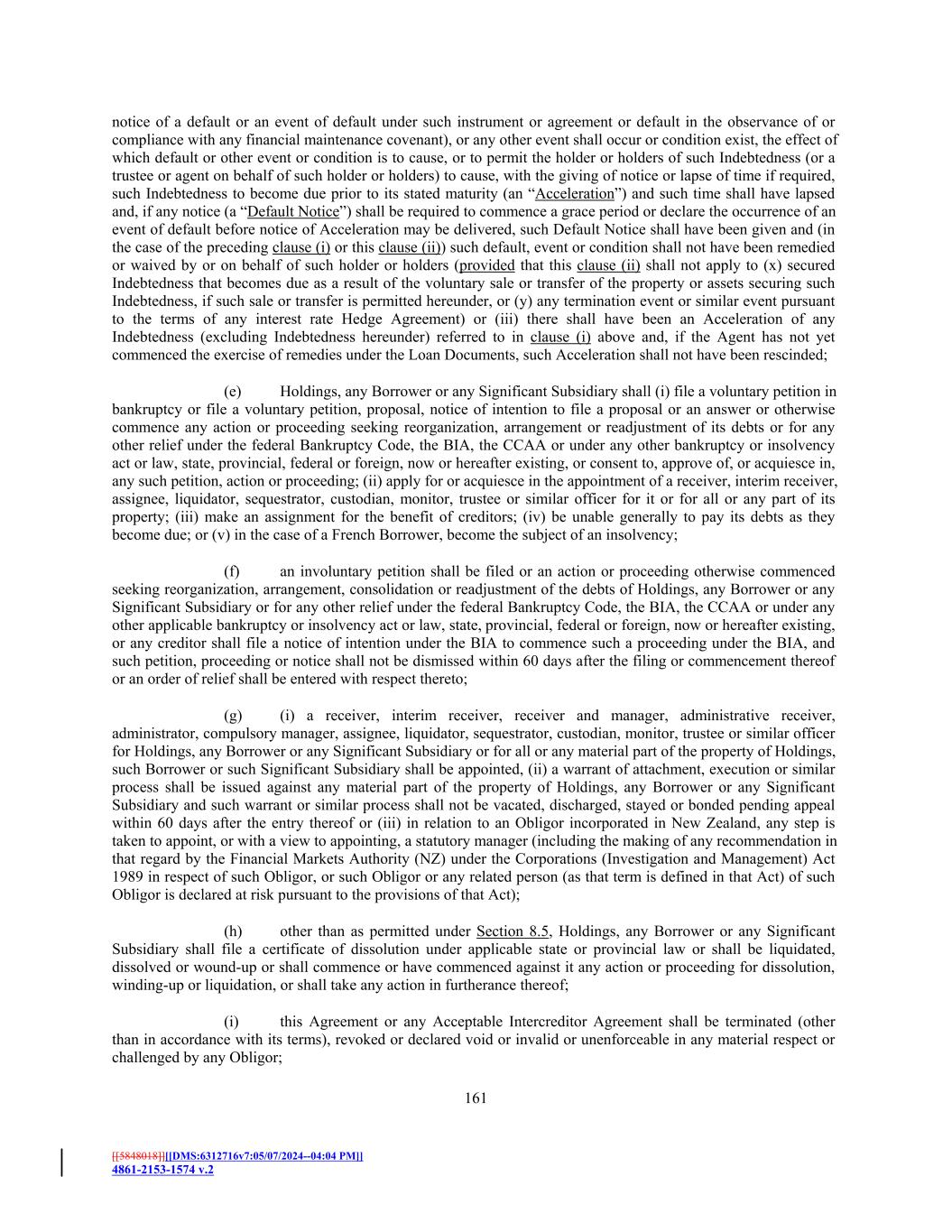 notice of a default or an event of default under such instrument or agreement or default in the observance of or compliance with any financial maintenance covenant), or any other event shall occur or condition exist, the effect of which default or other event or condition is to cause, or to permit the holder or holders of such Indebtedness (or a trustee or agent on behalf of such holder or holders) to cause, with the giving of notice or lapse of time if required, such Indebtedness to become due prior to its stated maturity (an “Acceleration”) and such time shall have lapsed and, if any notice (a “Default Notice”) shall be required to commence a grace period or declare the occurrence of an event of default before notice of Acceleration may be delivered, such Default Notice shall have been given and (in the case of the preceding clause (i) or this clause (ii)) such default, event or condition shall not have been remedied or waived by or on behalf of such holder or holders (provided that this clause (ii) shall not apply to (x) secured Indebtedness that becomes due as a result of the voluntary sale or transfer of the property or assets securing such Indebtedness, if such sale or transfer is permitted hereunder, or (y) any termination event or similar event pursuant to the terms of any interest rate Hedge Agreement) or (iii) there shall have been an Acceleration of any Indebtedness (excluding Indebtedness hereunder) referred to in clause (i) above and, if the Agent has not yet commenced the exercise of remedies under the Loan Documents, such Acceleration shall not have been rescinded; (e) Holdings, any Borrower or any Significant Subsidiary shall (i) file a voluntary petition in bankruptcy or file a voluntary petition, proposal, notice of intention to file a proposal or an answer or otherwise commence any action or proceeding seeking reorganization, arrangement or readjustment of its debts or for any other relief under the federal Bankruptcy Code, the BIA, the CCAA or under any other bankruptcy or insolvency act or law, state, provincial, federal or foreign, now or hereafter existing, or consent to, approve of, or acquiesce in, any such petition, action or proceeding; (ii) apply for or acquiesce in the appointment of a receiver, interim receiver, assignee, liquidator, sequestrator, custodian, monitor, trustee or similar officer for it or for all or any part of its property; (iii) make an assignment for the benefit of creditors; (iv) be unable generally to pay its debts as they become due; or (v) in the case of a French Borrower, become the subject of an insolvency; (f) an involuntary petition shall be filed or an action or proceeding otherwise commenced seeking reorganization, arrangement, consolidation or readjustment of the debts of Holdings, any Borrower or any Significant Subsidiary or for any other relief under the federal Bankruptcy Code, the BIA, the CCAA or under any other applicable bankruptcy or insolvency act or law, state, provincial, federal or foreign, now or hereafter existing, or any creditor shall file a notice of intention under the BIA to commence such a proceeding under the BIA, and such petition, proceeding or notice shall not be dismissed within 60 days after the filing or commencement thereof or an order of relief shall be entered with respect thereto; (g) (i) a receiver, interim receiver, receiver and manager, administrative receiver, administrator, compulsory manager, assignee, liquidator, sequestrator, custodian, monitor, trustee or similar officer for Holdings, any Borrower or any Significant Subsidiary or for all or any material part of the property of Holdings, such Borrower or such Significant Subsidiary shall be appointed, (ii) a warrant of attachment, execution or similar process shall be issued against any material part of the property of Holdings, any Borrower or any Significant Subsidiary and such warrant or similar process shall not be vacated, discharged, stayed or bonded pending appeal within 60 days after the entry thereof or (iii) in relation to an Obligor incorporated in New Zealand, any step is taken to appoint, or with a view to appointing, a statutory manager (including the making of any recommendation in that regard by the Financial Markets Authority (NZ) under the Corporations (Investigation and Management) Act 1989 in respect of such Obligor, or such Obligor or any related person (as that term is defined in that Act) of such Obligor is declared at risk pursuant to the provisions of that Act); (h) other than as permitted under Section 8.5, Holdings, any Borrower or any Significant Subsidiary shall file a certificate of dissolution under applicable state or provincial law or shall be liquidated, dissolved or wound-up or shall commence or have commenced against it any action or proceeding for dissolution, winding-up or liquidation, or shall take any action in furtherance thereof; (i) this Agreement or any Acceptable Intercreditor Agreement shall be terminated (other than in accordance with its terms), revoked or declared void or invalid or unenforceable in any material respect or challenged by any Obligor; 161 [[5848018]][[DMS:6312716v7:05/07/2024--04:04 PM]] 4861-2153-1574 v.2