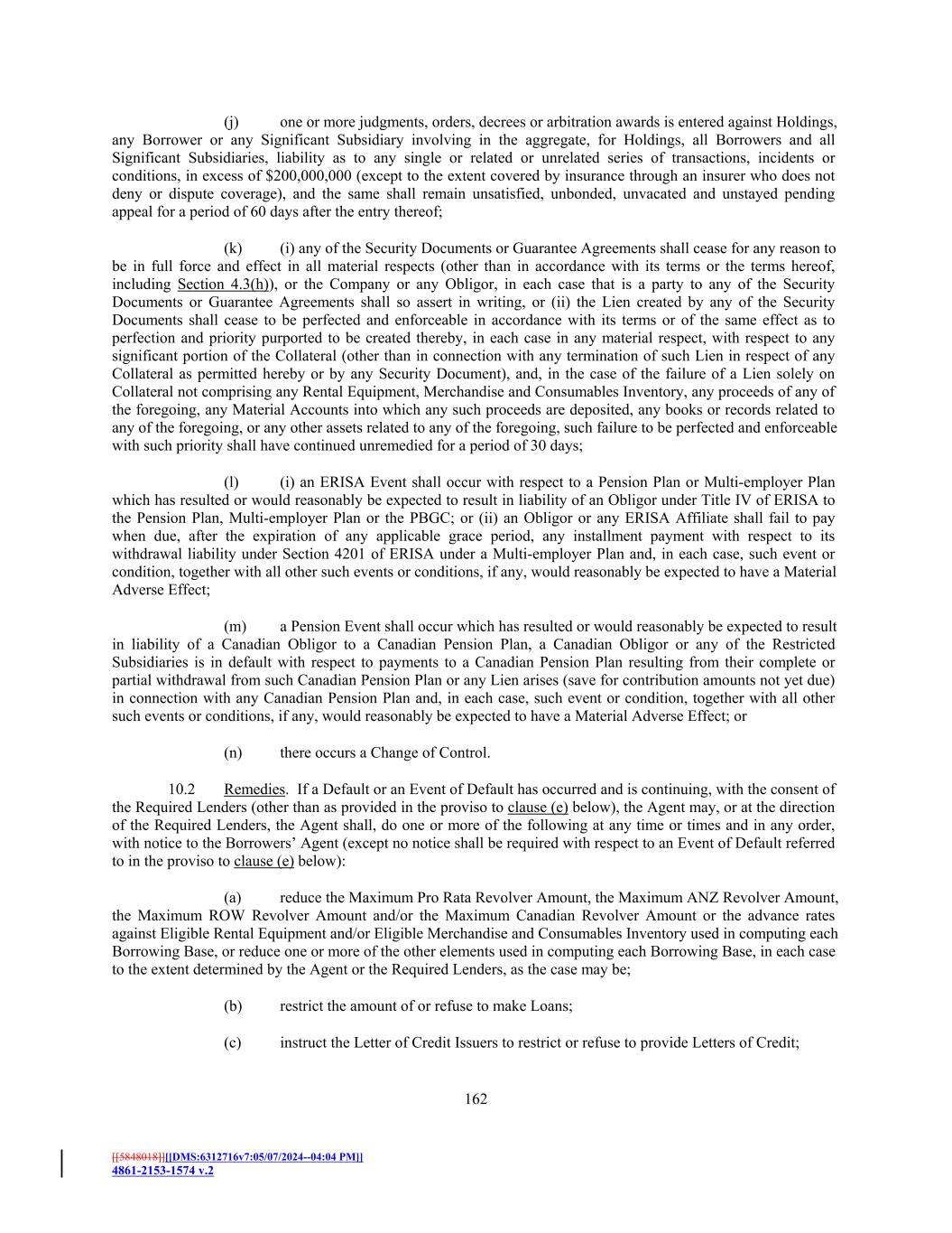 (j) one or more judgments, orders, decrees or arbitration awards is entered against Holdings, any Borrower or any Significant Subsidiary involving in the aggregate, for Holdings, all Borrowers and all Significant Subsidiaries, liability as to any single or related or unrelated series of transactions, incidents or conditions, in excess of $200,000,000 (except to the extent covered by insurance through an insurer who does not deny or dispute coverage), and the same shall remain unsatisfied, unbonded, unvacated and unstayed pending appeal for a period of 60 days after the entry thereof; (k) (i) any of the Security Documents or Guarantee Agreements shall cease for any reason to be in full force and effect in all material respects (other than in accordance with its terms or the terms hereof, including Section 4.3(h)), or the Company or any Obligor, in each case that is a party to any of the Security Documents or Guarantee Agreements shall so assert in writing, or (ii) the Lien created by any of the Security Documents shall cease to be perfected and enforceable in accordance with its terms or of the same effect as to perfection and priority purported to be created thereby, in each case in any material respect, with respect to any significant portion of the Collateral (other than in connection with any termination of such Lien in respect of any Collateral as permitted hereby or by any Security Document), and, in the case of the failure of a Lien solely on Collateral not comprising any Rental Equipment, Merchandise and Consumables Inventory, any proceeds of any of the foregoing, any Material Accounts into which any such proceeds are deposited, any books or records related to any of the foregoing, or any other assets related to any of the foregoing, such failure to be perfected and enforceable with such priority shall have continued unremedied for a period of 30 days; (l) (i) an ERISA Event shall occur with respect to a Pension Plan or Multi-employer Plan which has resulted or would reasonably be expected to result in liability of an Obligor under Title IV of ERISA to the Pension Plan, Multi-employer Plan or the PBGC; or (ii) an Obligor or any ERISA Affiliate shall fail to pay when due, after the expiration of any applicable grace period, any installment payment with respect to its withdrawal liability under Section 4201 of ERISA under a Multi-employer Plan and, in each case, such event or condition, together with all other such events or conditions, if any, would reasonably be expected to have a Material Adverse Effect; (m) a Pension Event shall occur which has resulted or would reasonably be expected to result in liability of a Canadian Obligor to a Canadian Pension Plan, a Canadian Obligor or any of the Restricted Subsidiaries is in default with respect to payments to a Canadian Pension Plan resulting from their complete or partial withdrawal from such Canadian Pension Plan or any Lien arises (save for contribution amounts not yet due) in connection with any Canadian Pension Plan and, in each case, such event or condition, together with all other such events or conditions, if any, would reasonably be expected to have a Material Adverse Effect; or (n) there occurs a Change of Control. 10.2 Remedies. If a Default or an Event of Default has occurred and is continuing, with the consent of the Required Lenders (other than as provided in the proviso to clause (e) below), the Agent may, or at the direction of the Required Lenders, the Agent shall, do one or more of the following at any time or times and in any order, with notice to the Borrowers’ Agent (except no notice shall be required with respect to an Event of Default referred to in the proviso to clause (e) below): (a) reduce the Maximum Pro Rata Revolver Amount, the Maximum ANZ Revolver Amount, the Maximum ROW Revolver Amount and/or the Maximum Canadian Revolver Amount or the advance rates against Eligible Rental Equipment and/or Eligible Merchandise and Consumables Inventory used in computing each Borrowing Base, or reduce one or more of the other elements used in computing each Borrowing Base, in each case to the extent determined by the Agent or the Required Lenders, as the case may be; (b) restrict the amount of or refuse to make Loans; (c) instruct the Letter of Credit Issuers to restrict or refuse to provide Letters of Credit; 162 [[5848018]][[DMS:6312716v7:05/07/2024--04:04 PM]] 4861-2153-1574 v.2
