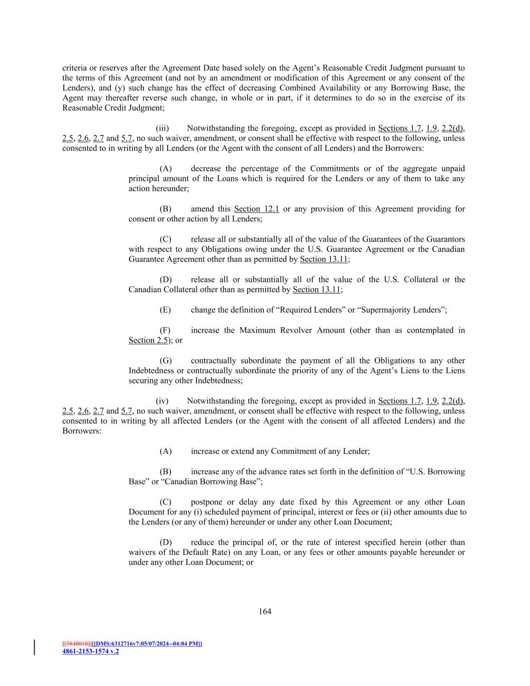 criteria or reserves after the Agreement Date based solely on the Agent’s Reasonable Credit Judgment pursuant to the terms of this Agreement (and not by an amendment or modification of this Agreement or any consent of the Lenders), and (y) such change has the effect of decreasing Combined Availability or any Borrowing Base, the Agent may thereafter reverse such change, in whole or in part, if it determines to do so in the exercise of its Reasonable Credit Judgment; (iii) Notwithstanding the foregoing, except as provided in Sections 1.7, 1.9, 2.2(d), 2.5, 2.6, 2.7 and 5.7, no such waiver, amendment, or consent shall be effective with respect to the following, unless consented to in writing by all Lenders (or the Agent with the consent of all Lenders) and the Borrowers: (A) decrease the percentage of the Commitments or of the aggregate unpaid principal amount of the Loans which is required for the Lenders or any of them to take any action hereunder; (B) amend this Section 12.1 or any provision of this Agreement providing for consent or other action by all Lenders; (C) release all or substantially all of the value of the Guarantees of the Guarantors with respect to any Obligations owing under the U.S. Guarantee Agreement or the Canadian Guarantee Agreement other than as permitted by Section 13.11; (D) release all or substantially all of the value of the U.S. Collateral or the Canadian Collateral other than as permitted by Section 13.11; (E) change the definition of “Required Lenders” or “Supermajority Lenders”; (F) increase the Maximum Revolver Amount (other than as contemplated in Section 2.5); or (G) contractually subordinate the payment of all the Obligations to any other Indebtedness or contractually subordinate the priority of any of the Agent’s Liens to the Liens securing any other Indebtedness; (iv) Notwithstanding the foregoing, except as provided in Sections 1.7, 1.9, 2.2(d), 2.5, 2.6, 2.7 and 5.7, no such waiver, amendment, or consent shall be effective with respect to the following, unless consented to in writing by all affected Lenders (or the Agent with the consent of all affected Lenders) and the Borrowers: (A) increase or extend any Commitment of any Lender; (B) increase any of the advance rates set forth in the definition of “U.S. Borrowing Base” or “Canadian Borrowing Base”; (C) postpone or delay any date fixed by this Agreement or any other Loan Document for any (i) scheduled payment of principal, interest or fees or (ii) other amounts due to the Lenders (or any of them) hereunder or under any other Loan Document; (D) reduce the principal of, or the rate of interest specified herein (other than waivers of the Default Rate) on any Loan, or any fees or other amounts payable hereunder or under any other Loan Document; or 164 [[5848018]][[DMS:6312716v7:05/07/2024--04:04 PM]] 4861-2153-1574 v.2