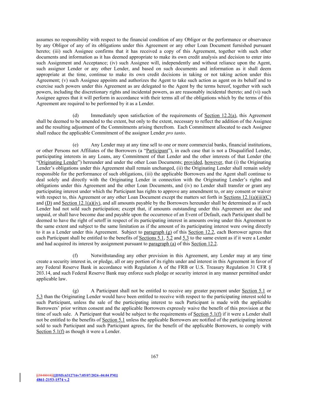 assumes no responsibility with respect to the financial condition of any Obligor or the performance or observance by any Obligor of any of its obligations under this Agreement or any other Loan Document furnished pursuant hereto; (iii) such Assignee confirms that it has received a copy of this Agreement, together with such other documents and information as it has deemed appropriate to make its own credit analysis and decision to enter into such Assignment and Acceptance; (iv) such Assignee will, independently and without reliance upon the Agent, such assignor Lender or any other Lender, and based on such documents and information as it shall deem appropriate at the time, continue to make its own credit decisions in taking or not taking action under this Agreement; (v) such Assignee appoints and authorizes the Agent to take such action as agent on its behalf and to exercise such powers under this Agreement as are delegated to the Agent by the terms hereof, together with such powers, including the discretionary rights and incidental powers, as are reasonably incidental thereto; and (vi) such Assignee agrees that it will perform in accordance with their terms all of the obligations which by the terms of this Agreement are required to be performed by it as a Lender. (d) Immediately upon satisfaction of the requirements of Section 12.2(a), this Agreement shall be deemed to be amended to the extent, but only to the extent, necessary to reflect the addition of the Assignee and the resulting adjustment of the Commitments arising therefrom. Each Commitment allocated to each Assignee shall reduce the applicable Commitment of the assignor Lender pro tanto. (e) Any Lender may at any time sell to one or more commercial banks, financial institutions, or other Persons not Affiliates of the Borrowers (a “Participant”), in each case that is not a Disqualified Lender, participating interests in any Loans, any Commitment of that Lender and the other interests of that Lender (the “Originating Lender”) hereunder and under the other Loan Documents; provided, however, that (i) the Originating Lender’s obligations under this Agreement shall remain unchanged, (ii) the Originating Lender shall remain solely responsible for the performance of such obligations, (iii) the applicable Borrowers and the Agent shall continue to deal solely and directly with the Originating Lender in connection with the Originating Lender’s rights and obligations under this Agreement and the other Loan Documents, and (iv) no Lender shall transfer or grant any participating interest under which the Participant has rights to approve any amendment to, or any consent or waiver with respect to, this Agreement or any other Loan Document except the matters set forth in Sections 12.1(a)(iii)(C) and (D) and Section 12.1(a)(iv), and all amounts payable by the Borrowers hereunder shall be determined as if such Lender had not sold such participation; except that, if amounts outstanding under this Agreement are due and unpaid, or shall have become due and payable upon the occurrence of an Event of Default, each Participant shall be deemed to have the right of setoff in respect of its participating interest in amounts owing under this Agreement to the same extent and subject to the same limitation as if the amount of its participating interest were owing directly to it as a Lender under this Agreement. Subject to paragraph (g) of this Section 12.2, each Borrower agrees that each Participant shall be entitled to the benefits of Sections 5.1, 5.2 and 5.3 to the same extent as if it were a Lender and had acquired its interest by assignment pursuant to paragraph (a) of this Section 12.2. (f) Notwithstanding any other provision in this Agreement, any Lender may at any time create a security interest in, or pledge, all or any portion of its rights under and interest in this Agreement in favor of any Federal Reserve Bank in accordance with Regulation A of the FRB or U.S. Treasury Regulation 31 CFR § 203.14, and such Federal Reserve Bank may enforce such pledge or security interest in any manner permitted under applicable law. (g) A Participant shall not be entitled to receive any greater payment under Section 5.1 or 5.3 than the Originating Lender would have been entitled to receive with respect to the participating interest sold to such Participant, unless the sale of the participating interest to such Participant is made with the applicable Borrowers’ prior written consent and the applicable Borrowers expressly waive the benefit of this provision at the time of such sale. A Participant that would be subject to the requirements of Section 5.1(f) if it were a Lender shall not be entitled to the benefits of Section 5.1 unless the applicable Borrowers are notified of the participating interest sold to such Participant and such Participant agrees, for the benefit of the applicable Borrowers, to comply with Section 5.1(f) as though it were a Lender. 167 [[5848018]][[DMS:6312716v7:05/07/2024--04:04 PM]] 4861-2153-1574 v.2